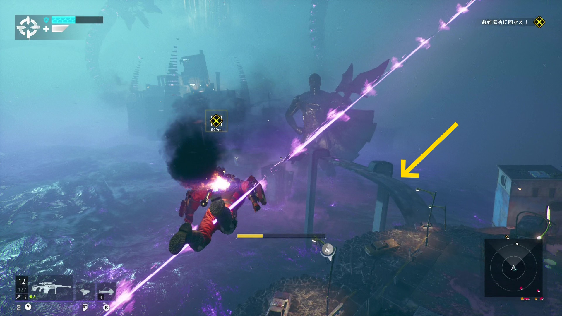 - スピードフォース1回では高架にたどり着けないため、空中で RB を長押ししてスピードフォースをもう一度行えばオーケー