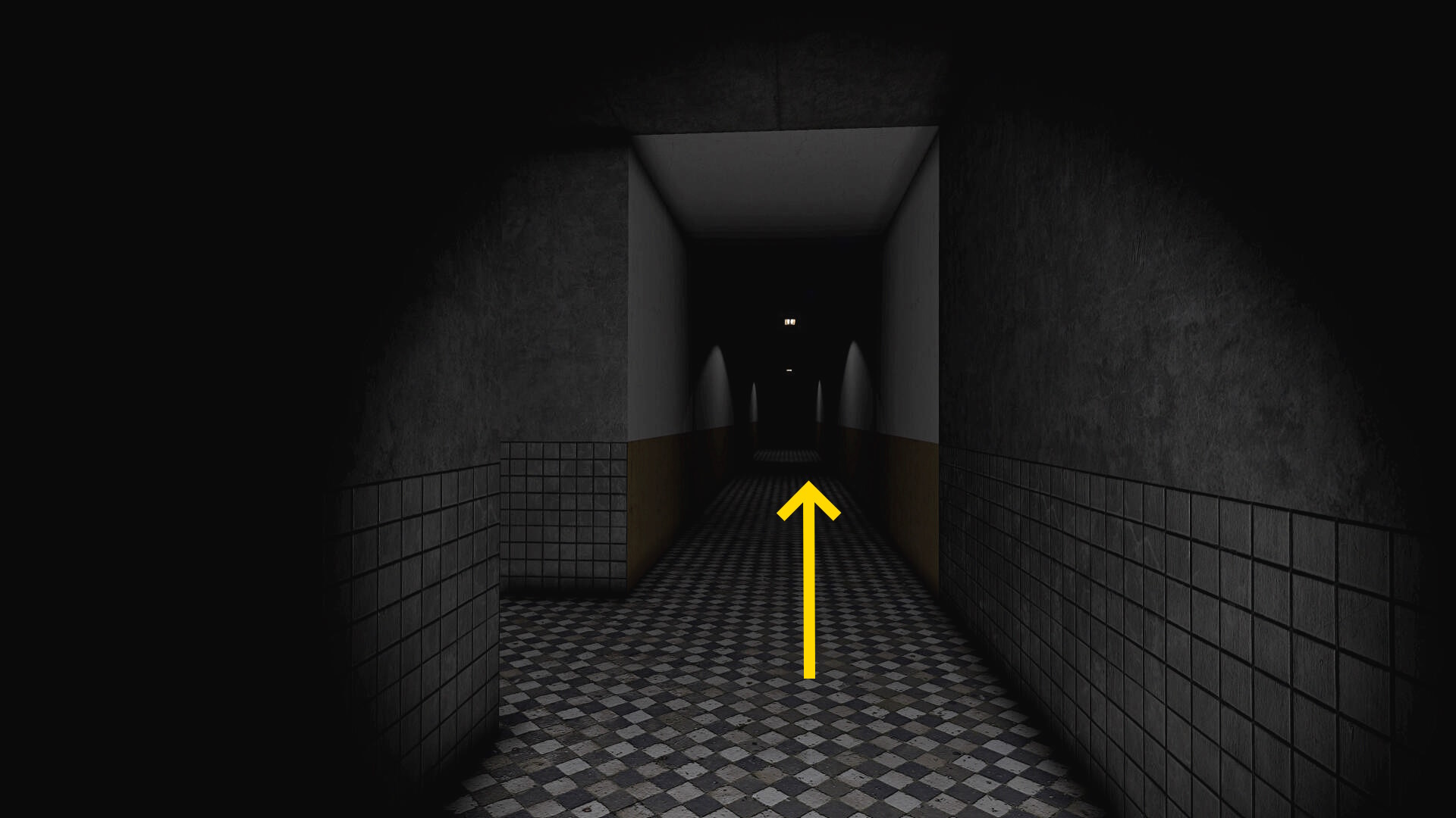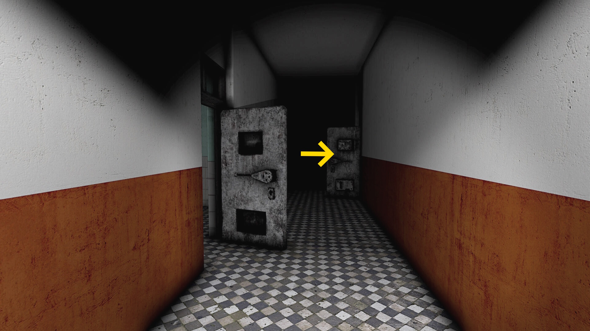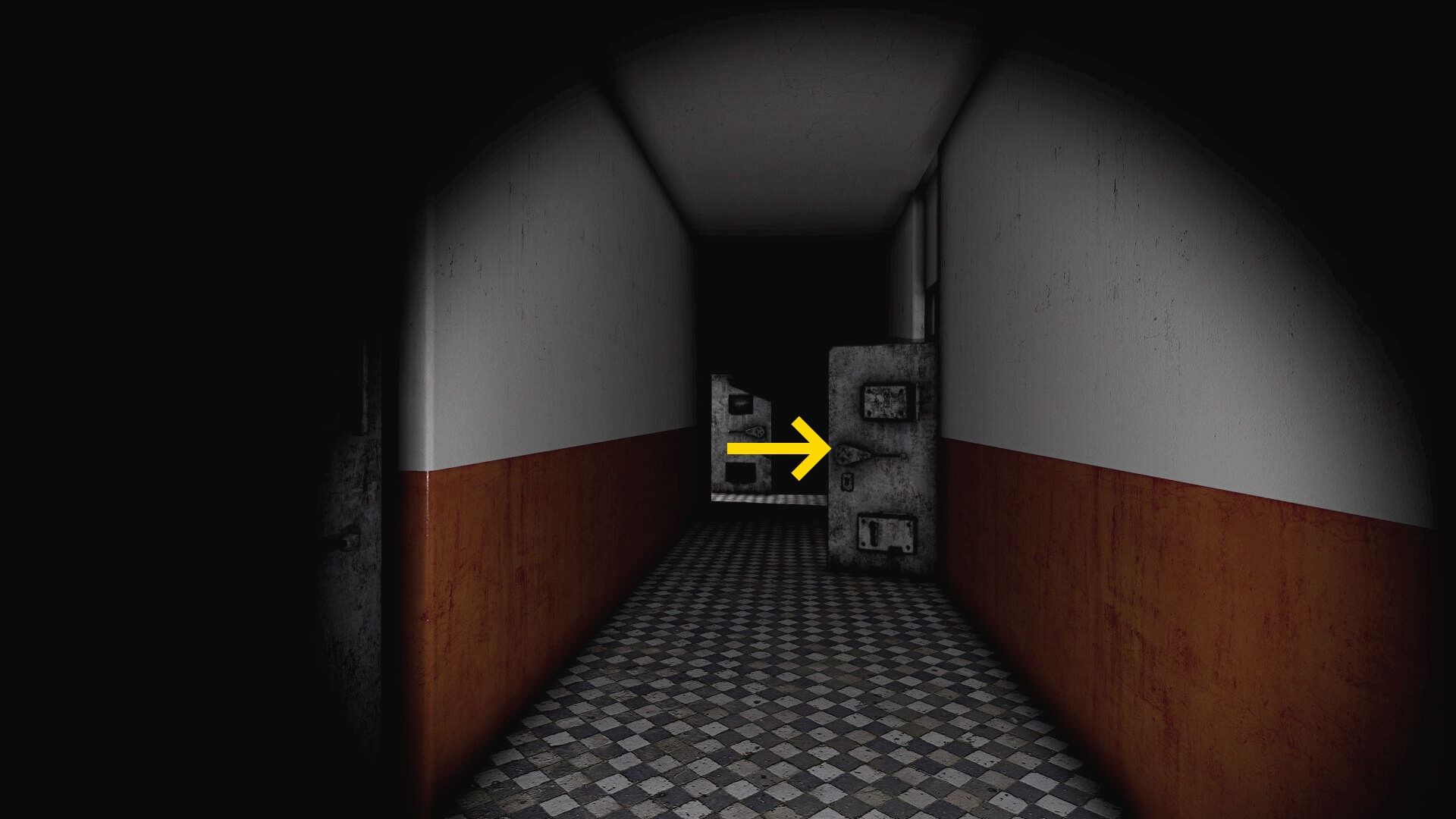 - 白と黄色の壁の廊下を進んでいく