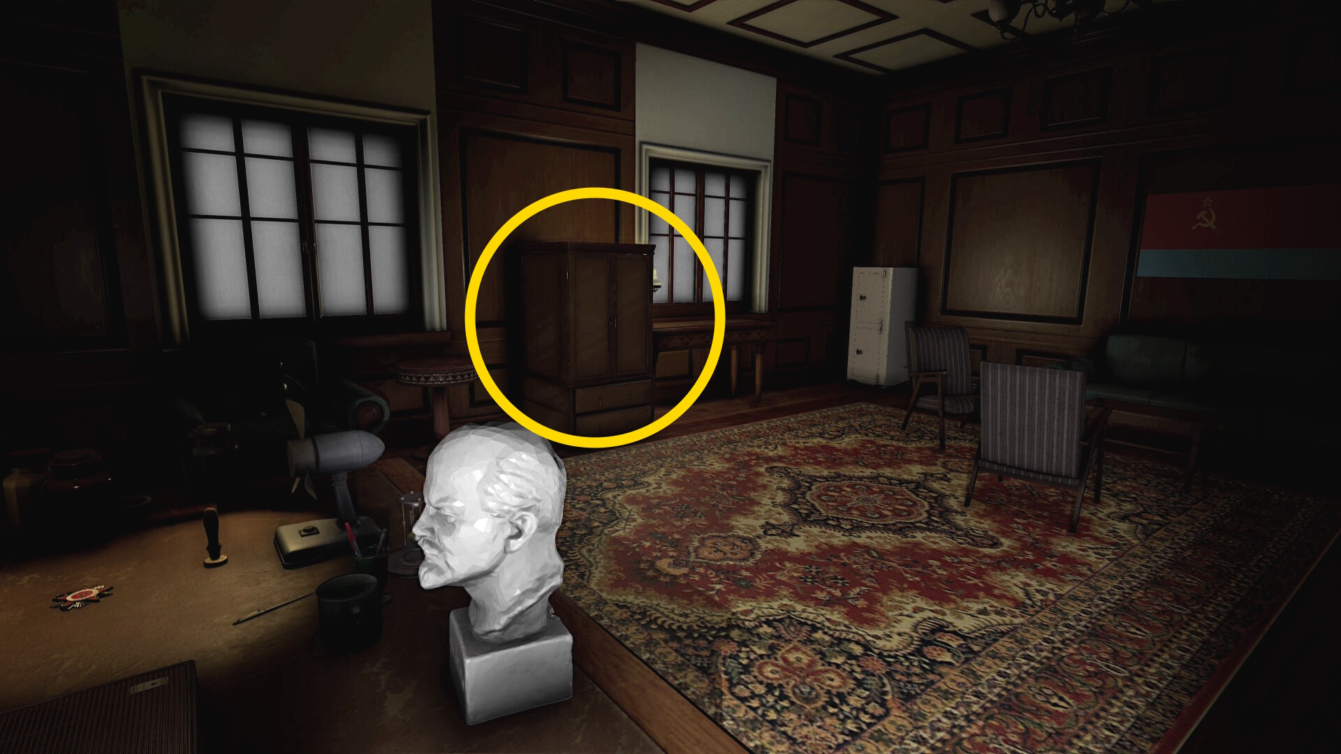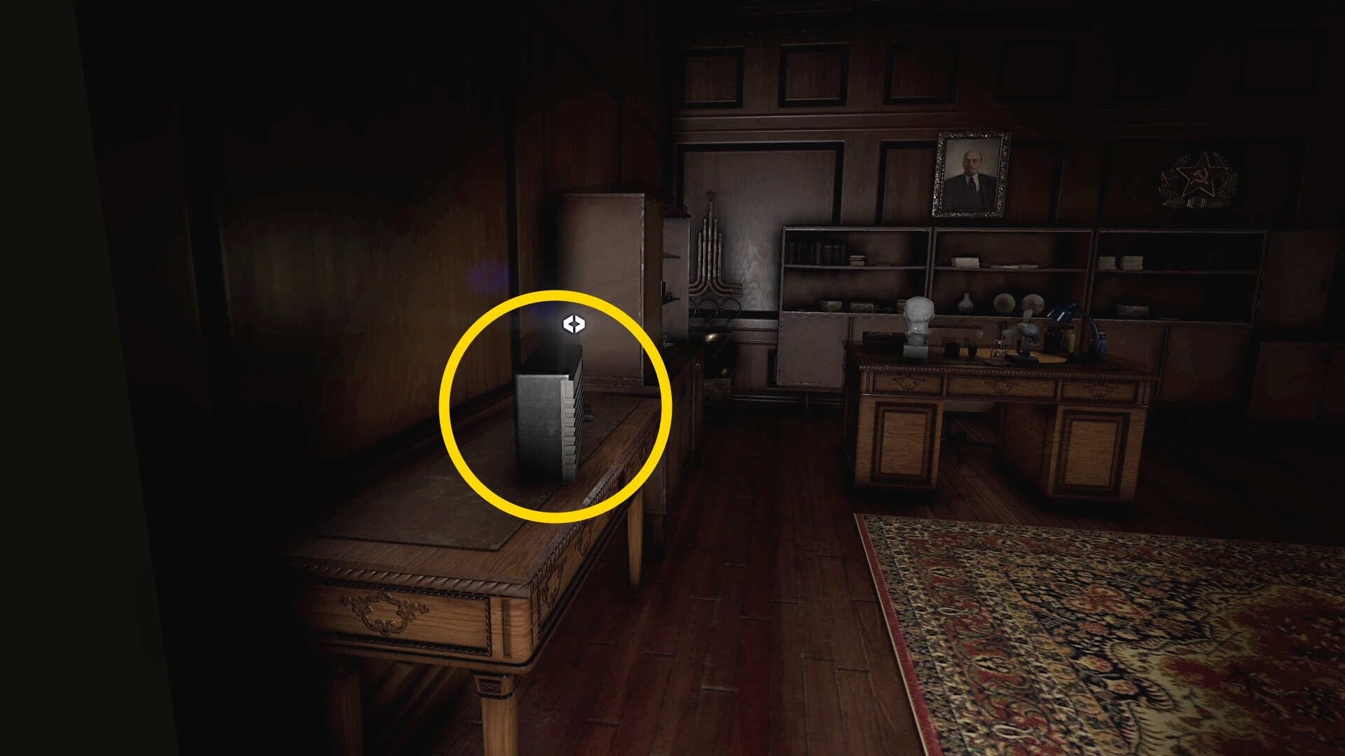 - 後ろを向き、戸棚の右側のテーブルに カセットテープ があるので回収