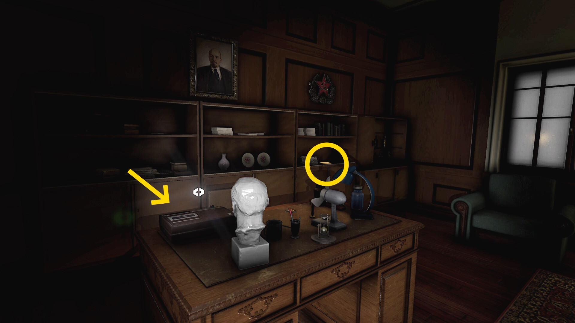 - 教授の机にテープレコーダーがあるので調べる(下画像矢印。カセットテープはこの後回収する)