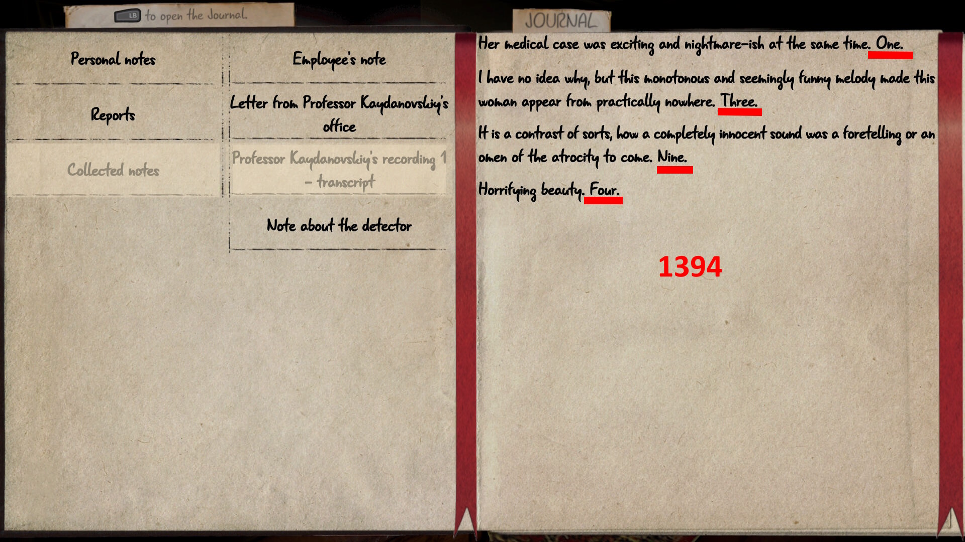 - 3つ目の「 Note from Professor Kaydanovskiy’s computer – the Mind Reader 」については Collected notes ではなく、Documentation – the Mind Reader and the Nadya Filter に記録される