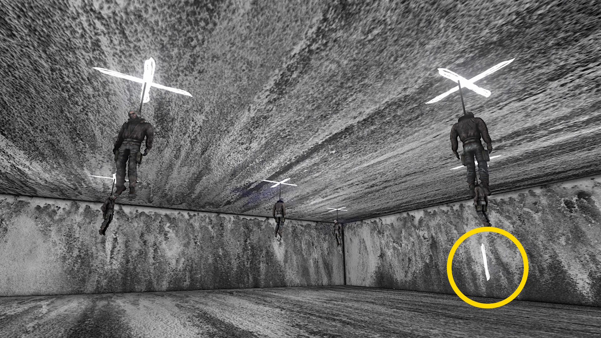 - 6箇所の光線をすべて X にしたら、仲間の遺体が自動的に吊り下げられる