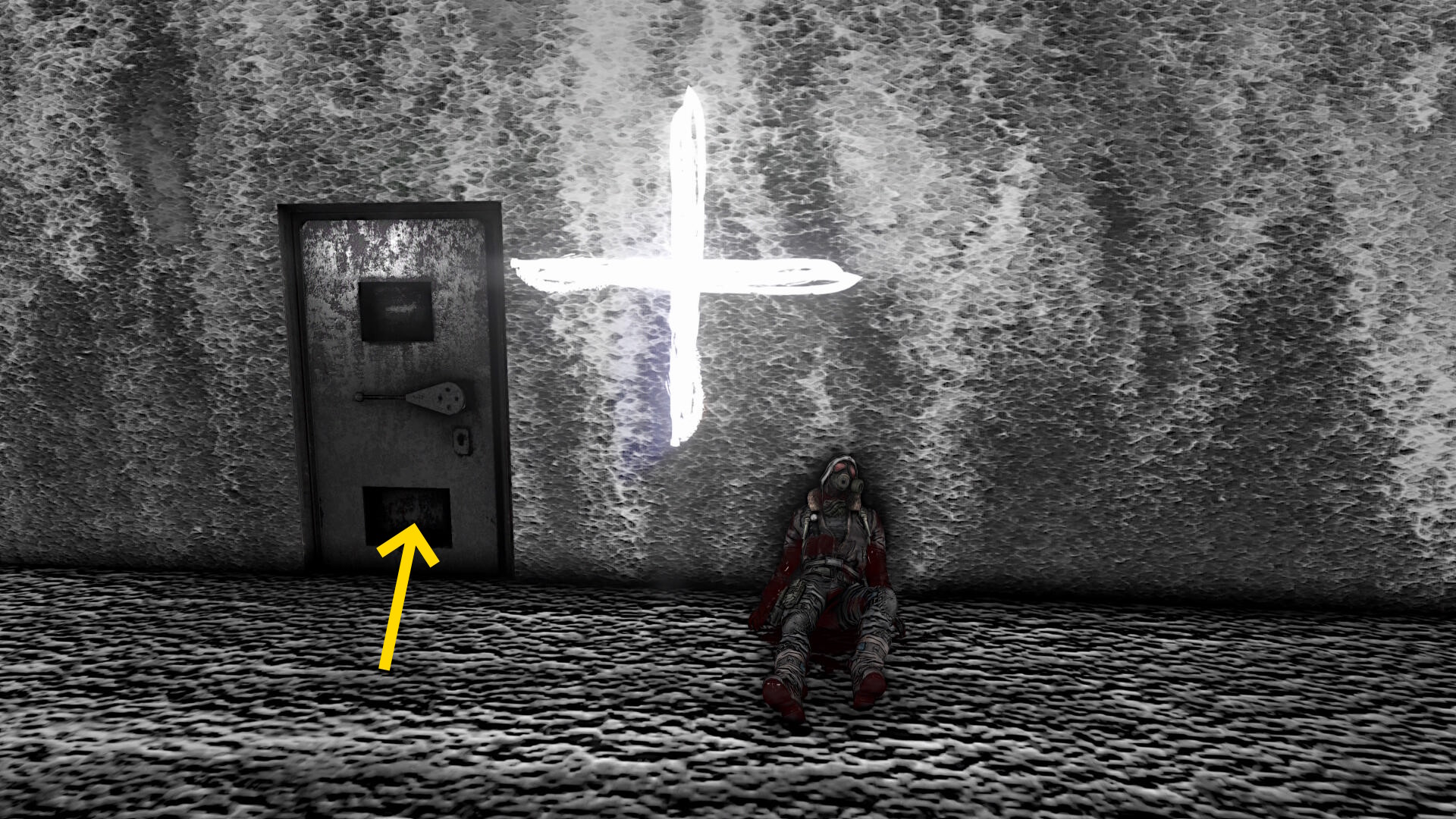 - 壁の光線に近づいて X にすると最後の遺体が出現するとともに左側にドアも出現する