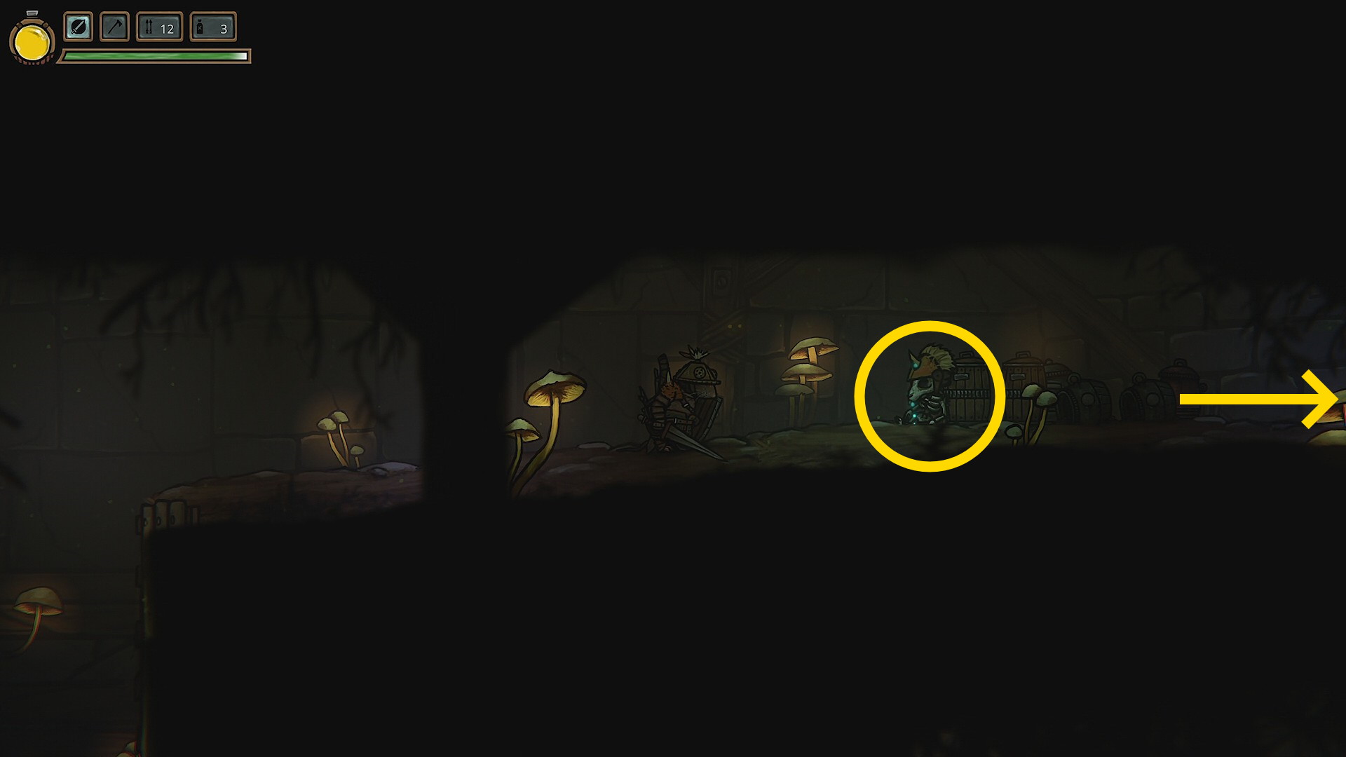 - 右端に進むと掘り起こせる場所があり、宝箱から 片手斧 を回収(装備しない)