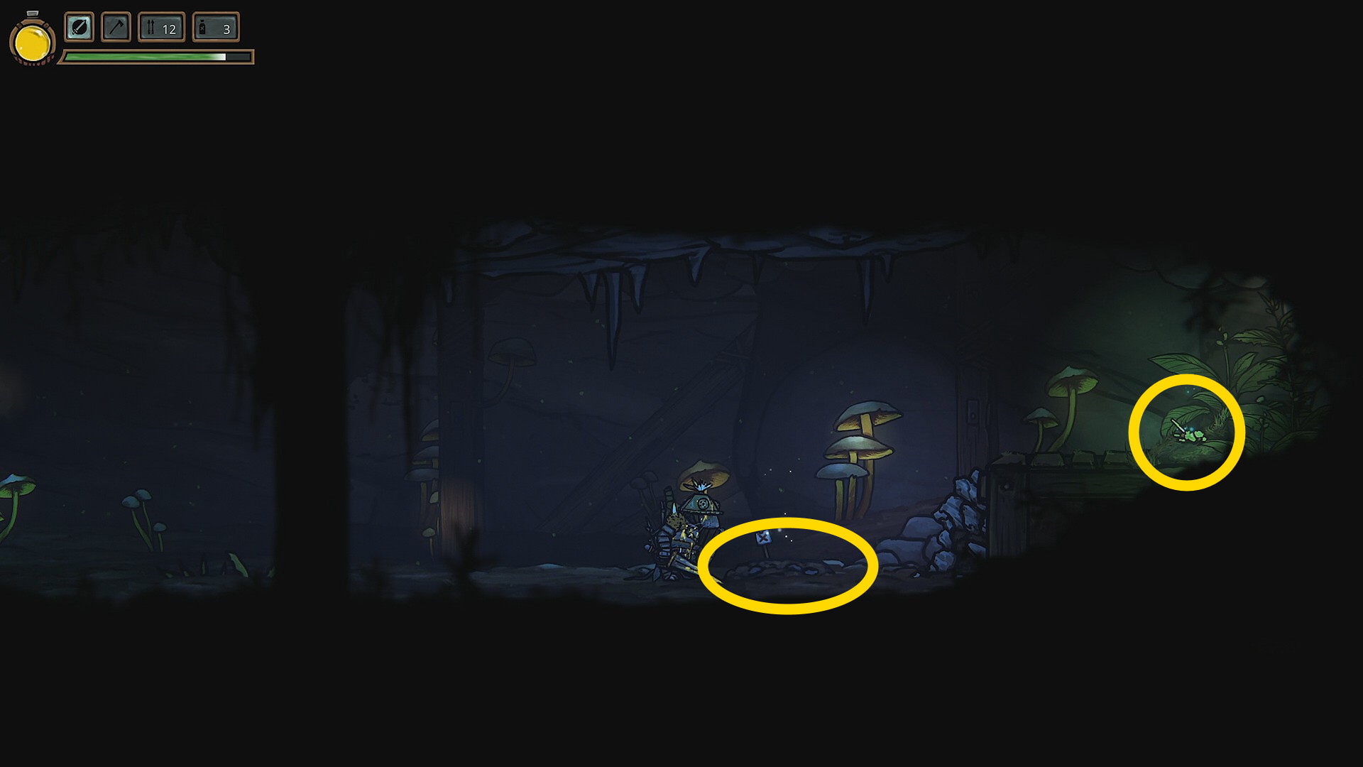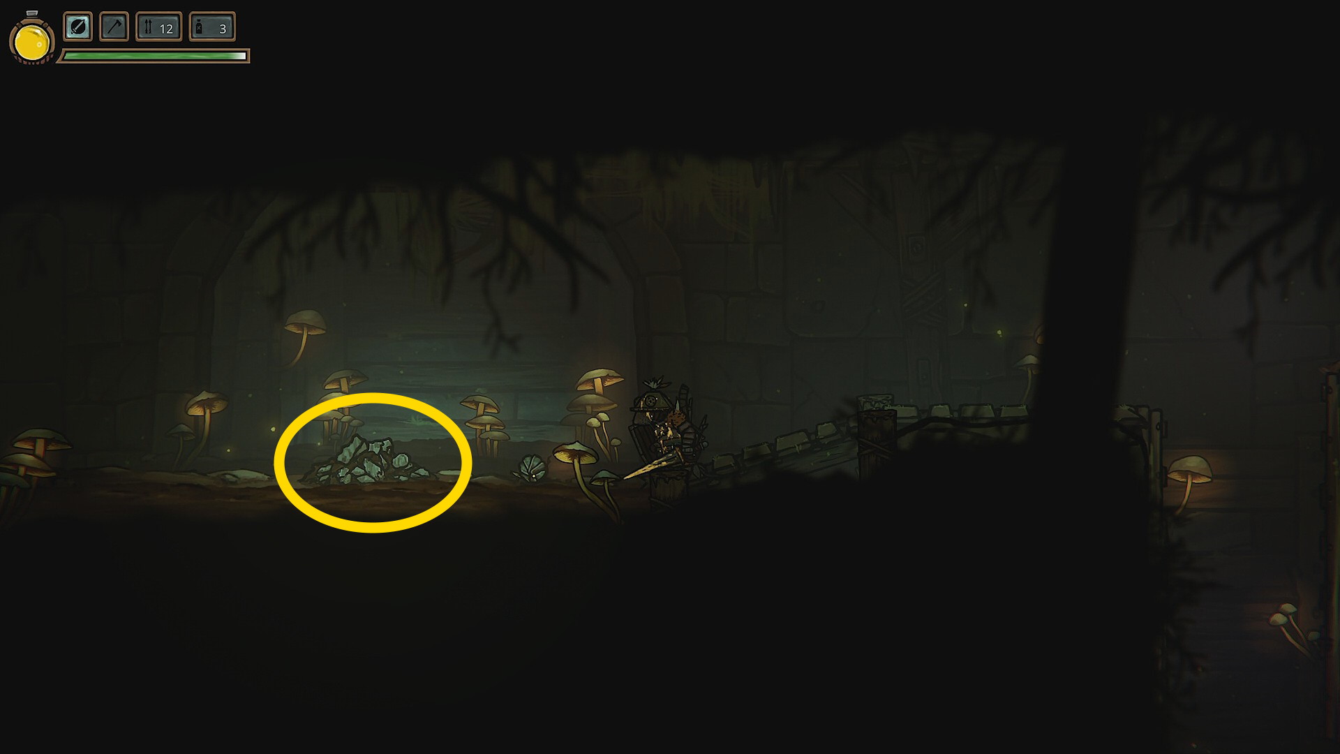 - 虫が1匹いるところ、石の山があり X ボタンで山を崩すと鉄鉱石が手に入る