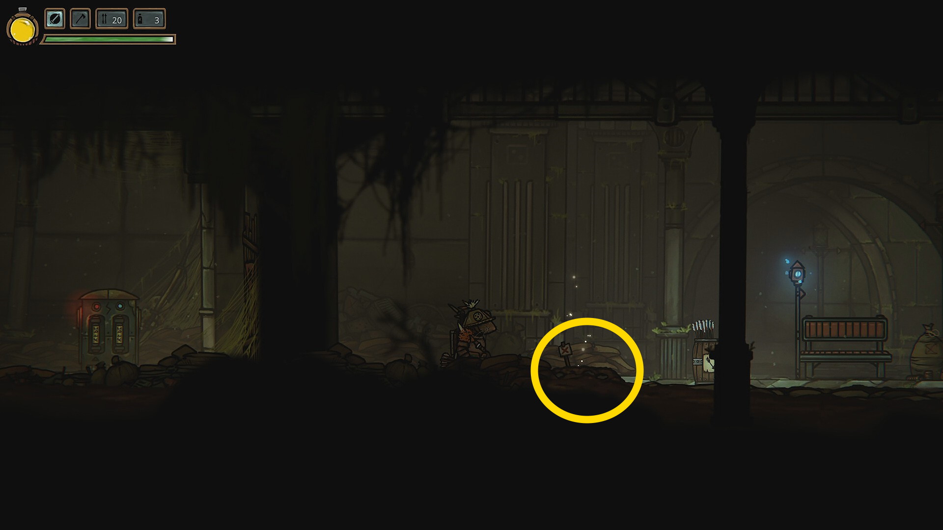 - 落ちたところにはセーブポイント、矢とバグジュースの補給ができるようになっている