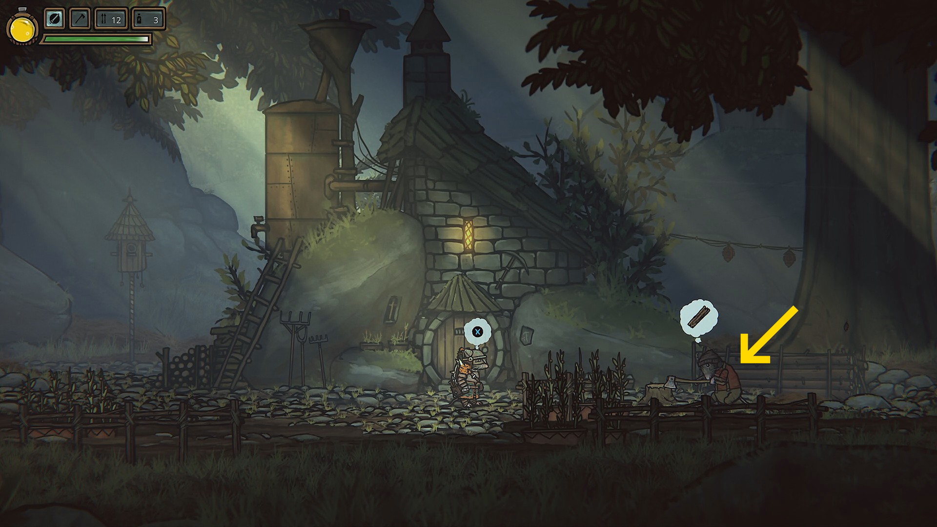- 風車の近くに農家がおり、会話すると木の厚板とペンキが欲しいとお願いされる