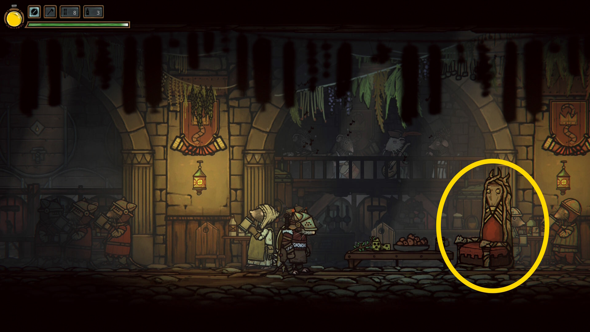 キングス・テイル Tails of Iron 2024.01.122026.03.02 トップページ Tails of Iron 攻略 トップページ Tails of Iron 実績解説ページ キングス・テイル クリムゾン砦の掲示板クエストもこれがラスト(戦闘なし) 受諾したら、厨房の地下に進み、詩人らと会話 会話が終わったらクリムゾン砦のエントランスに向かい、ネズミの作業員に話しかけ、ゴールドを5枚渡して パブ建材 をもらう ふたたび厨房の地下に戻り、パブ建材を渡すとパブが完成する 完成後、少し右に進むと王の椅子があるので座ると 実績「最初のビールの味は旨し」解除 エントランスに戻り、旅行板からロング・テイル村へファストトラベル 行方不明の詩人:ジョニー・ナッシャーズ 泥のウィルム Tails of Iron(テイルズオブアイアン)攻略のTOPへ