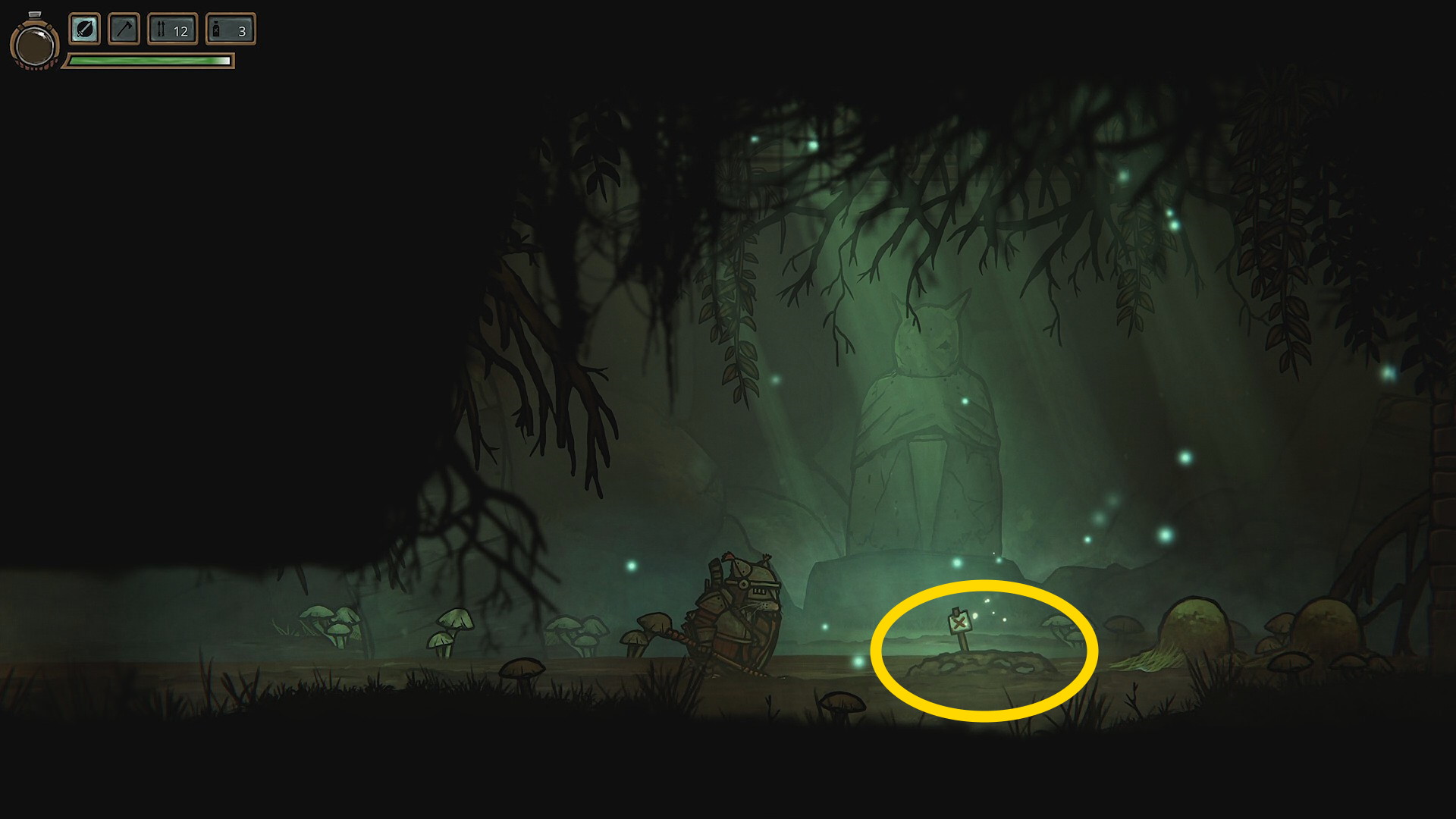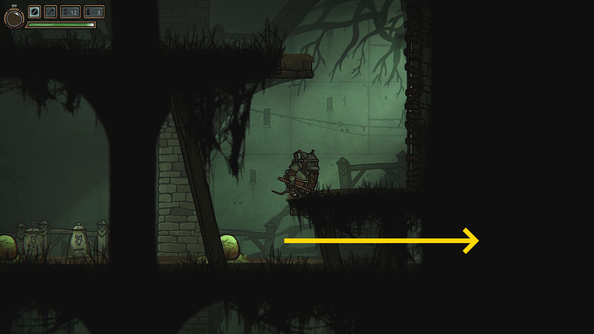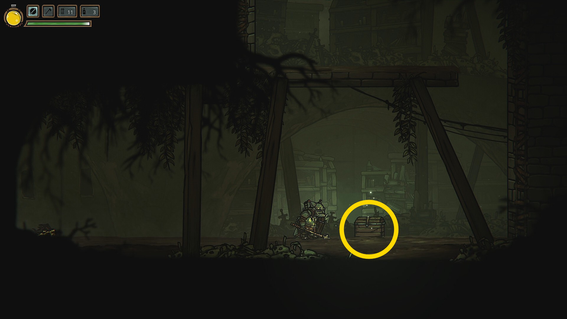 - 掘ると宝箱が出てきて、中から 片手斧 を回収(装備しない)