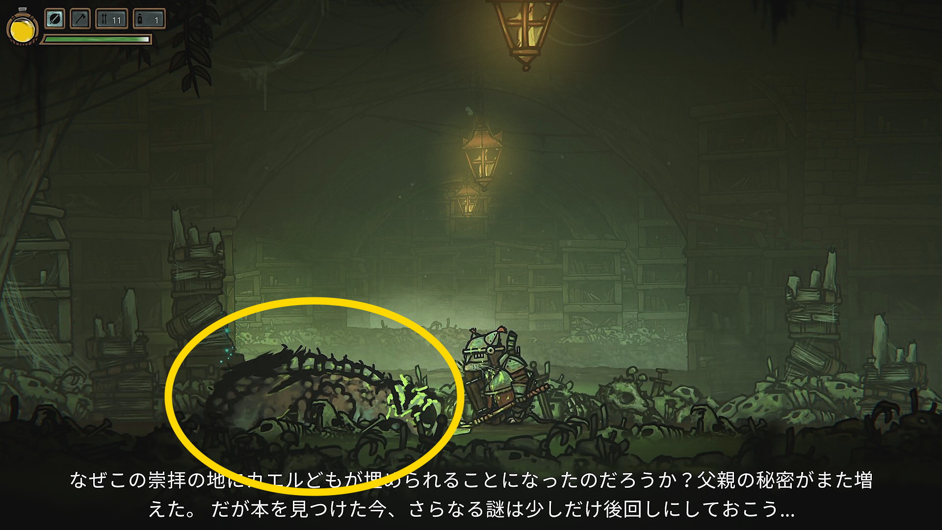 - 左に進んでエリアが変わると目の前に骸骨があり、調べると 盾 が手に入る(装備しない)