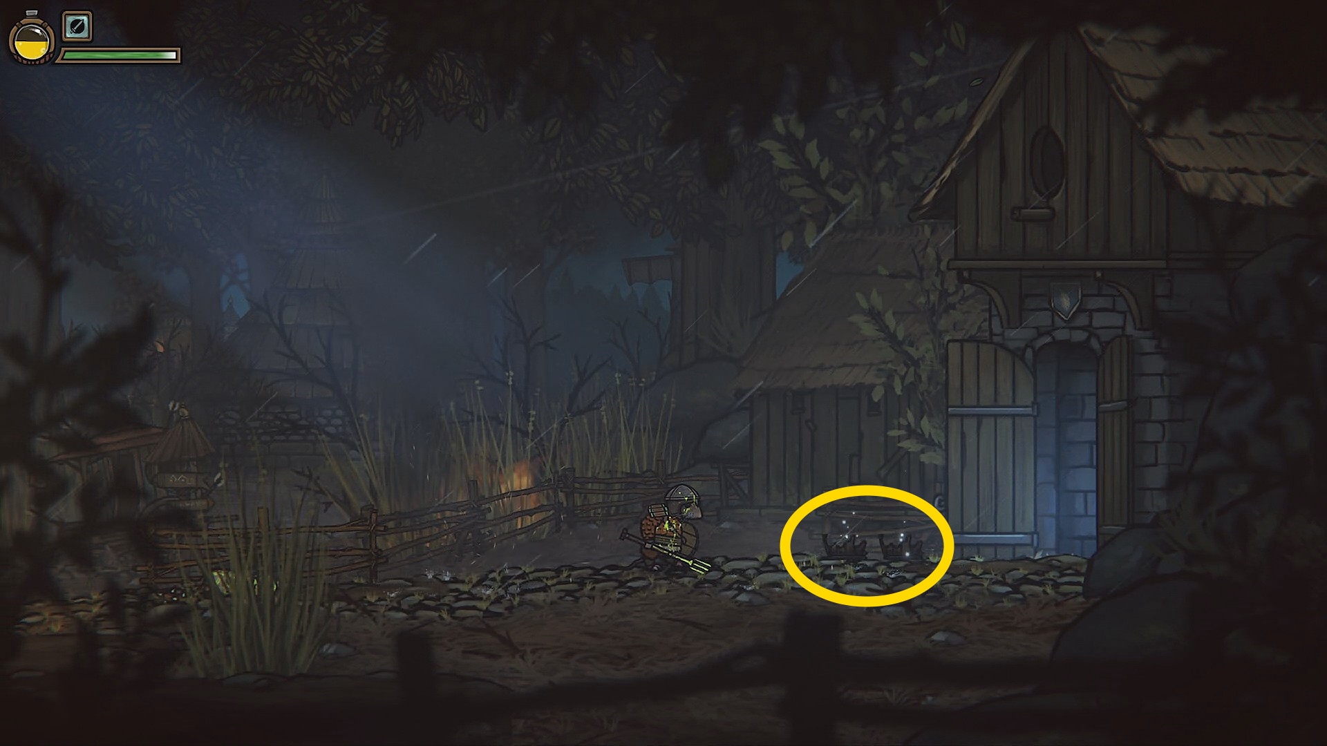 - 門の前で座り込むネズミ(衛兵隊長)と会話し、村役場の鍵 を回収