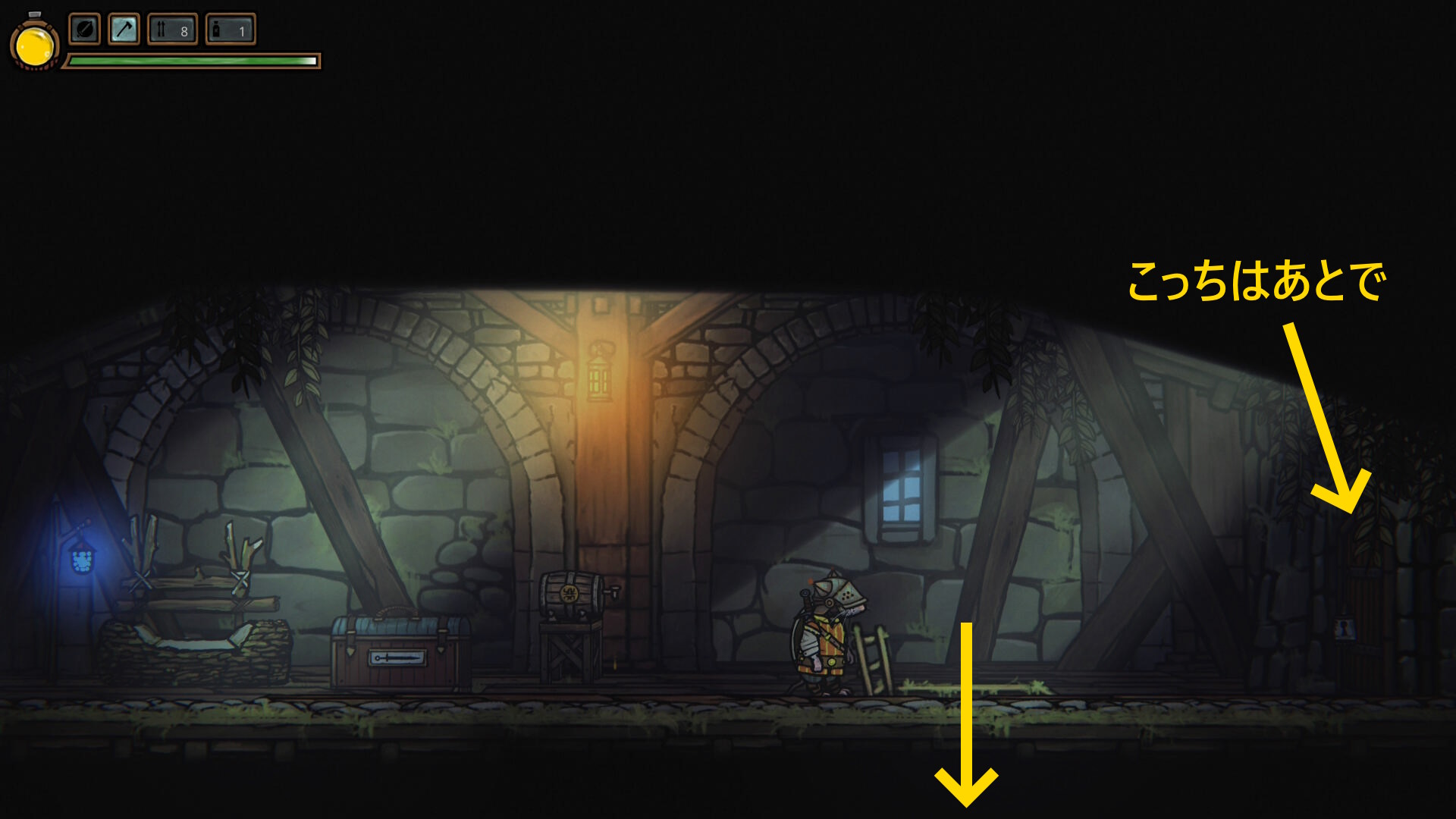 - 右端のドアはストーリーが進まないと開けられないので地下へにおりる