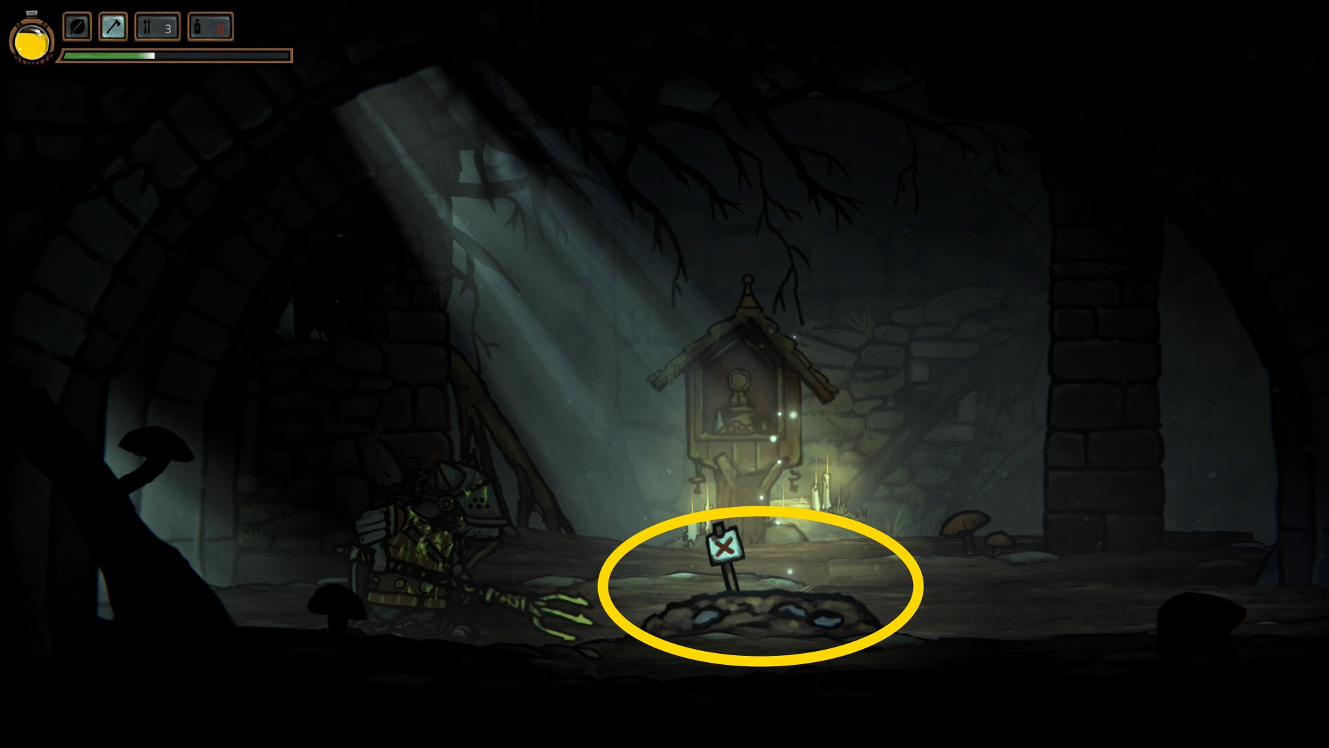 - さらに右に進むと隠し部屋に入り、掘り起こせる場所で以下の装備品が手に入る
