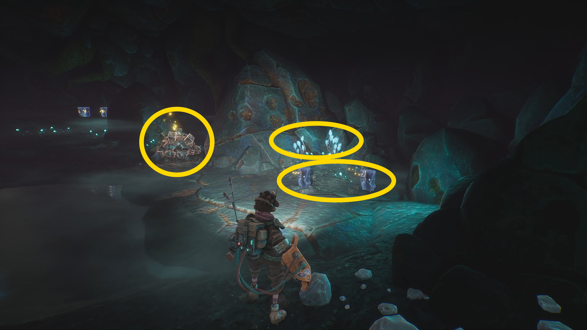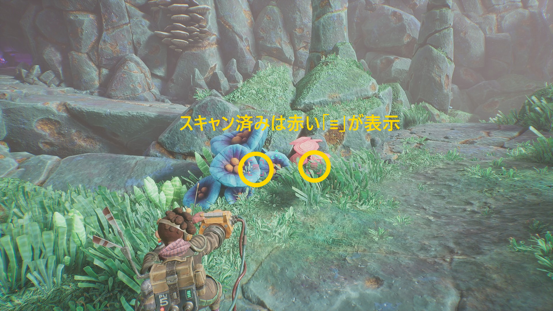 - 洞窟に入ると右前方に資源と植物があるので、合計3つスキャンする