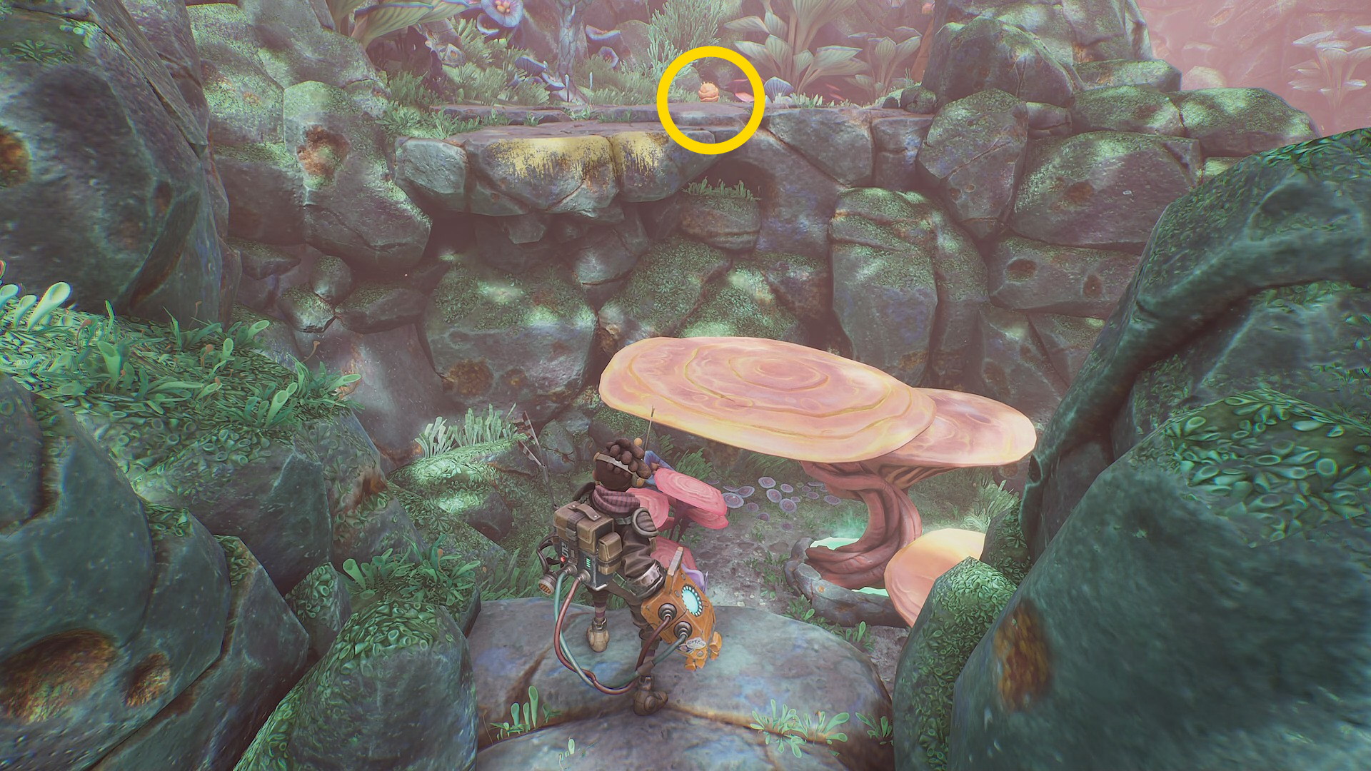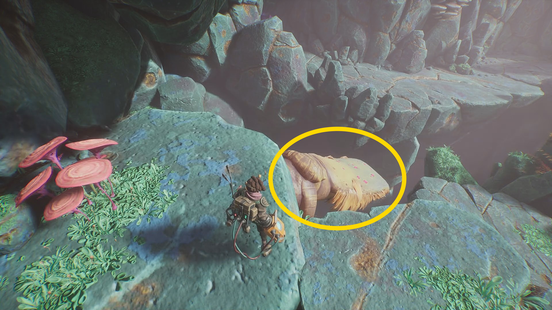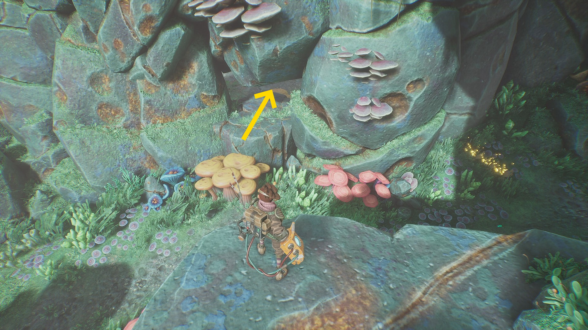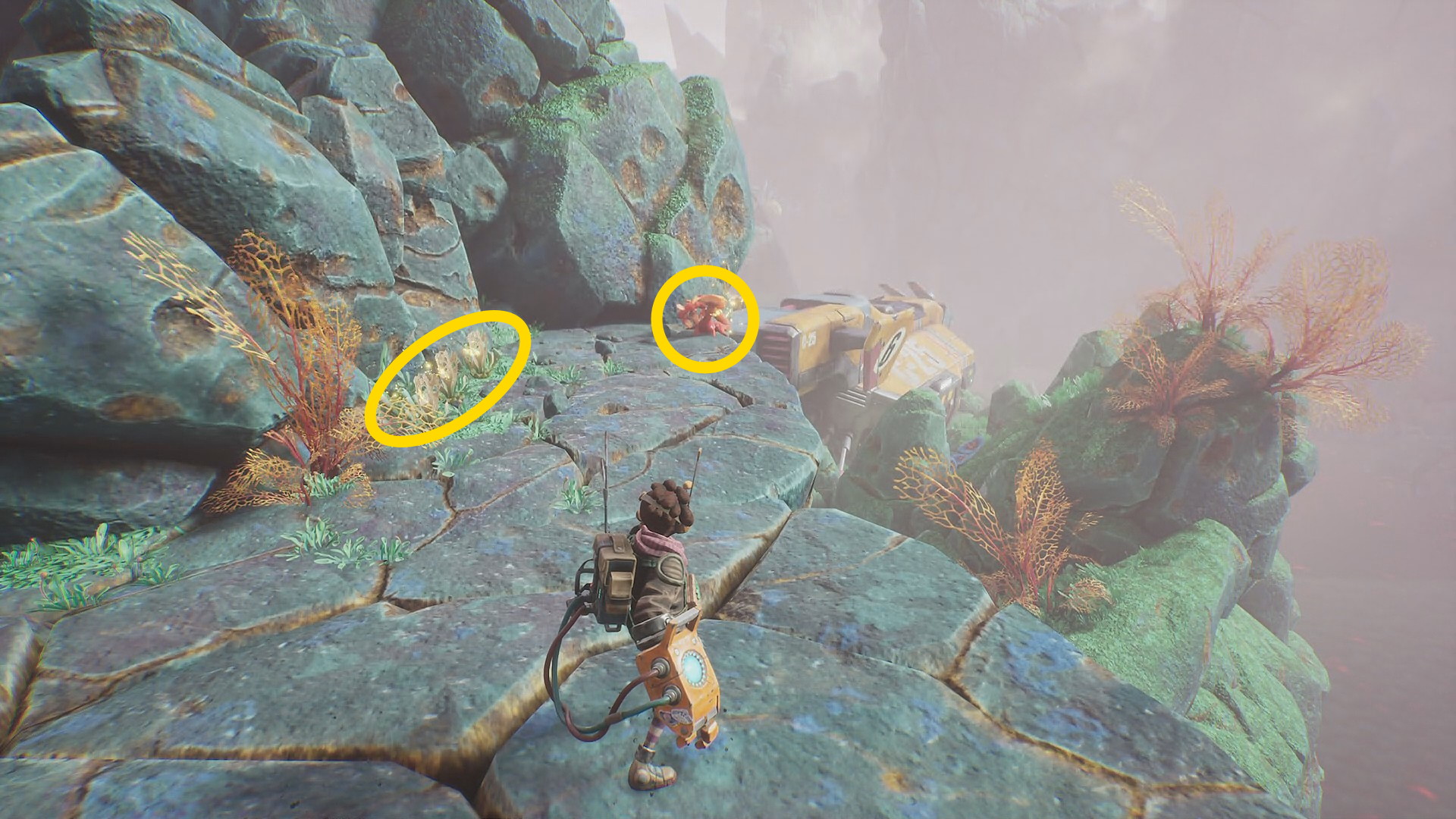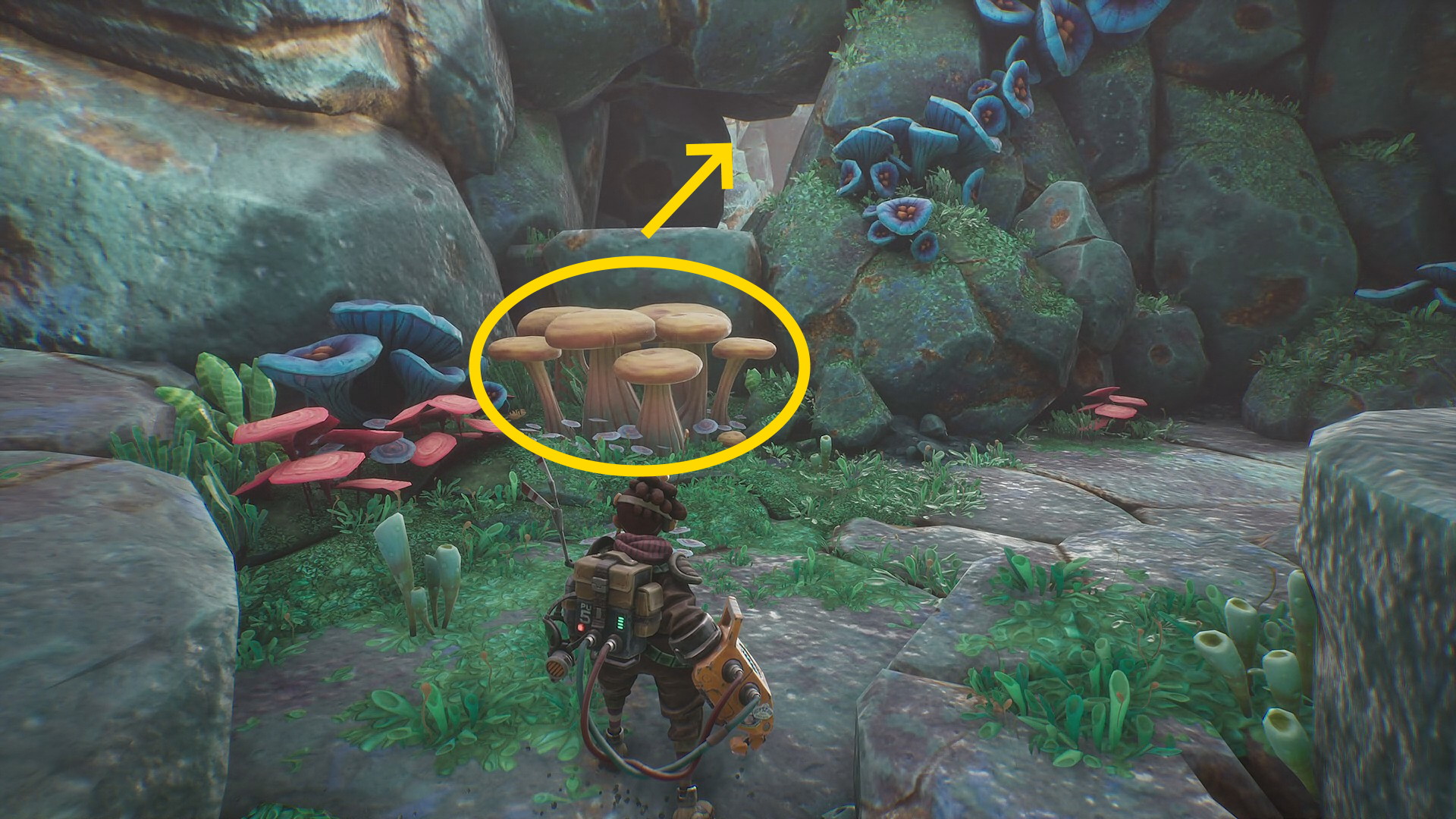 - 菌糸体コイルをちぎったらグリップポイントのところに戻る。まず、菌糸体コイルを上に放り投げる。左に隠された岩の隙間があり、その中に入ると資源あり