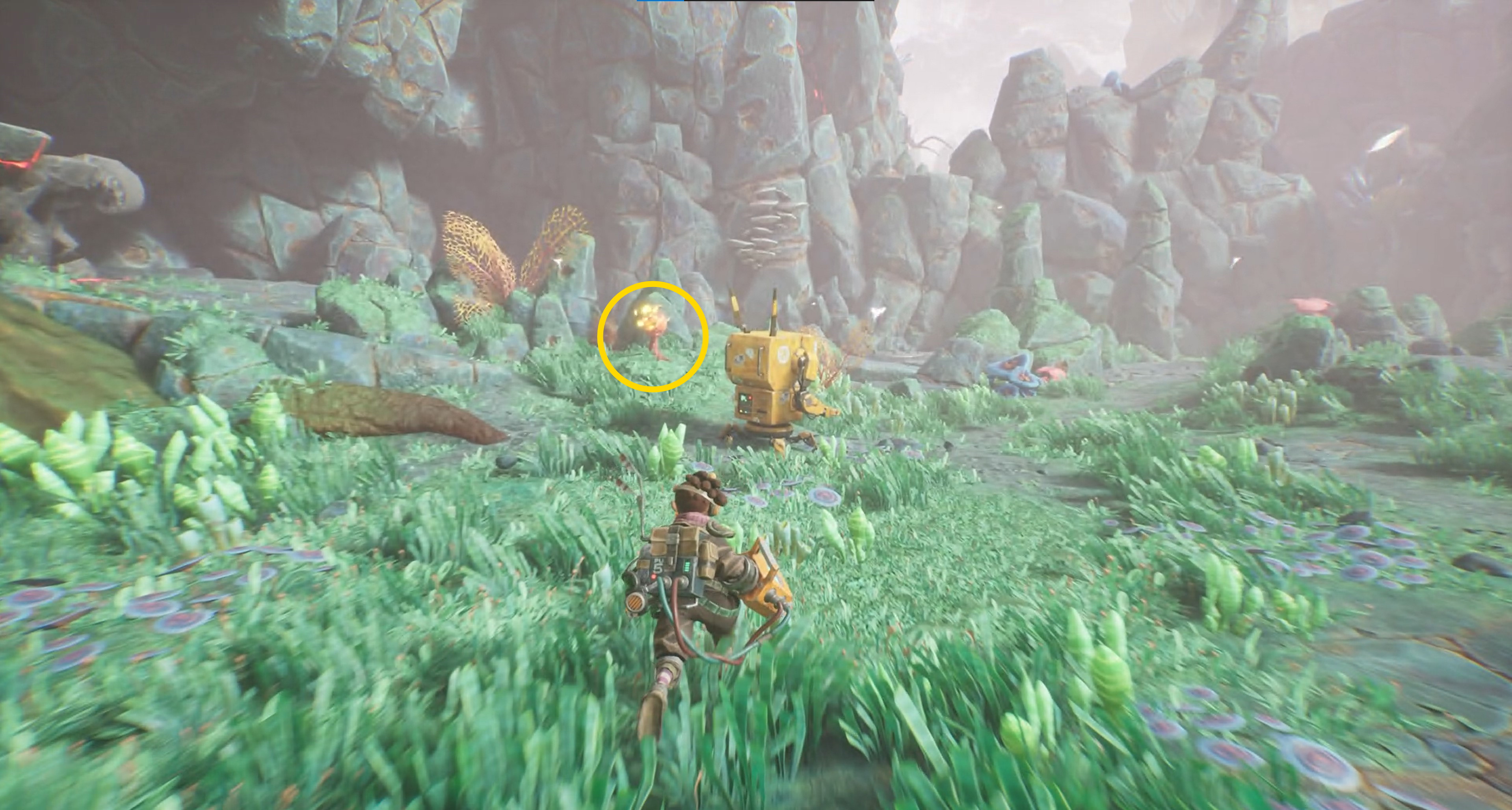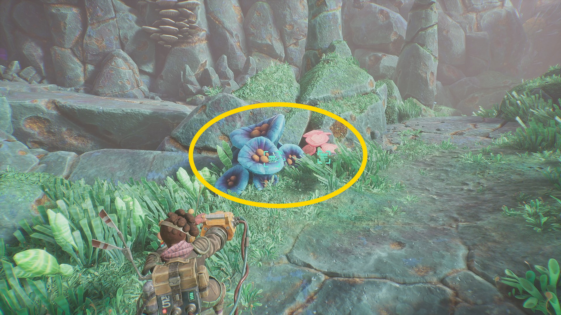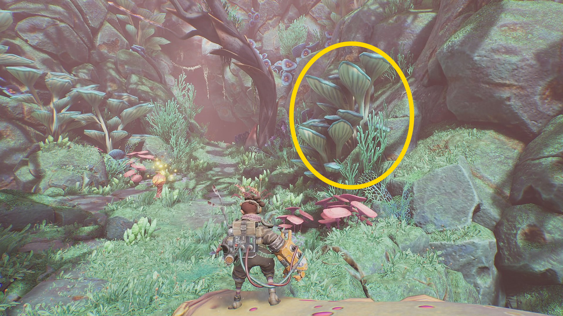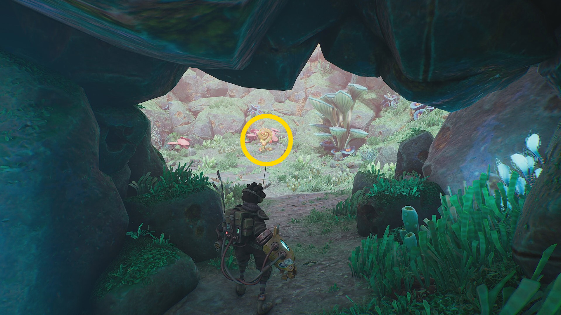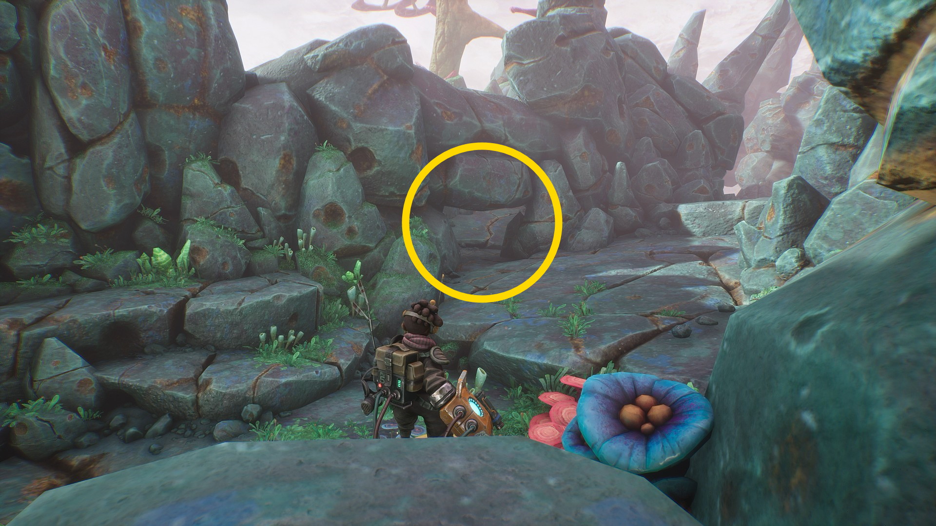 - 菌糸体コイルをちぎったらグリップポイントのところに戻る。まず、菌糸体コイルを上に放り投げる。左に隠された岩の隙間があり、その中に入ると資源あり