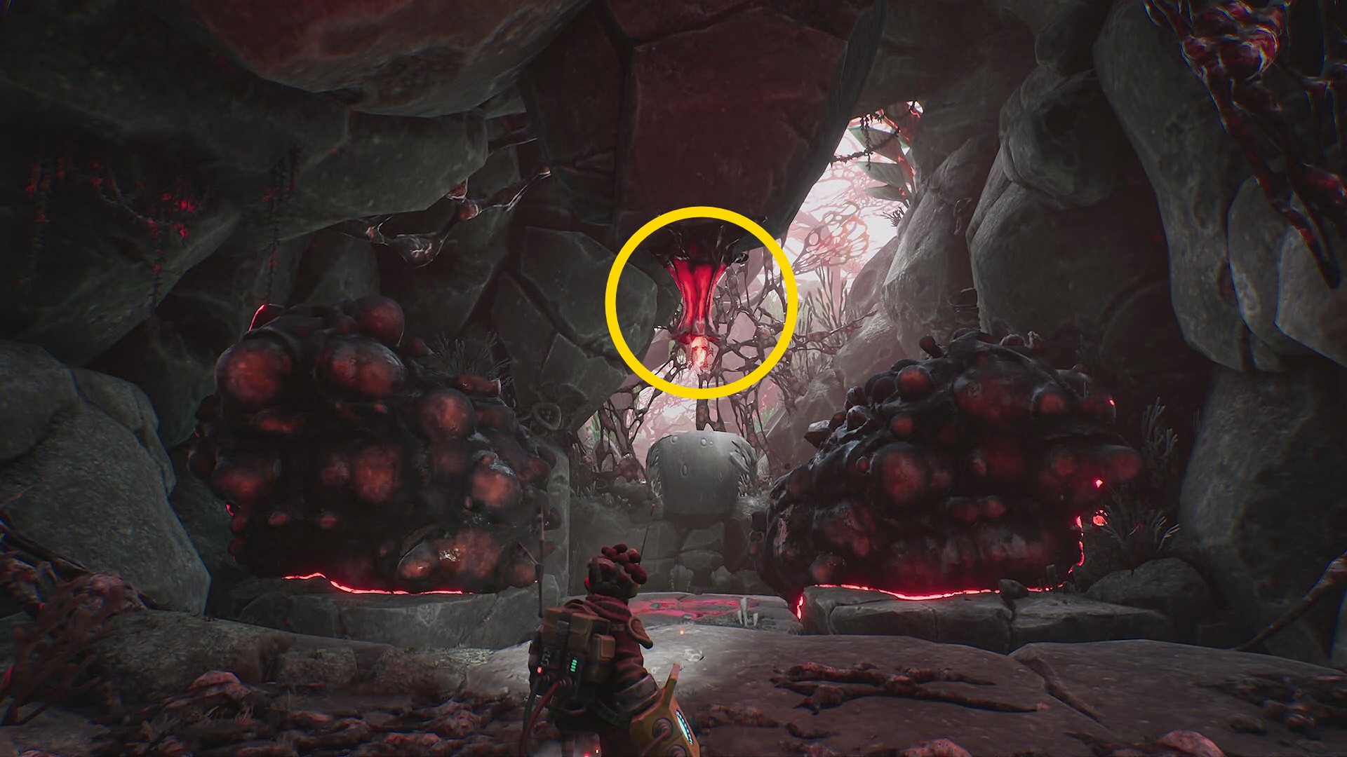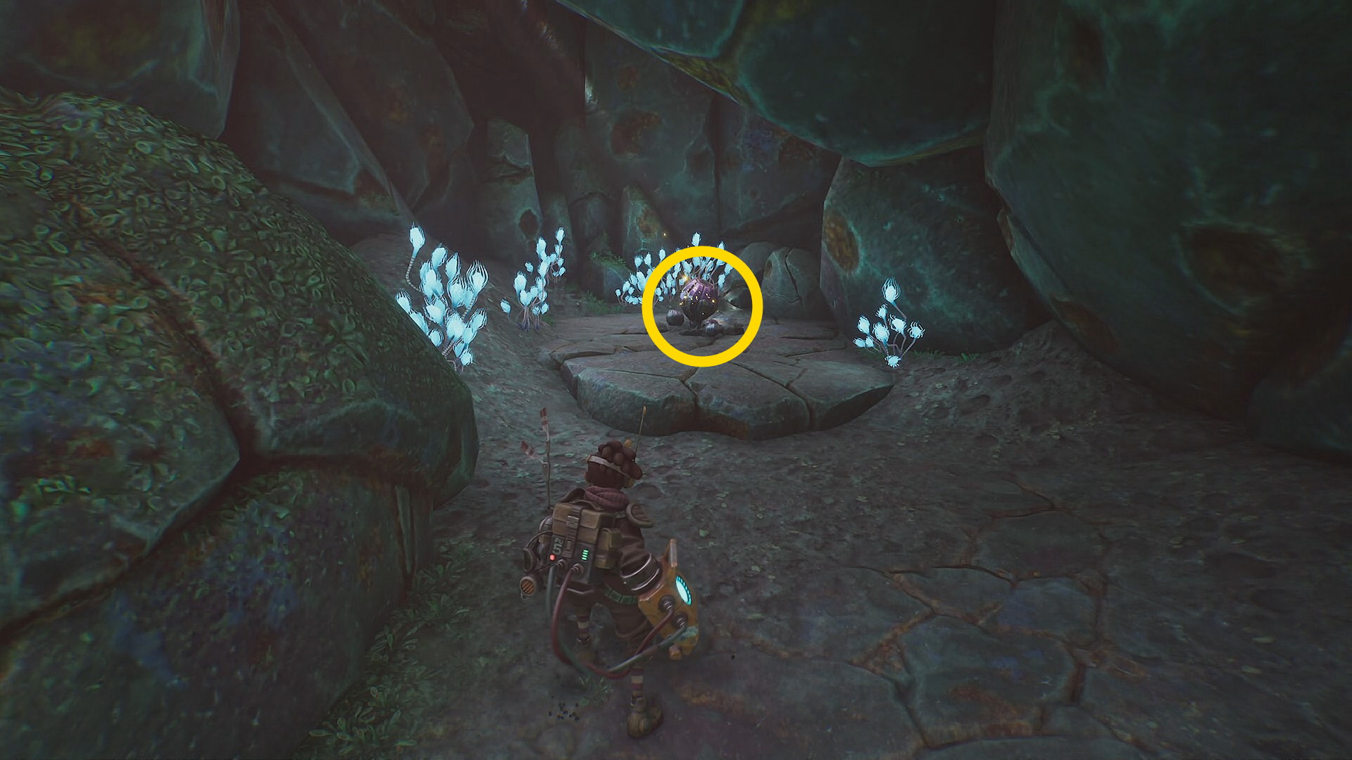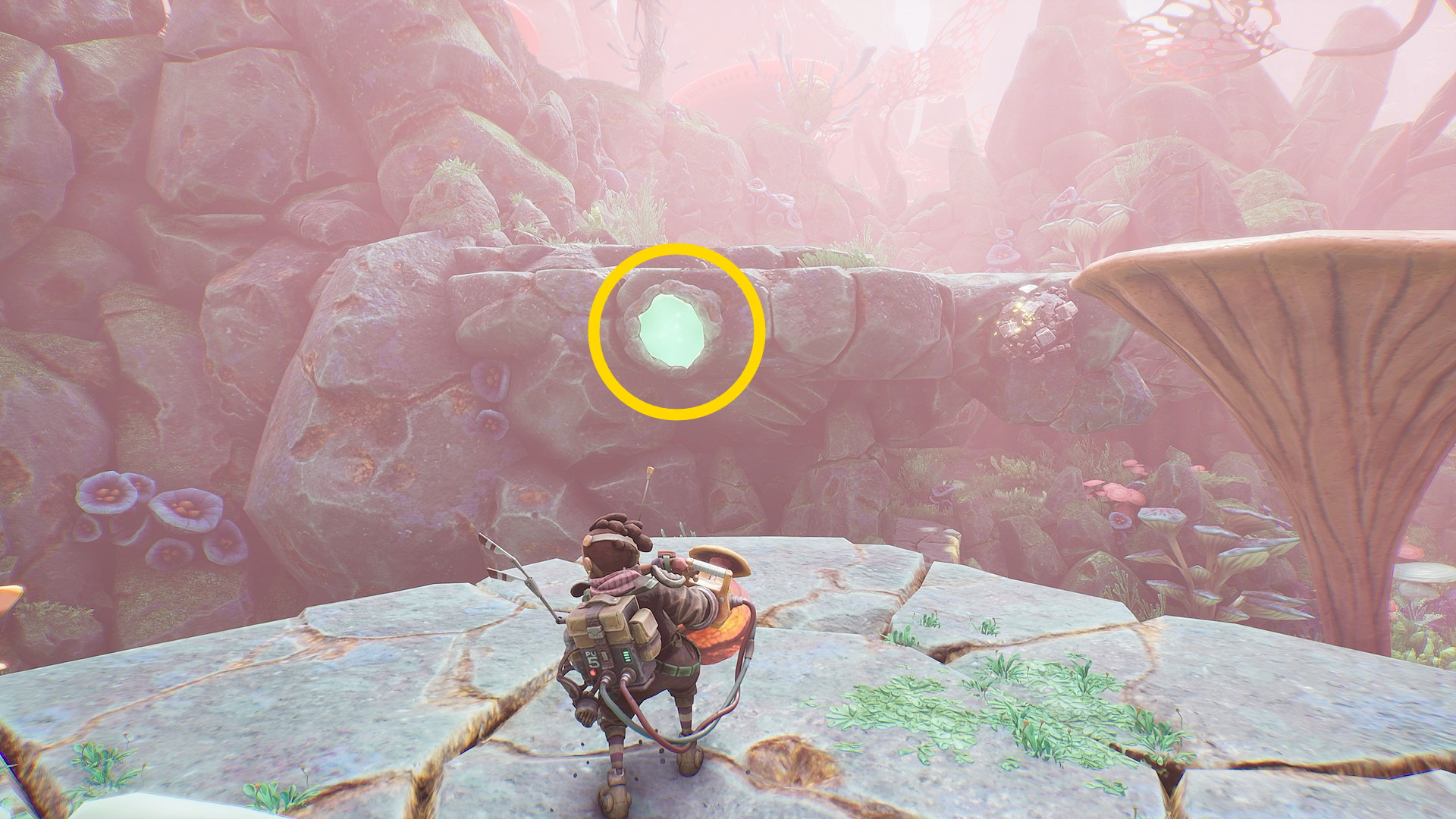 - 菌糸体コイルを詰め込み、家禽の舌の向こうの岩壁にあるエネルギー裂溝に放り込む