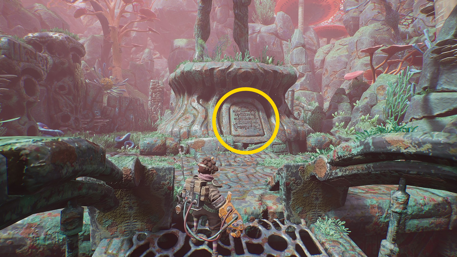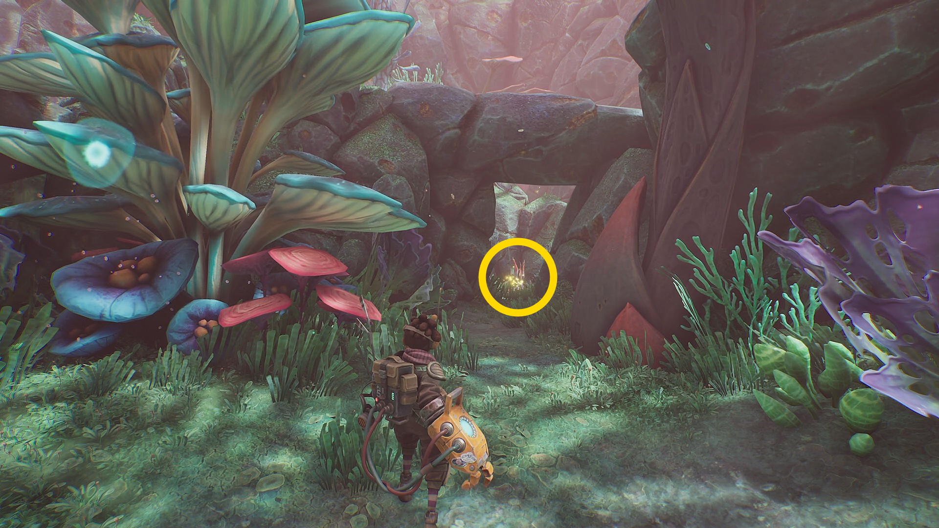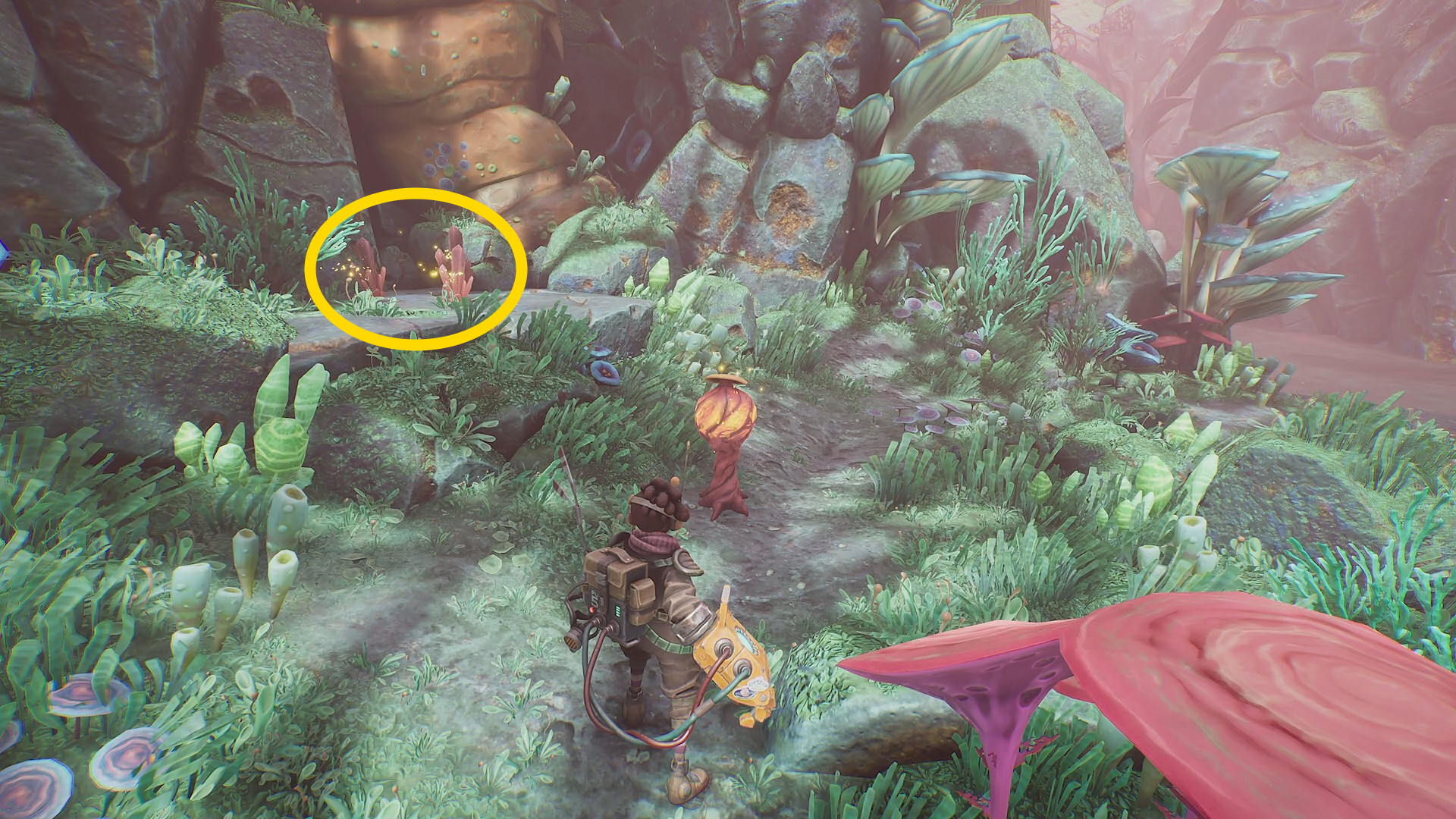 - 外に出たら菌糸体コイルを詰め込み、動物の下にあるエネルギー裂溝に放り投げる(階段状のキノコが出現したら、このエリアの資源を先に回収してしまおう)