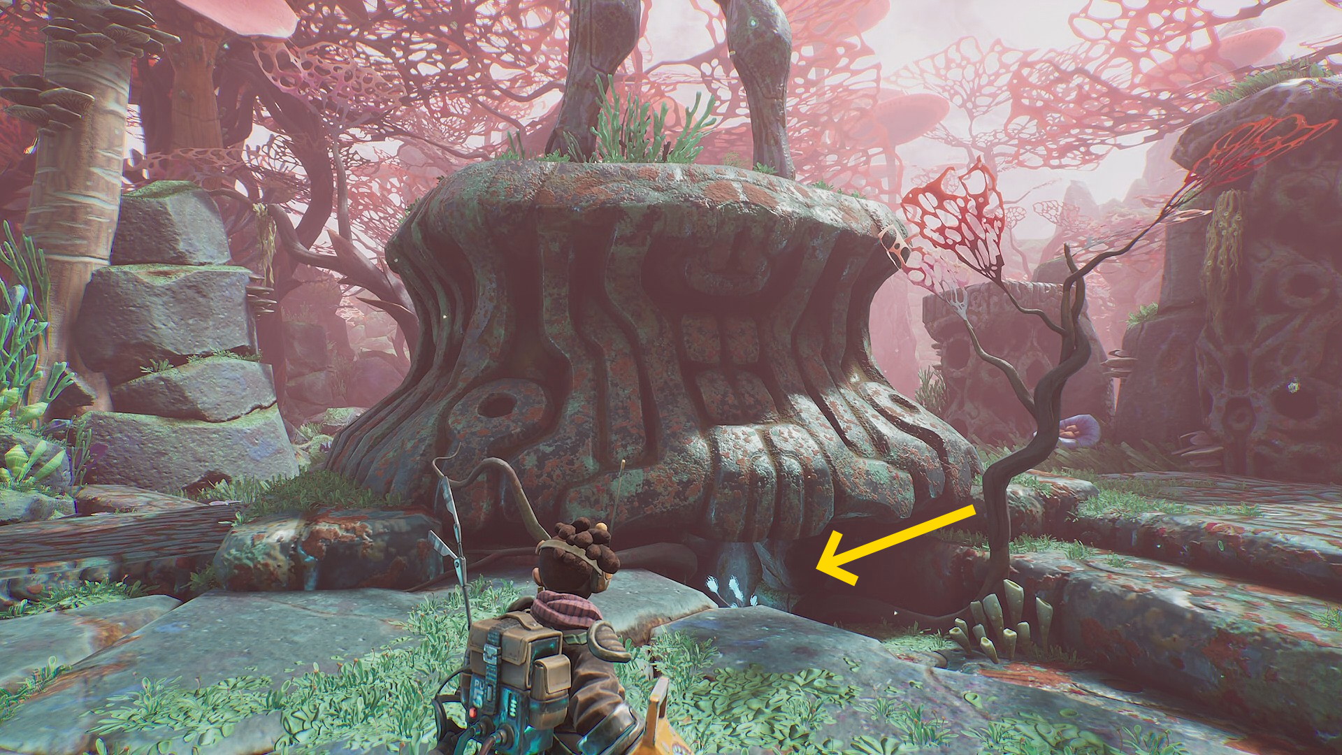 - 右側のエネルギー裂溝(光る水たまり)に菌糸体コイルを放り込むとキノコの階段が出現する( RT or B で放り込む)