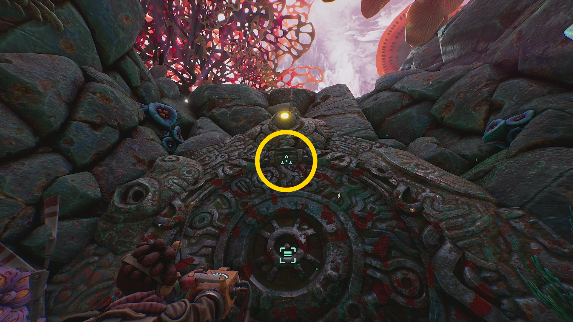 - エイリアン・モニュメントを正面に見て、左側に黄色のサークルがあり、中に入ってビーコンを設置する