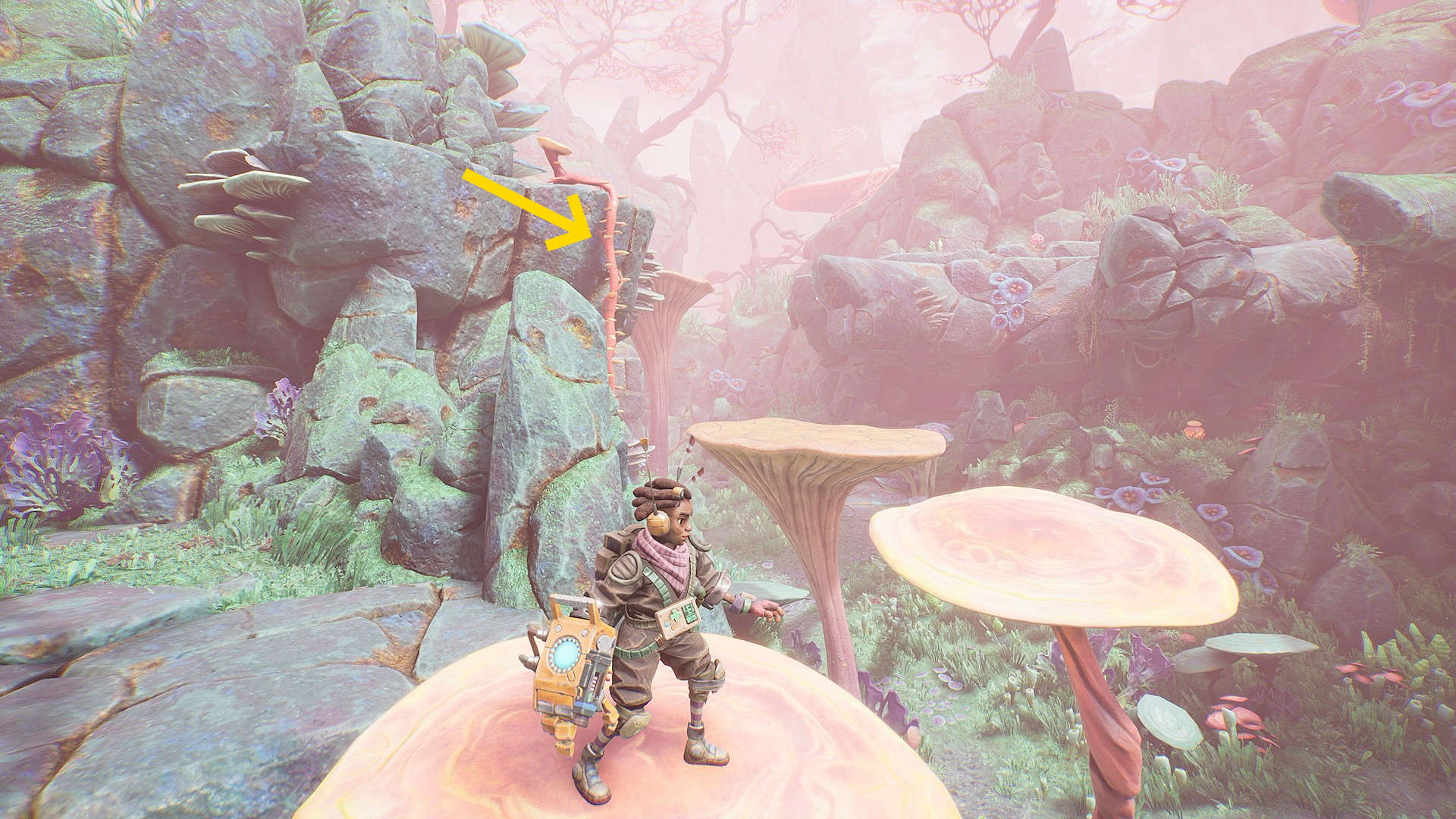 - グリップポイントを登ったら菌糸体コイルを持ち、すぐ右のグリップポイントの上に投げ、それを登る