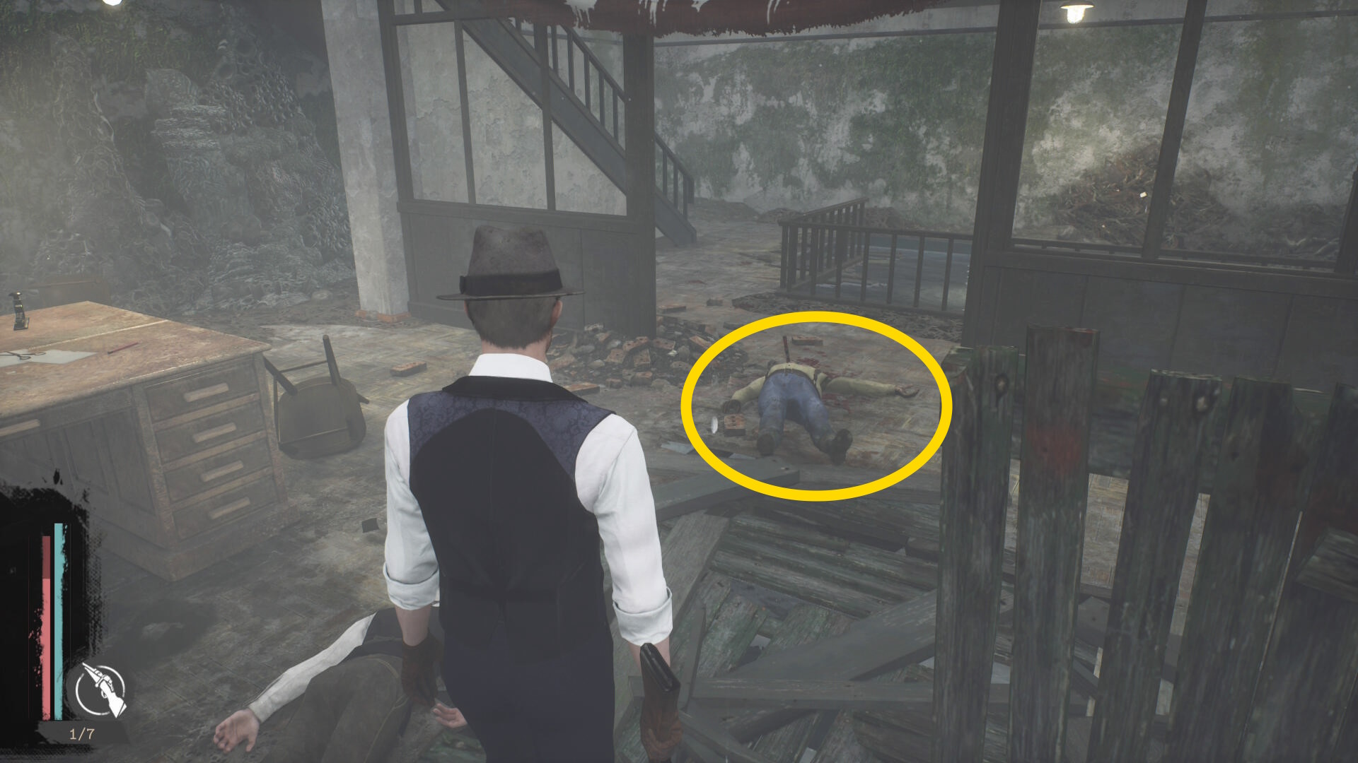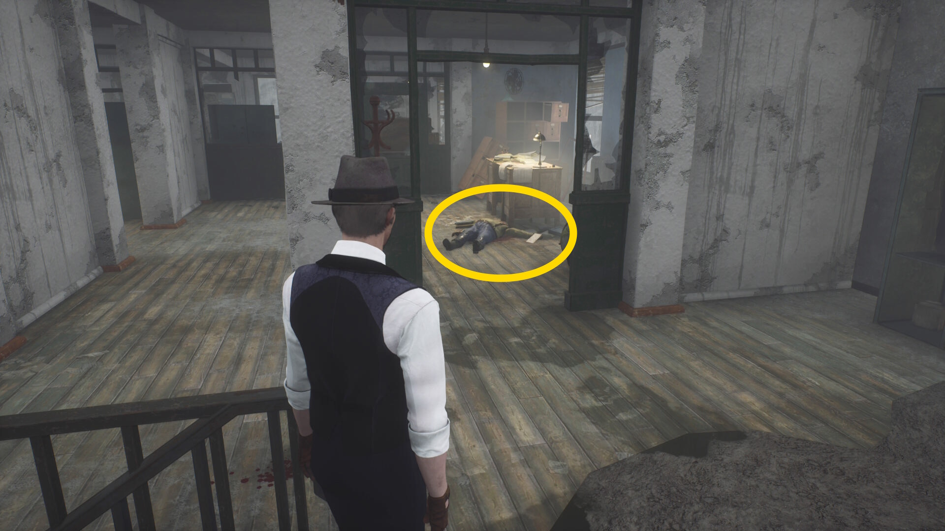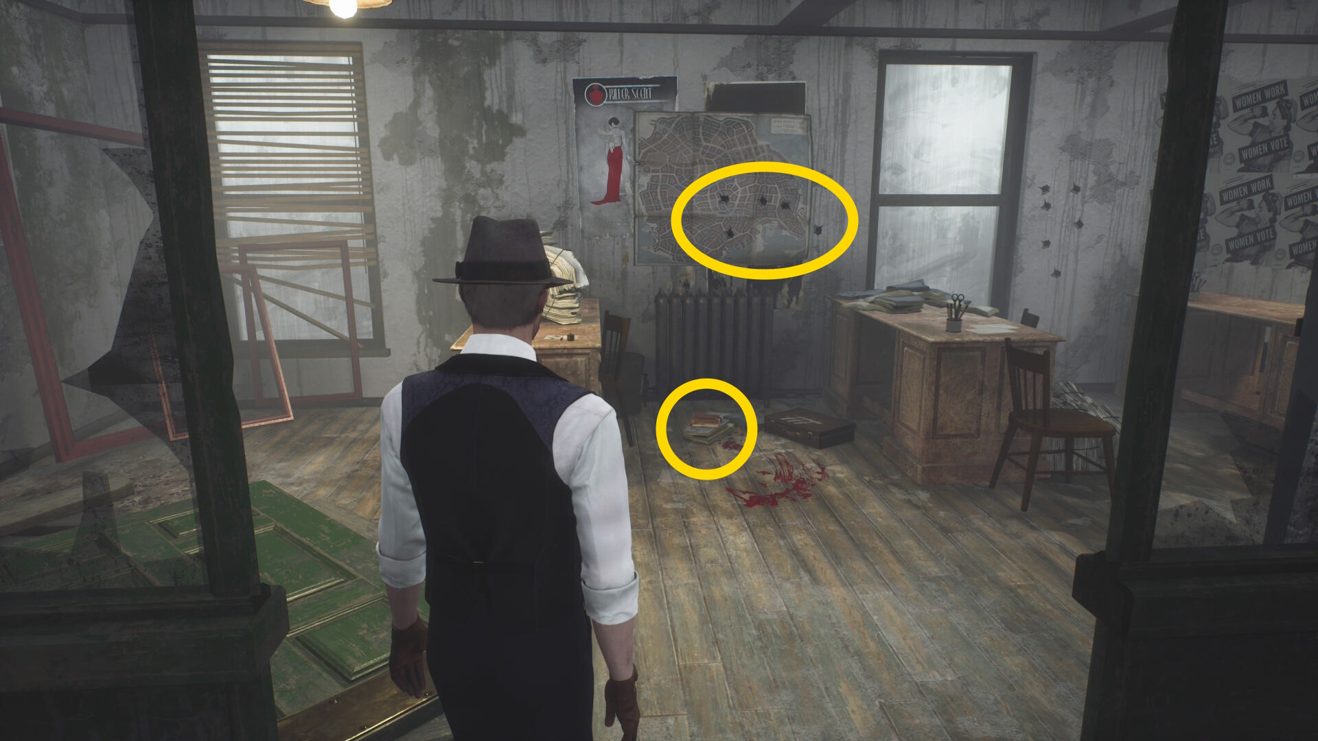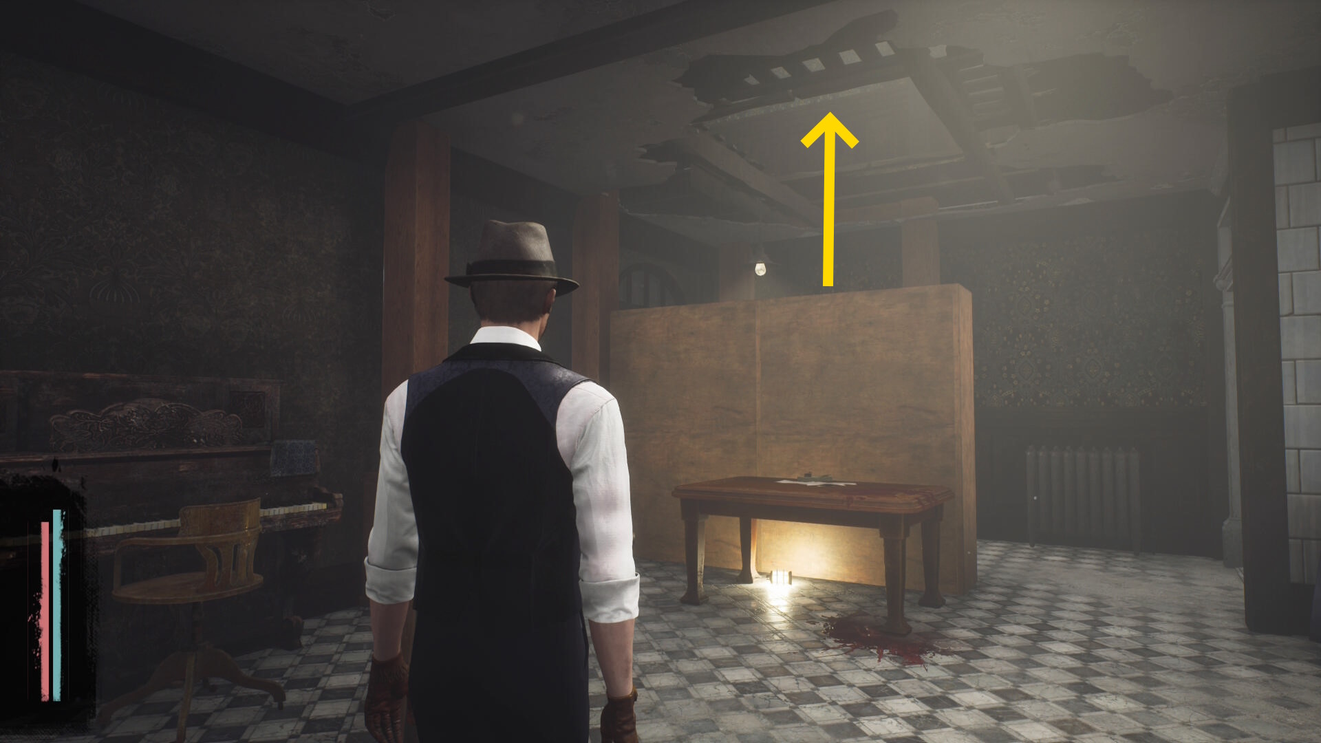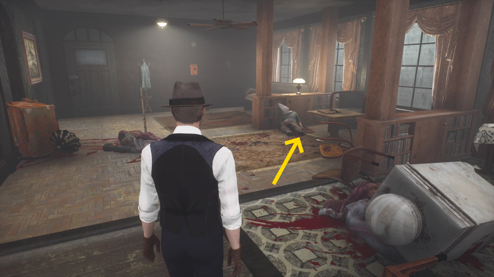 • 奥の部屋に進み、床の訳注と壁の銃痕を調べる