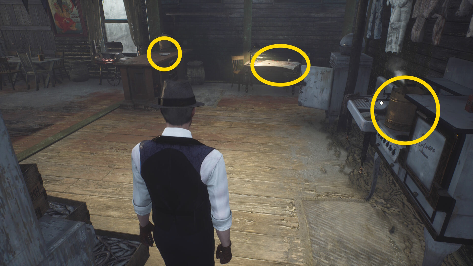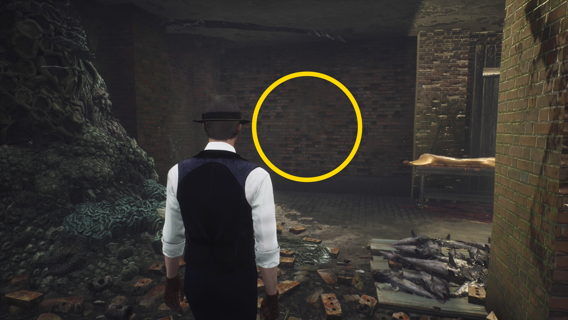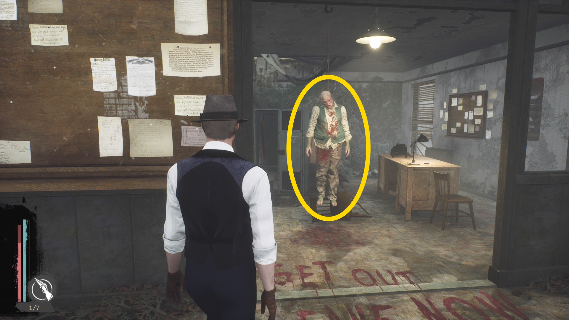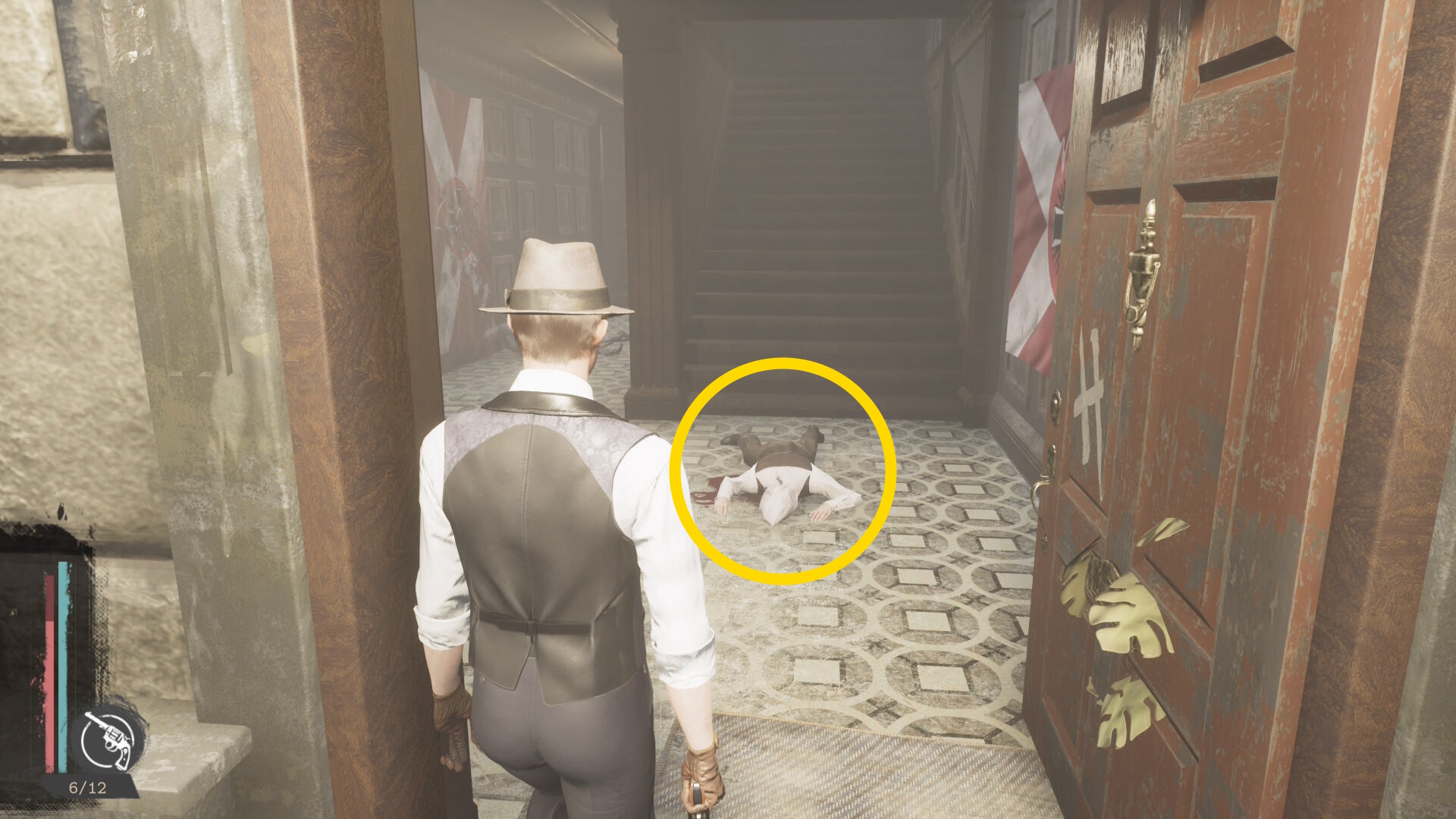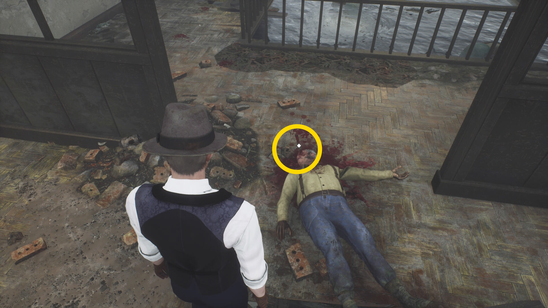 • 奥の部屋に進み、床の訳注と壁の銃痕を調べる