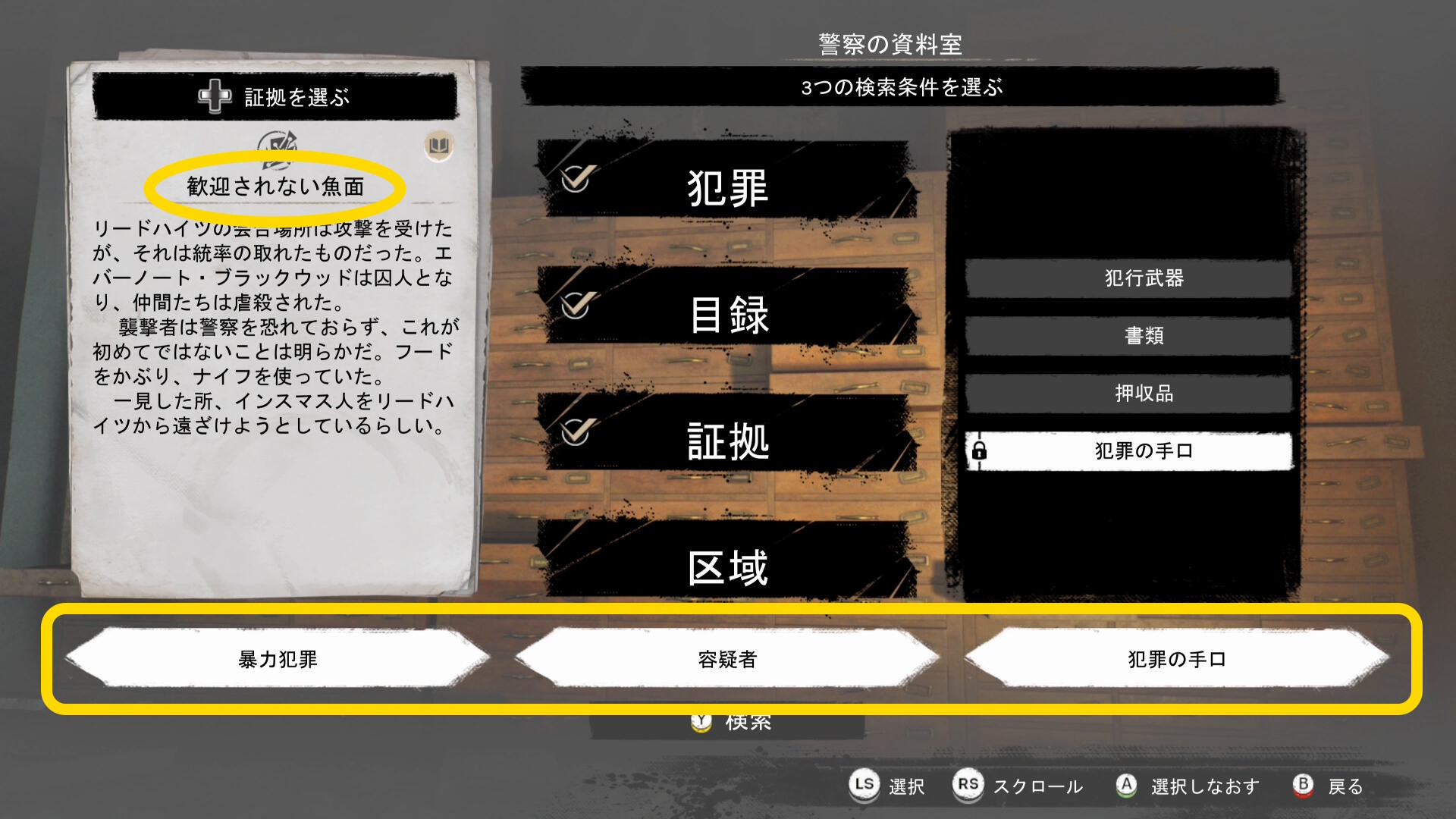 • 証拠を「歓迎されない魚面」にし、以下の条件で検索する