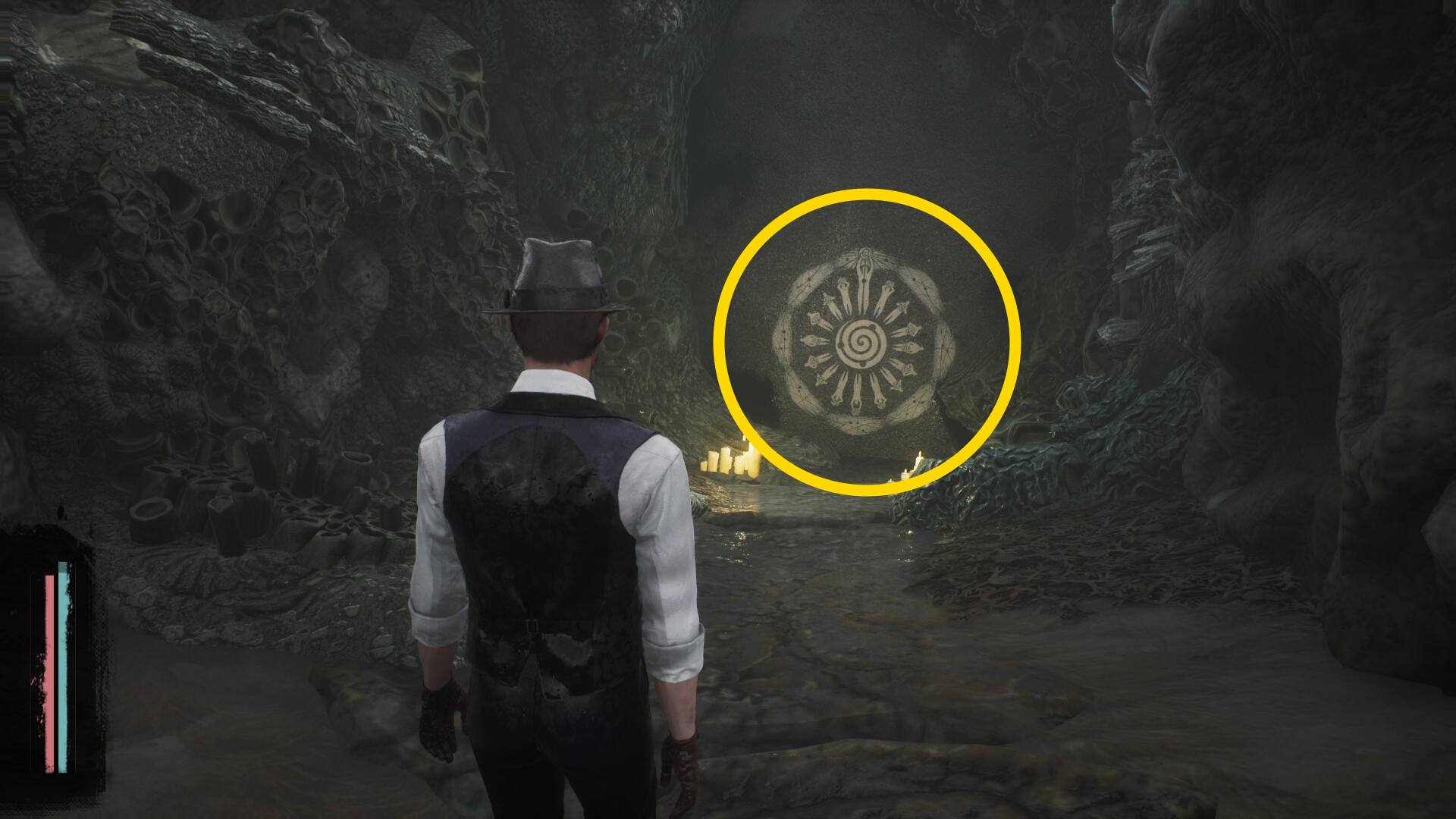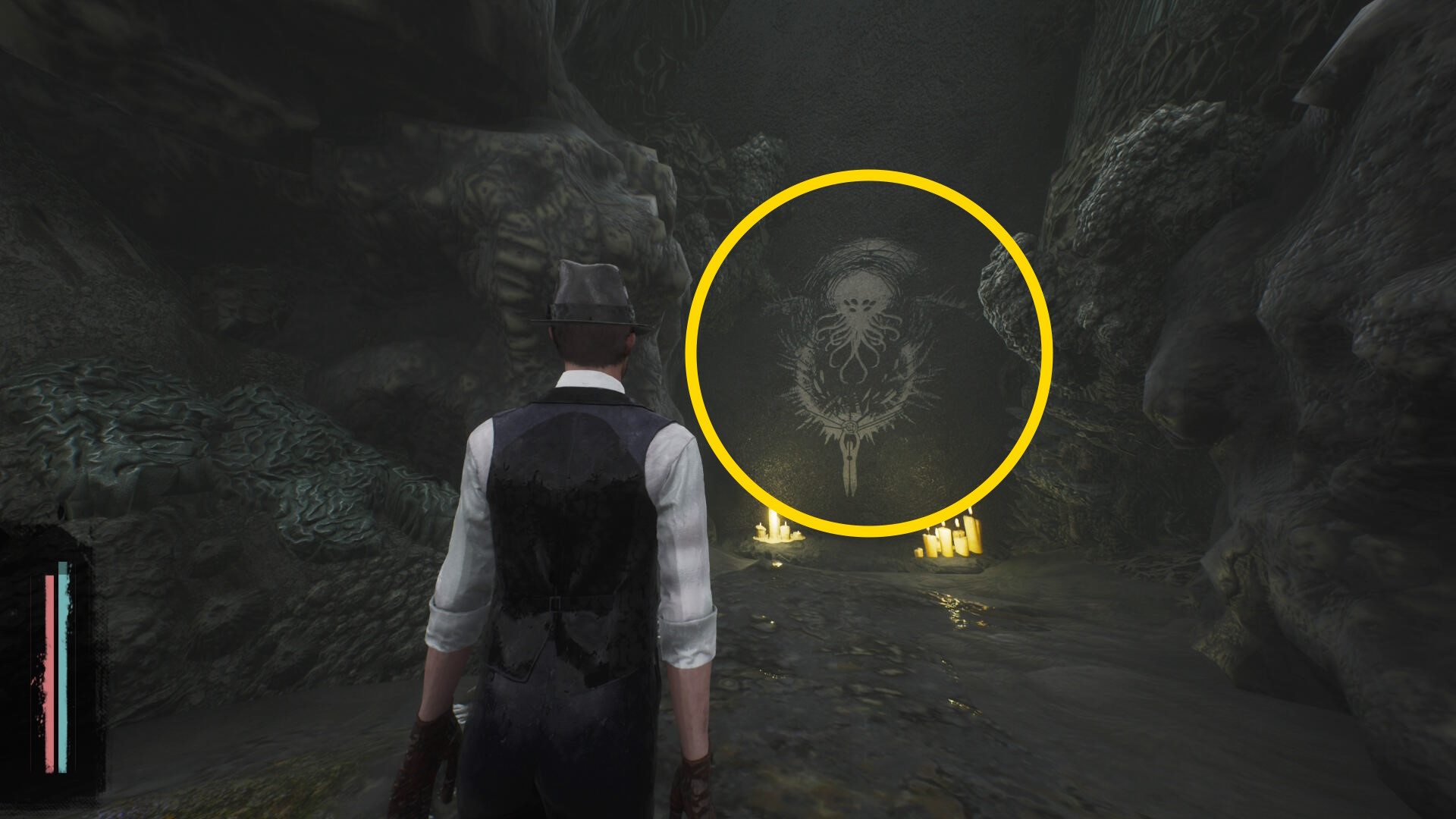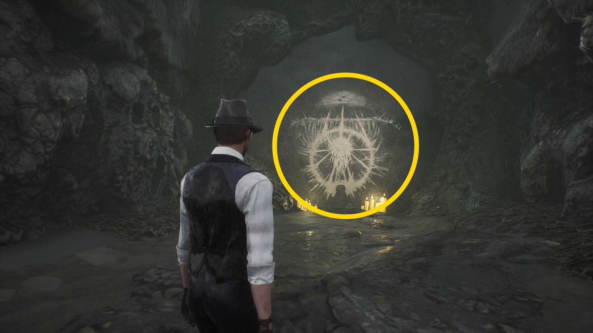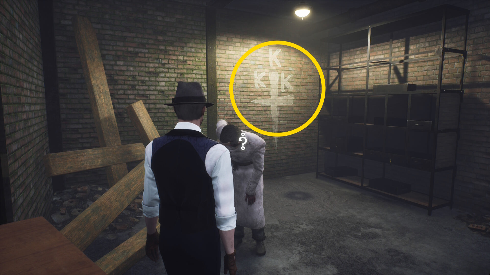 • 会話後、彼の後ろの KKK を書かれた壁を心の眼を発動して調べる