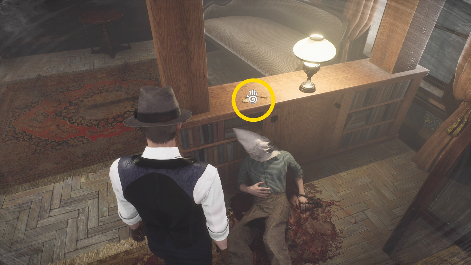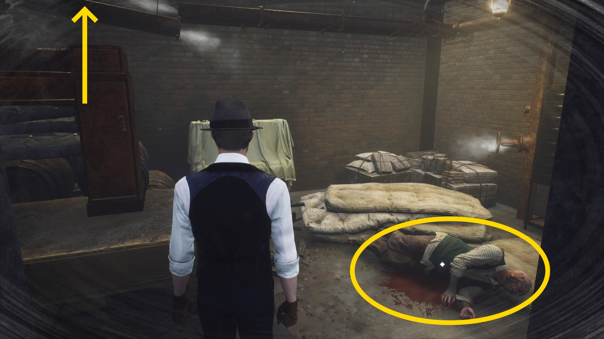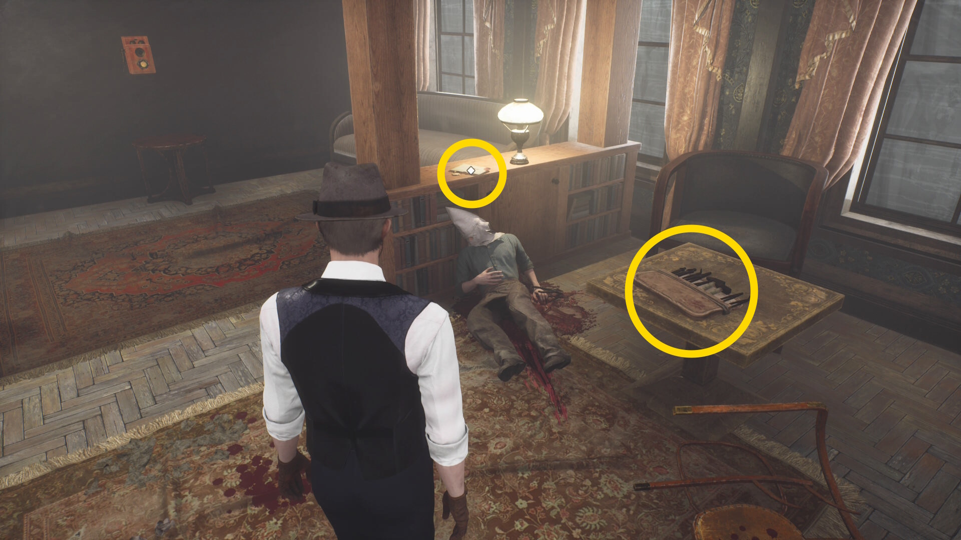 • 2階に上がり、すぐの部屋にある遺体とその傍らに置かれた手紙を調べる