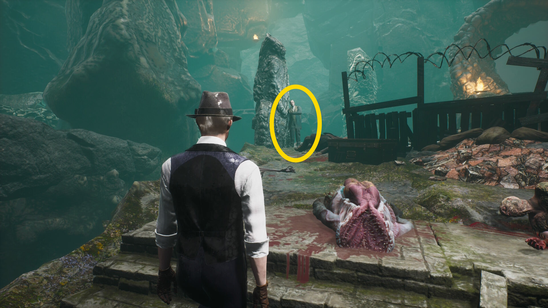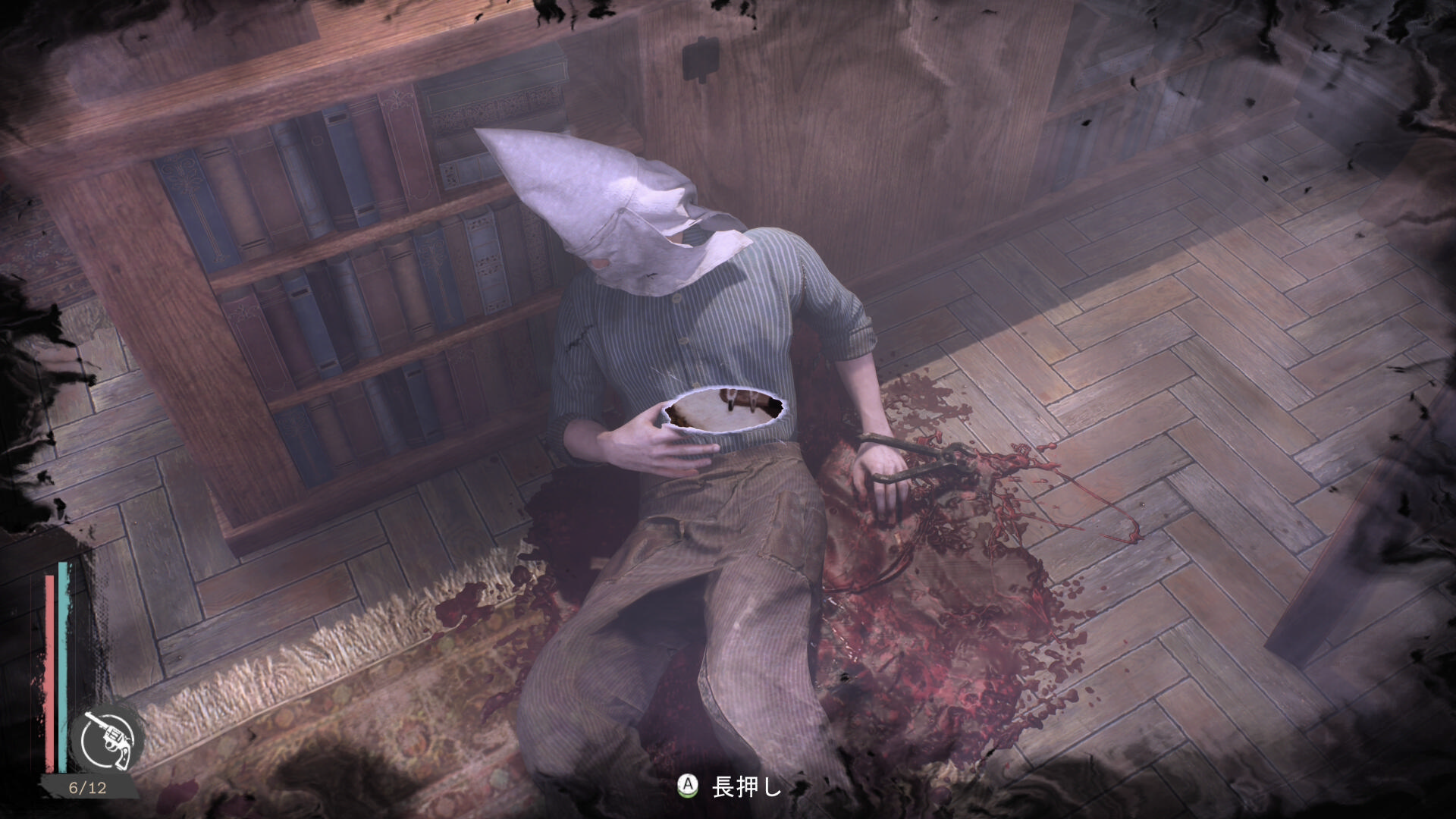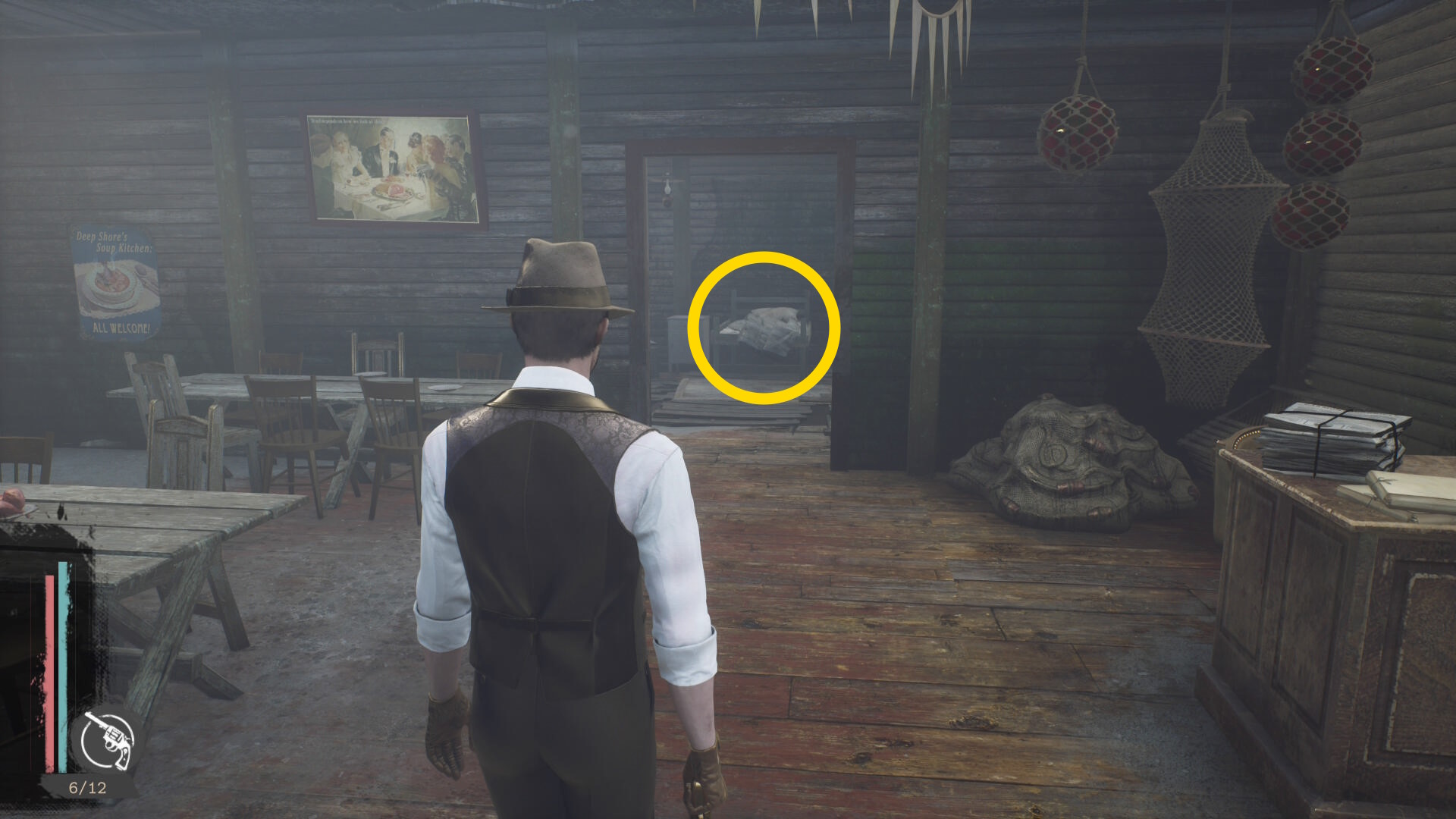 • 2人をキルしたら、入ったところで死亡しているインスマス人の遺体と刺さるナイフを調べる