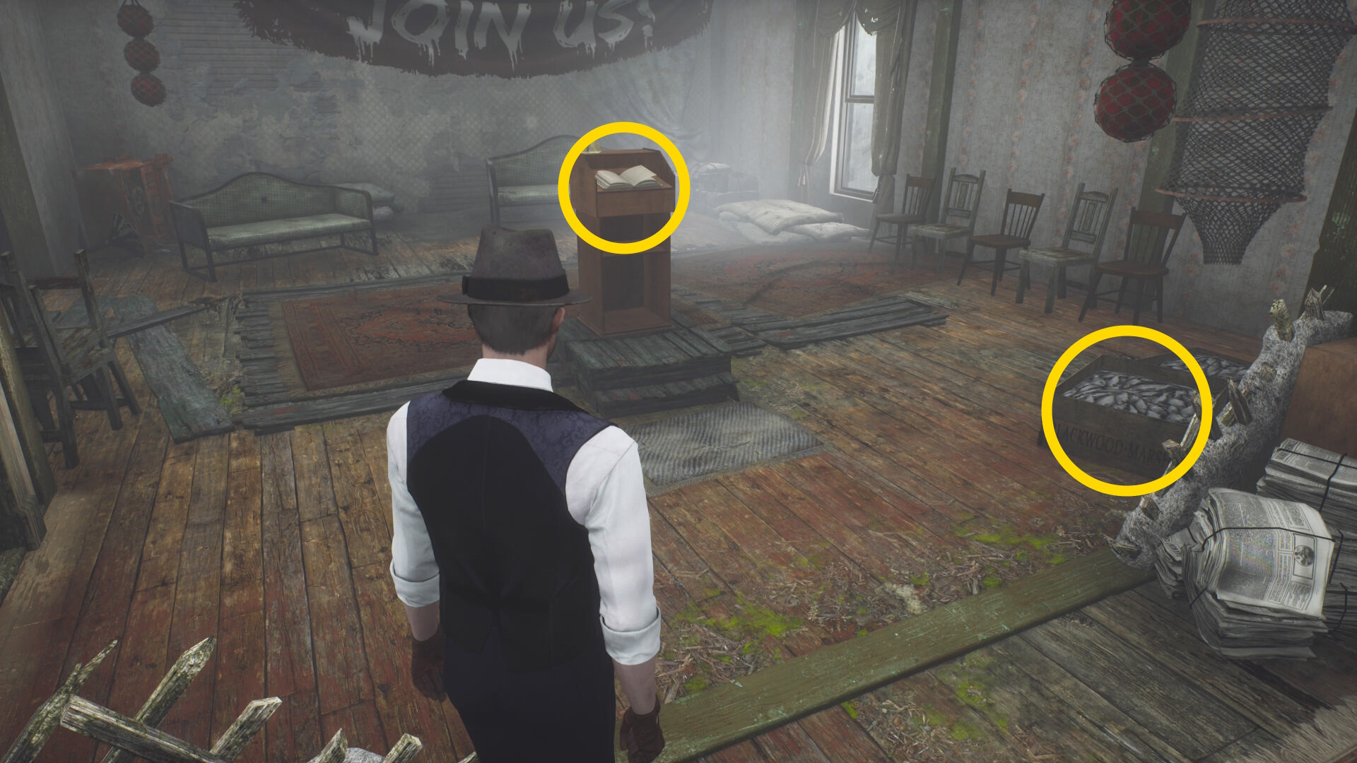 • インスマス人の遺体を調べ、左の積まれた机をよじ登って1階へ