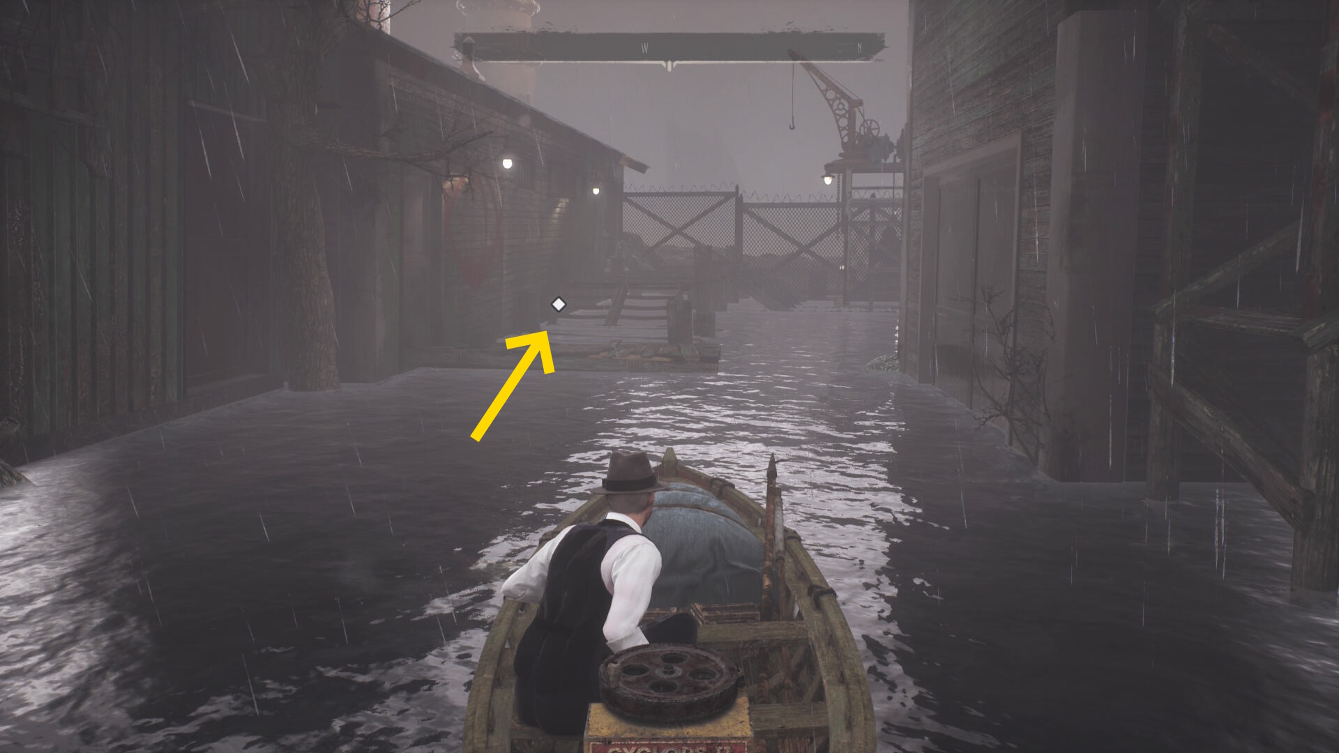 • ファストトラベルポイント「リードハイツ 西」の東側、ボートに乗って「ブラックウッドの浸水した事務所」に向かう