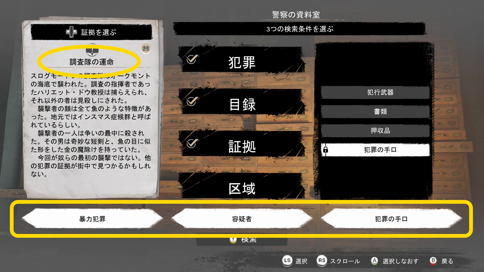 - 証拠を「調査隊の運命」にし、以下の条件にして検索