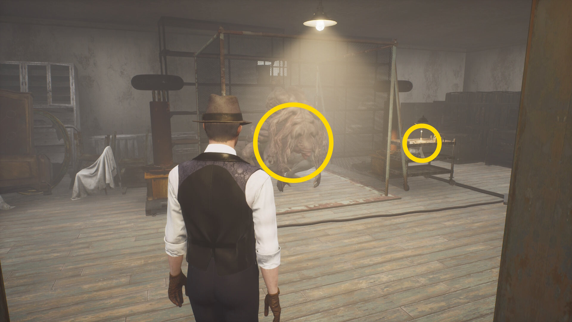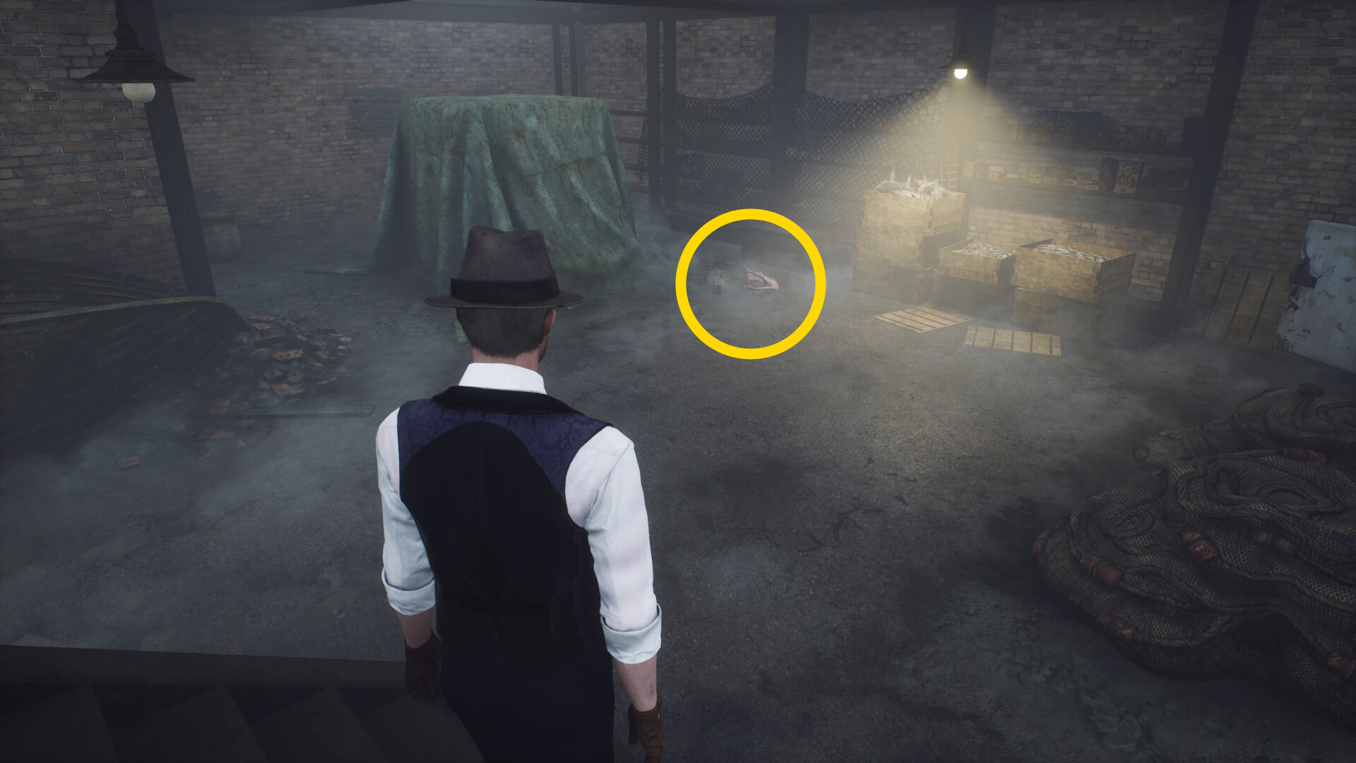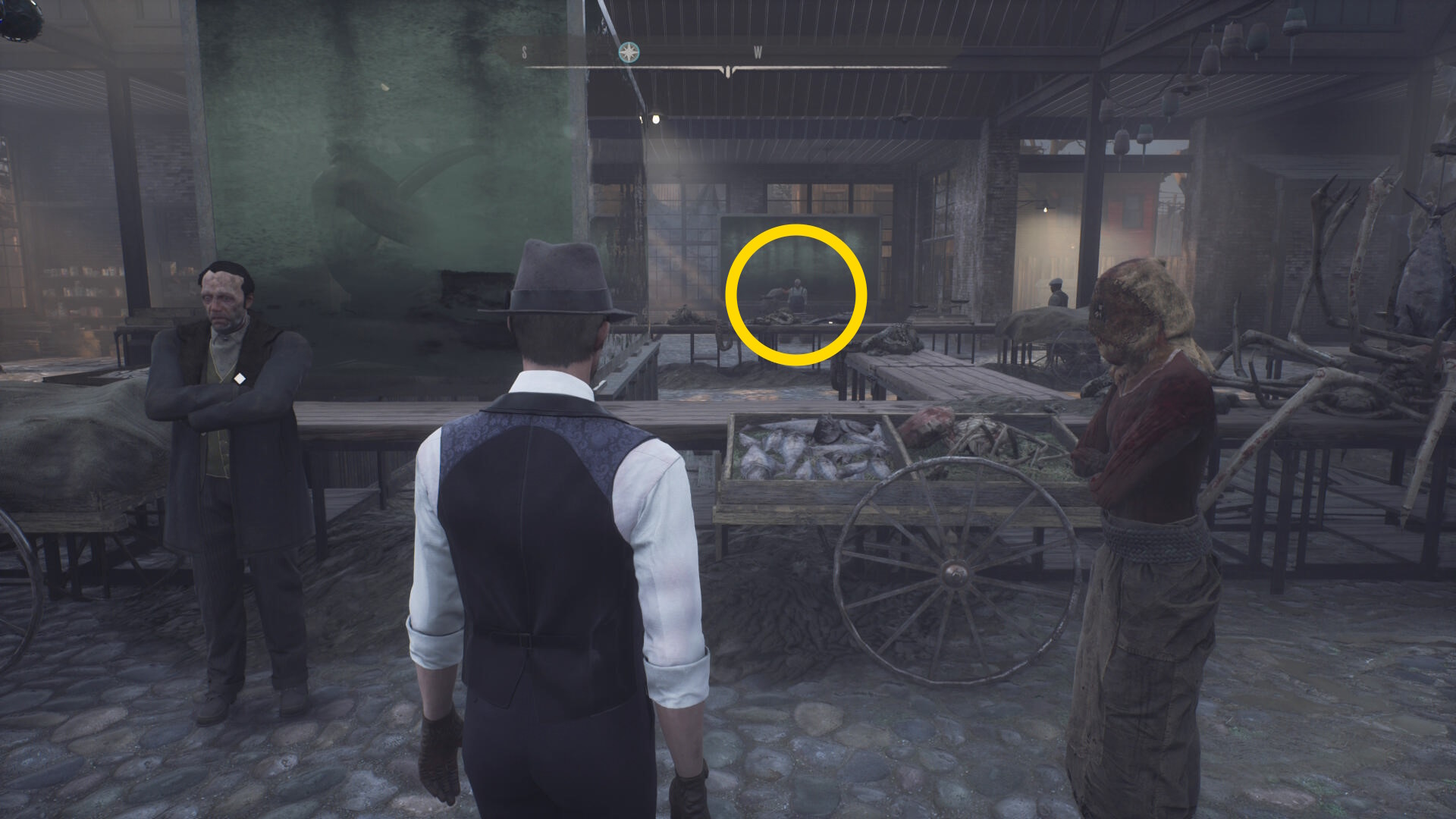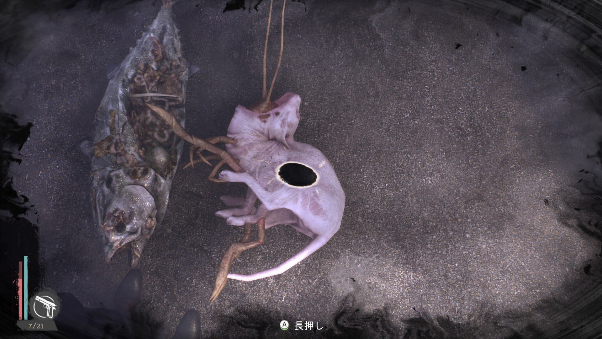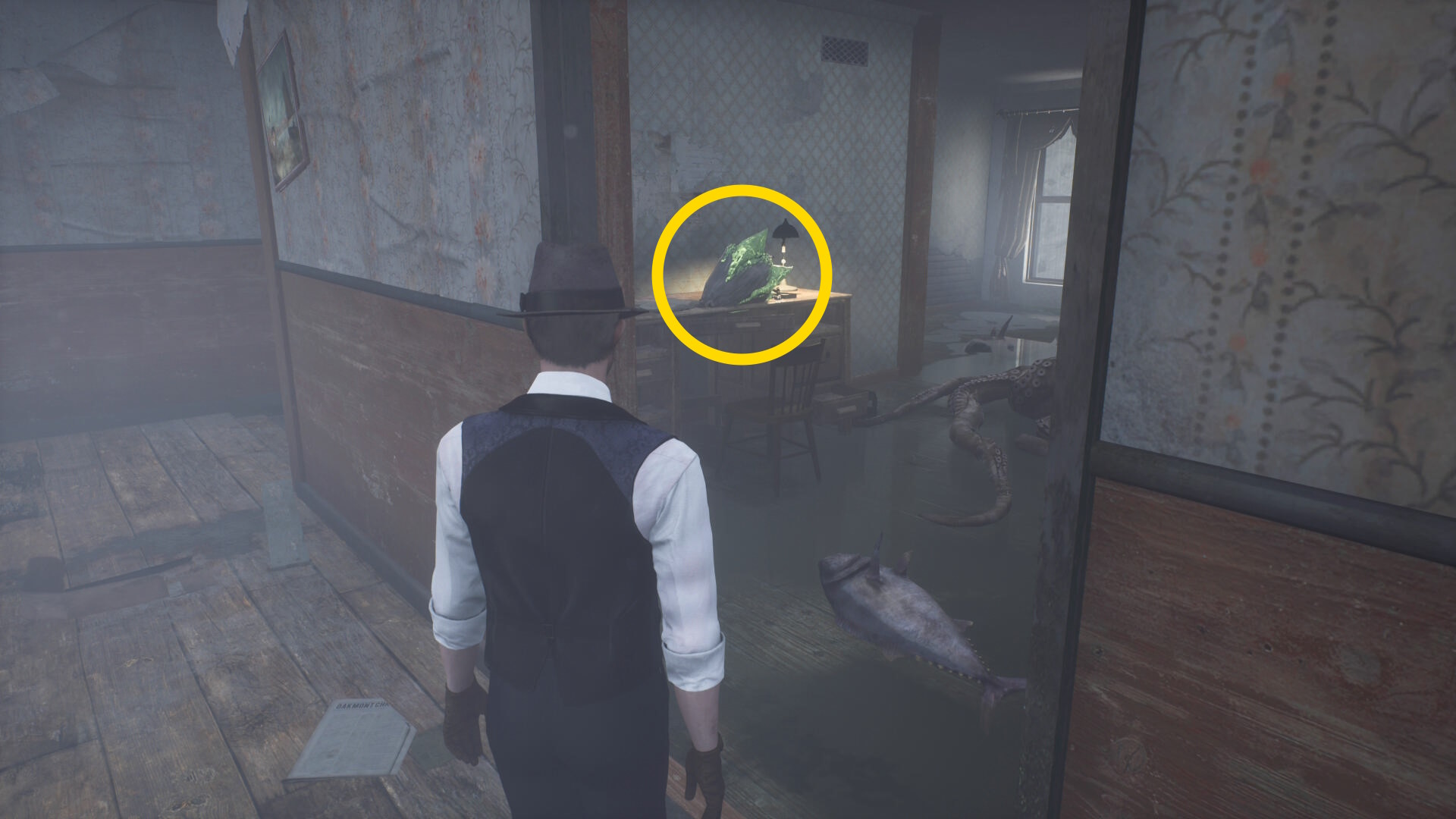 - キル後、入口近くの銛とその奥にある魚を調べる