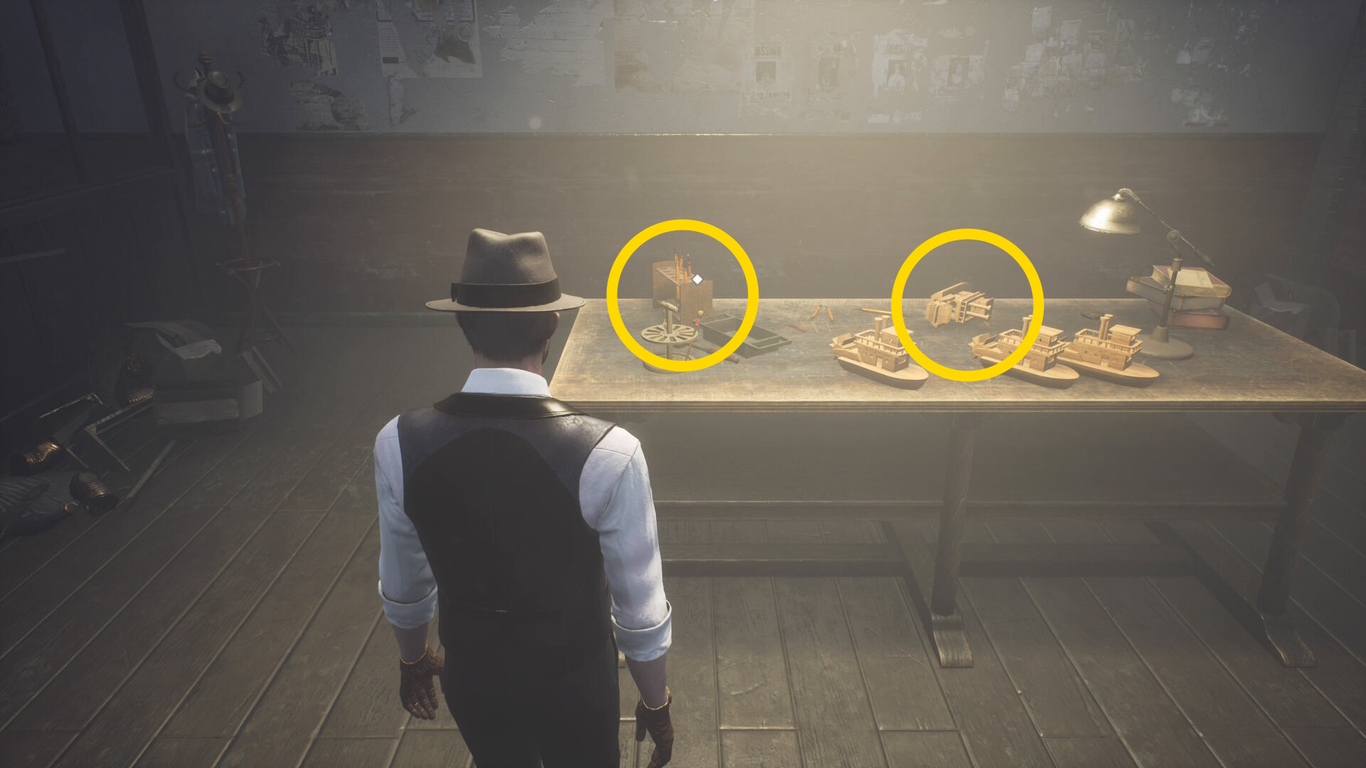 - 奥に工作テーブルがあり、工作道具と船のおもちゃを調べる