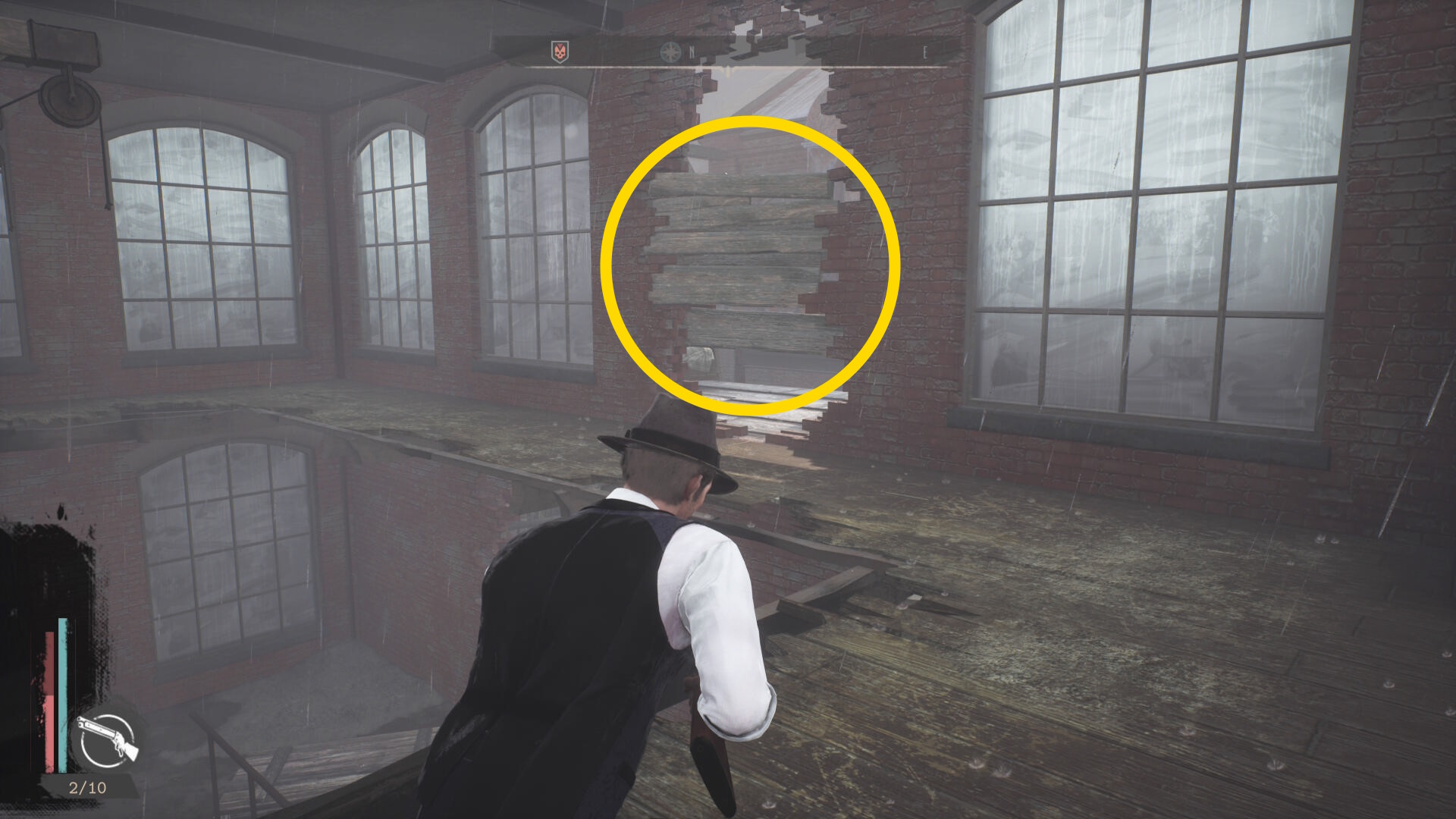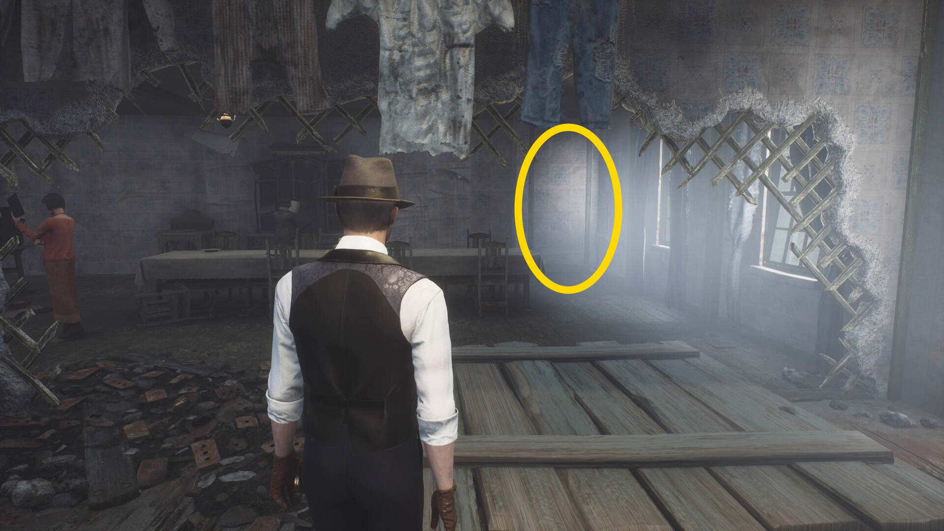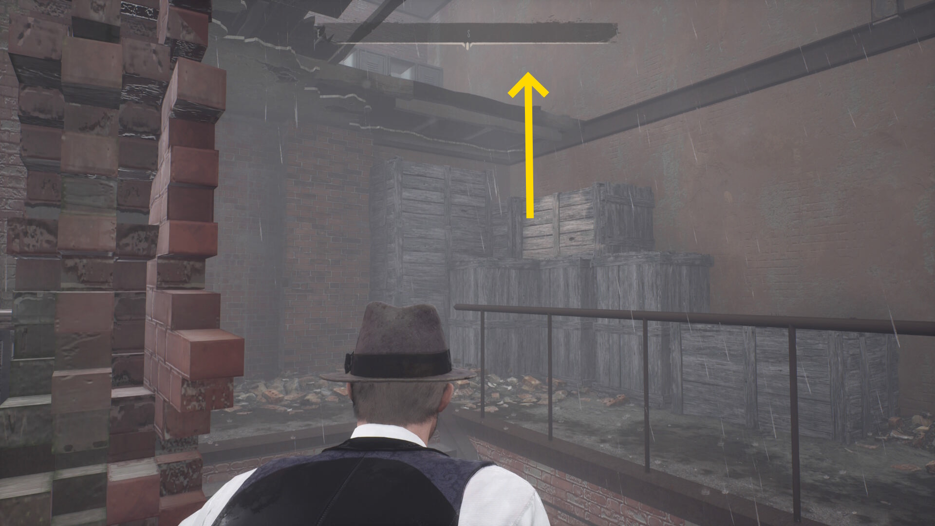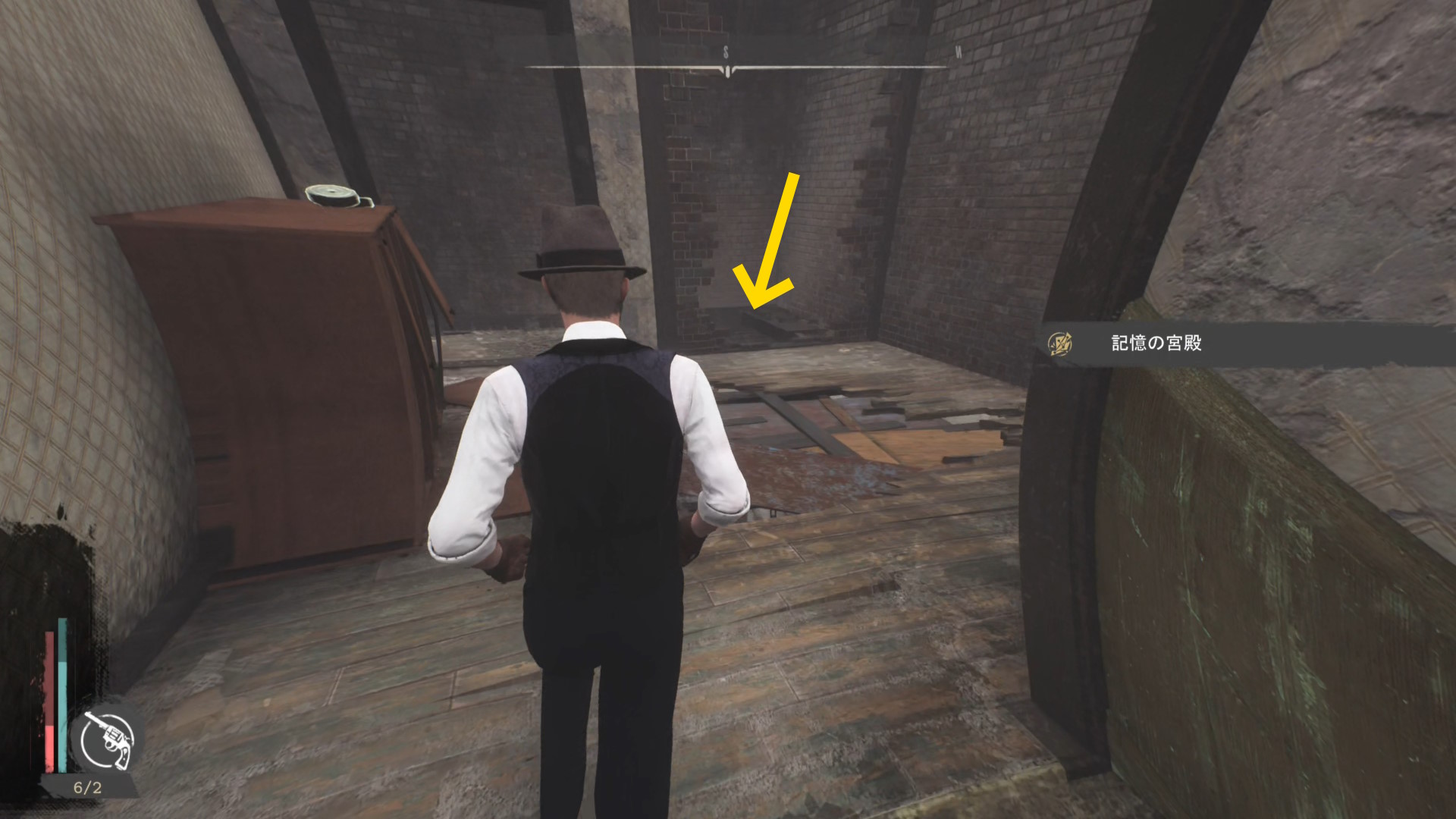 - 殲滅後、手すりを越えて左を向くと板張りされた開口部があるのでそちらへ
