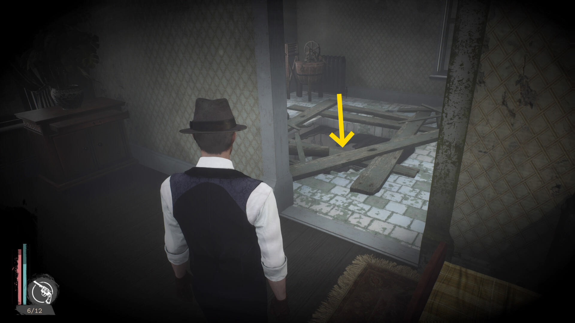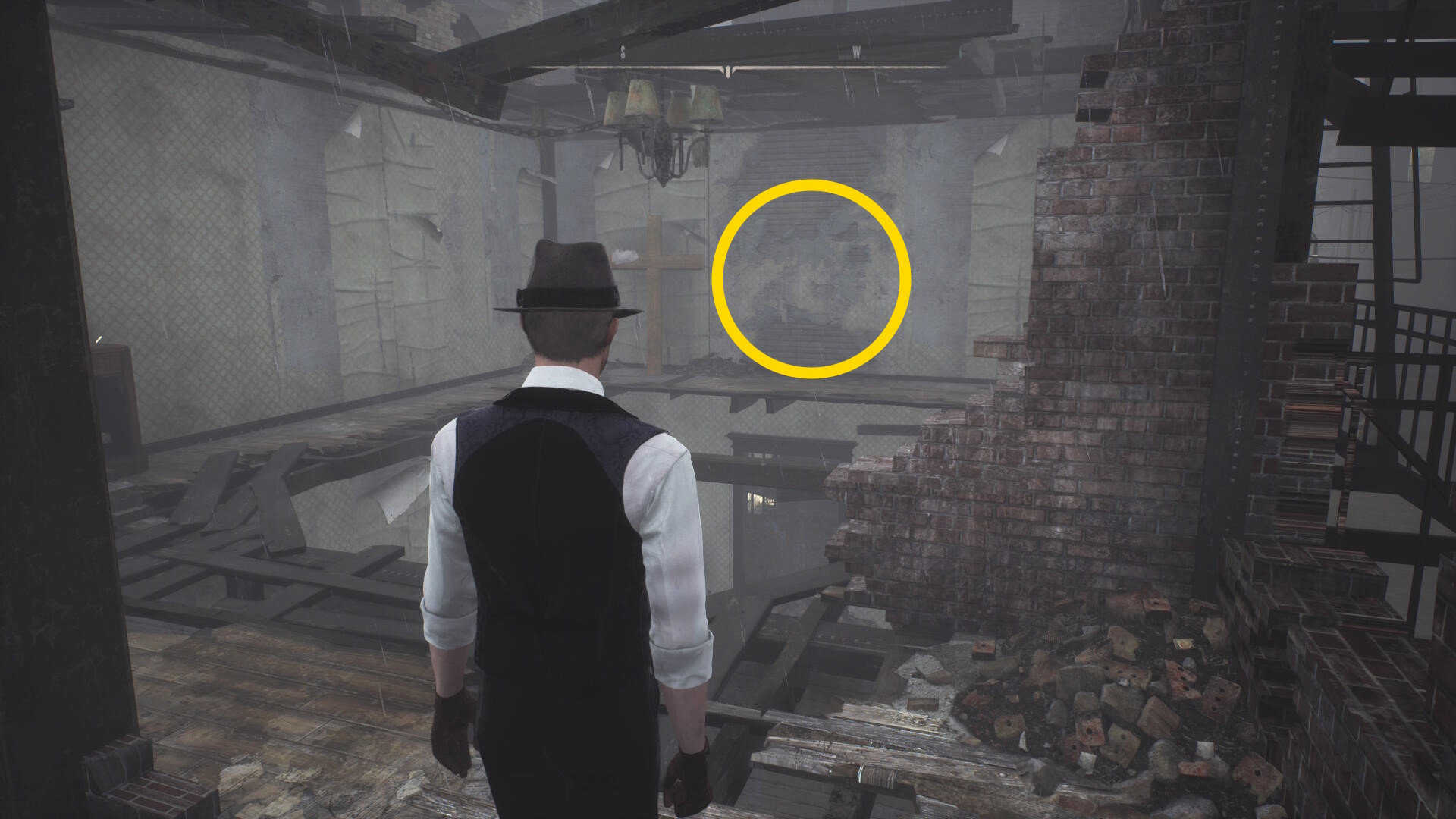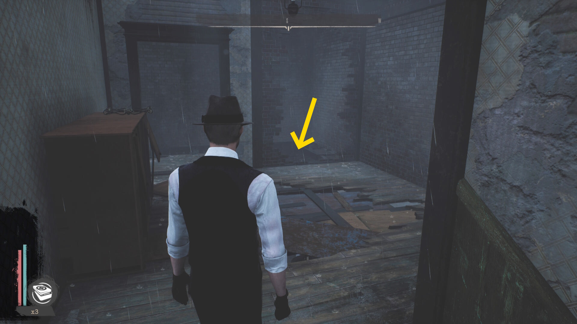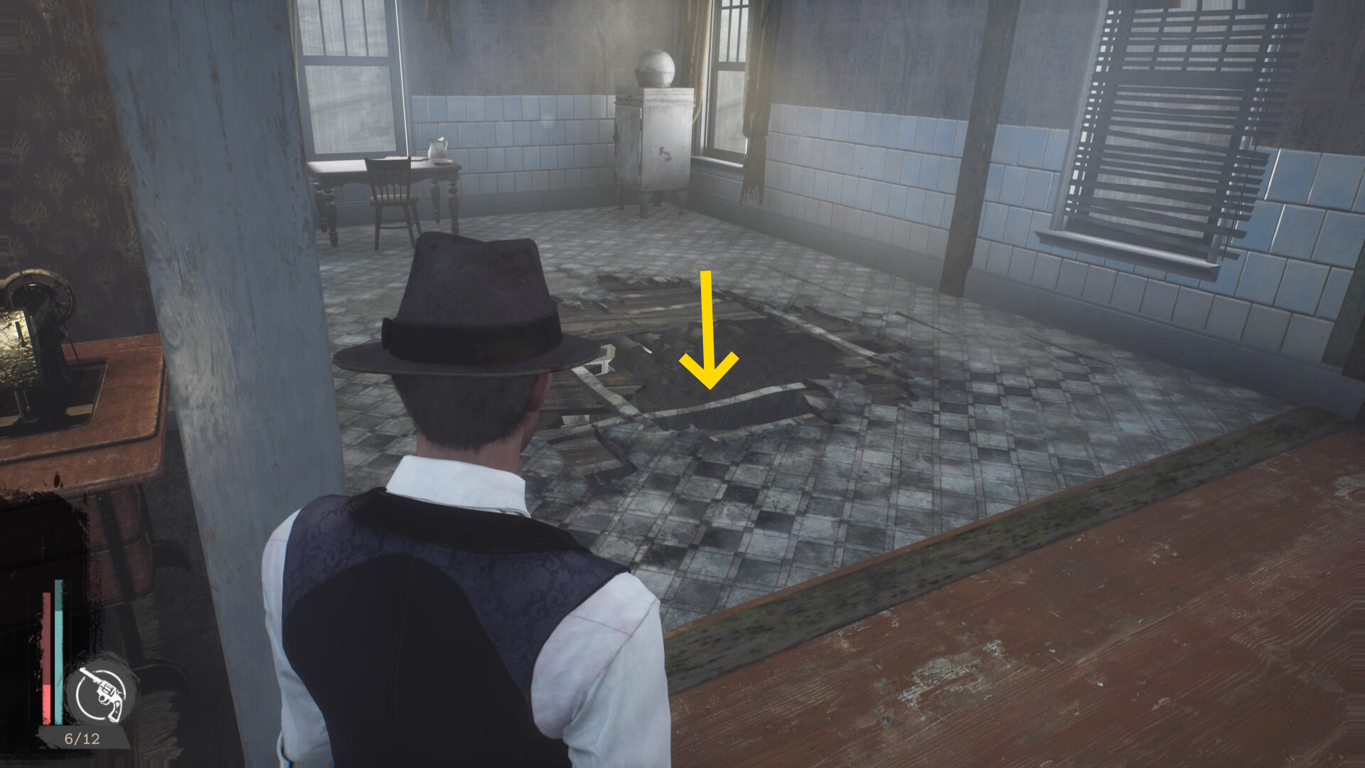 - 殲滅後、手すりを越えて左を向くと板張りされた開口部があるのでそちらへ