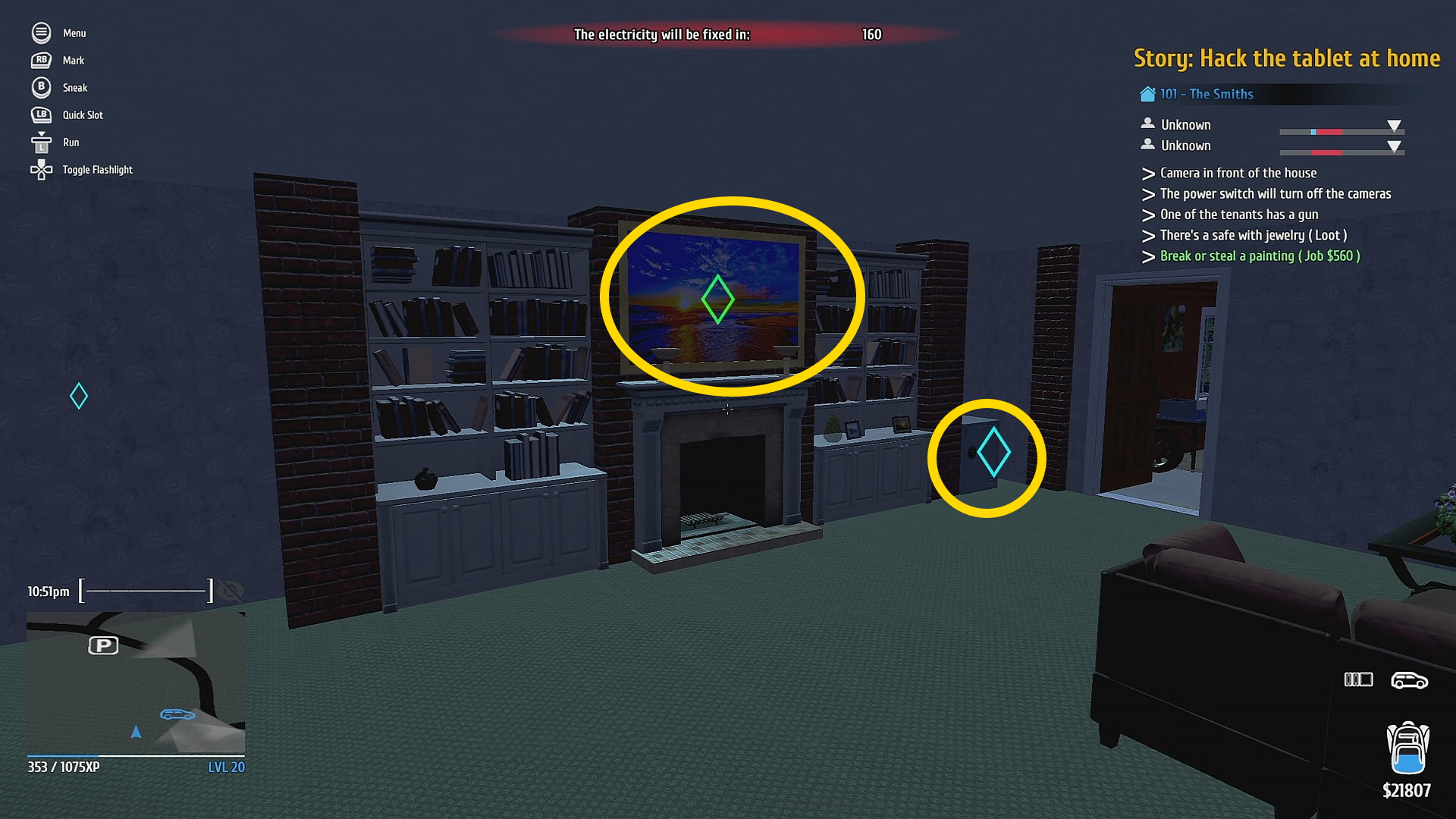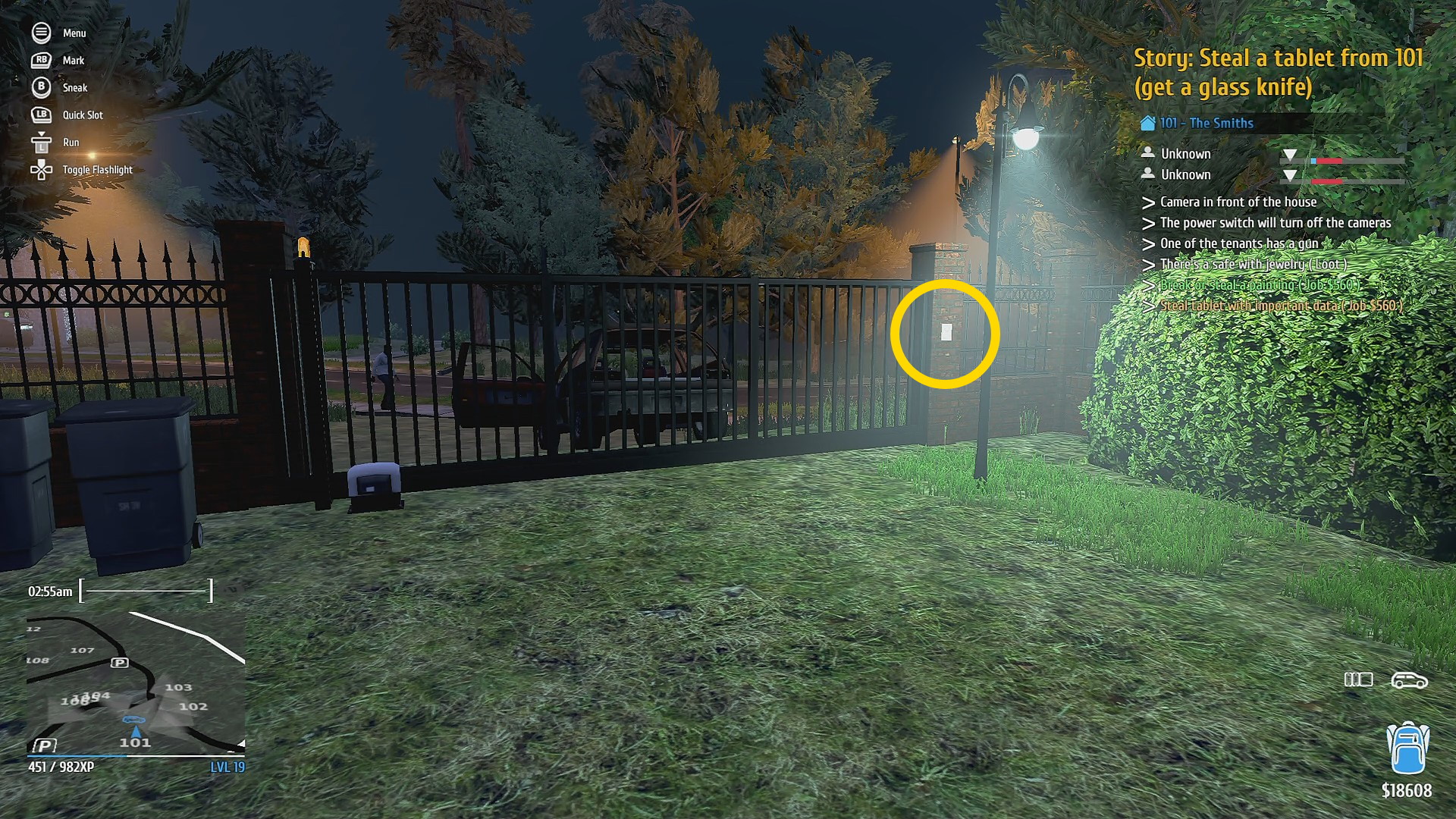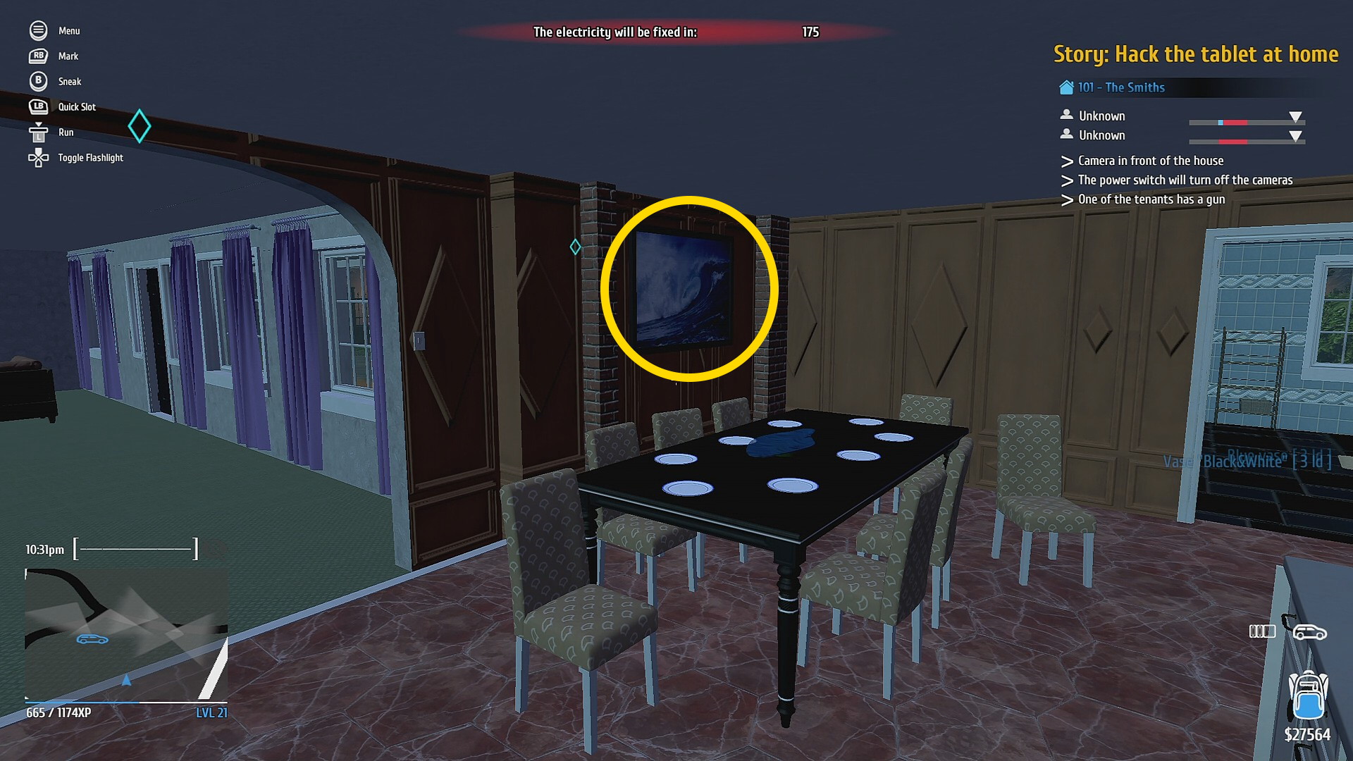 - 正面玄関を Mini Electric Lockpick で解錠し、2階へ (家に入る前、ゲートを開けておくと後で脱出がスムーズ)