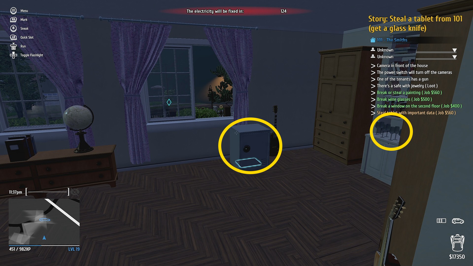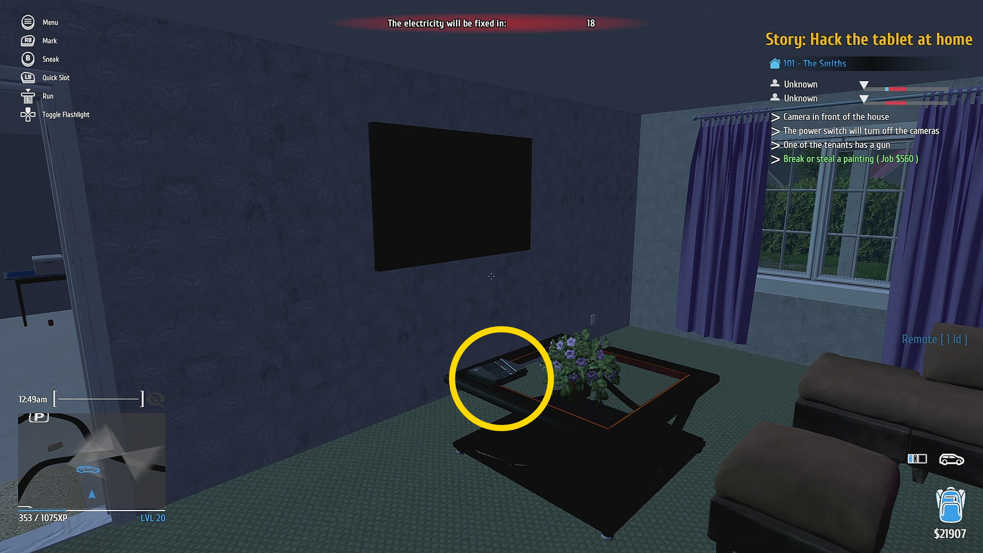 - まず右側のガラステーブルに置かれたゲーム機を回収 ⇒ (ゲーム機を盗む:2/5)