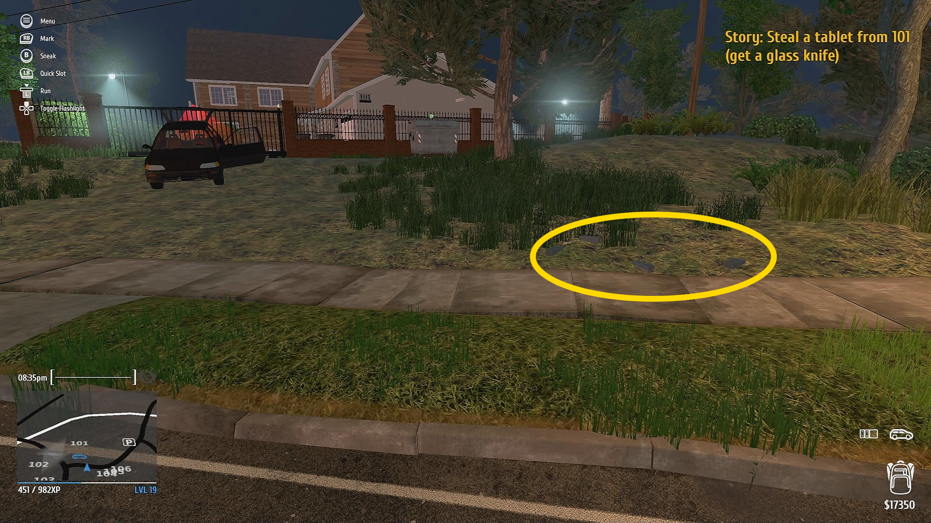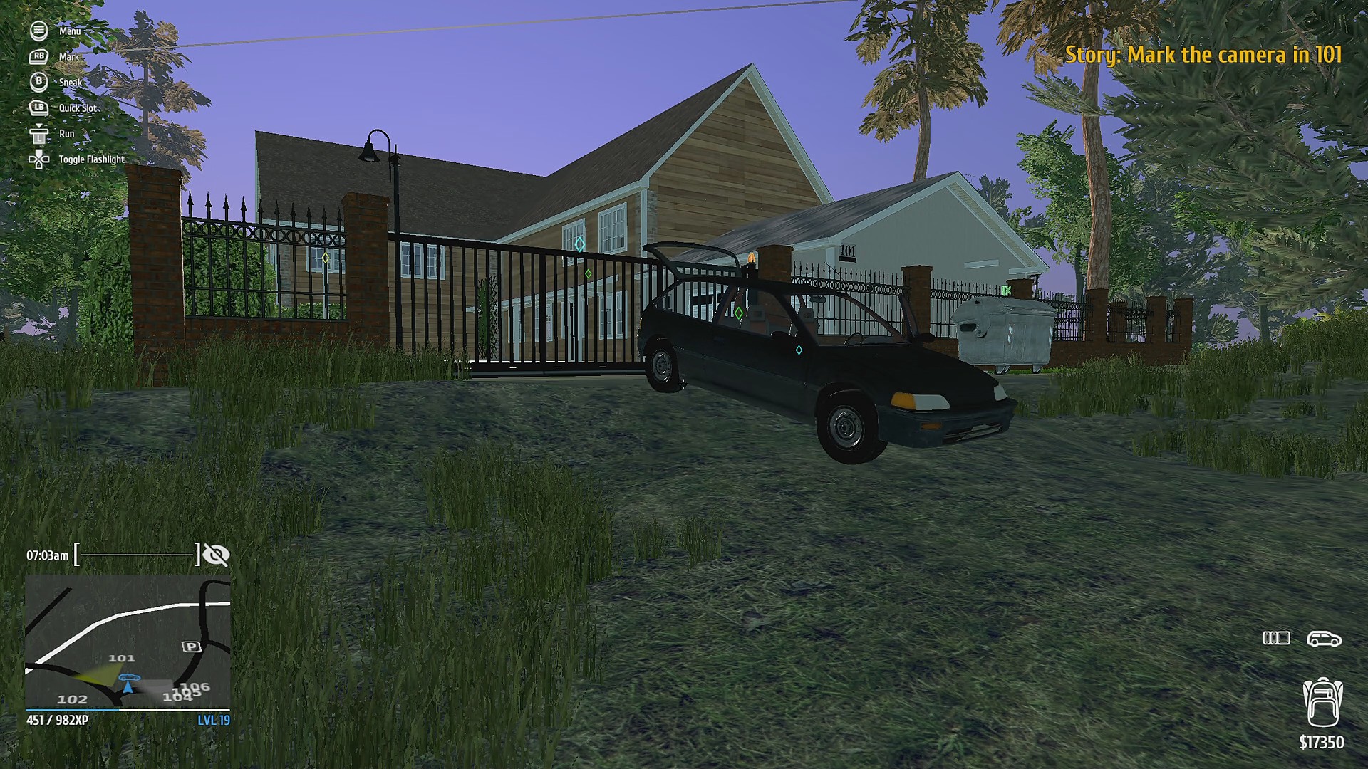 - 自宅の左側に盗んだ車が停まっているので近づいて X を押すと車が自宅内に移動する