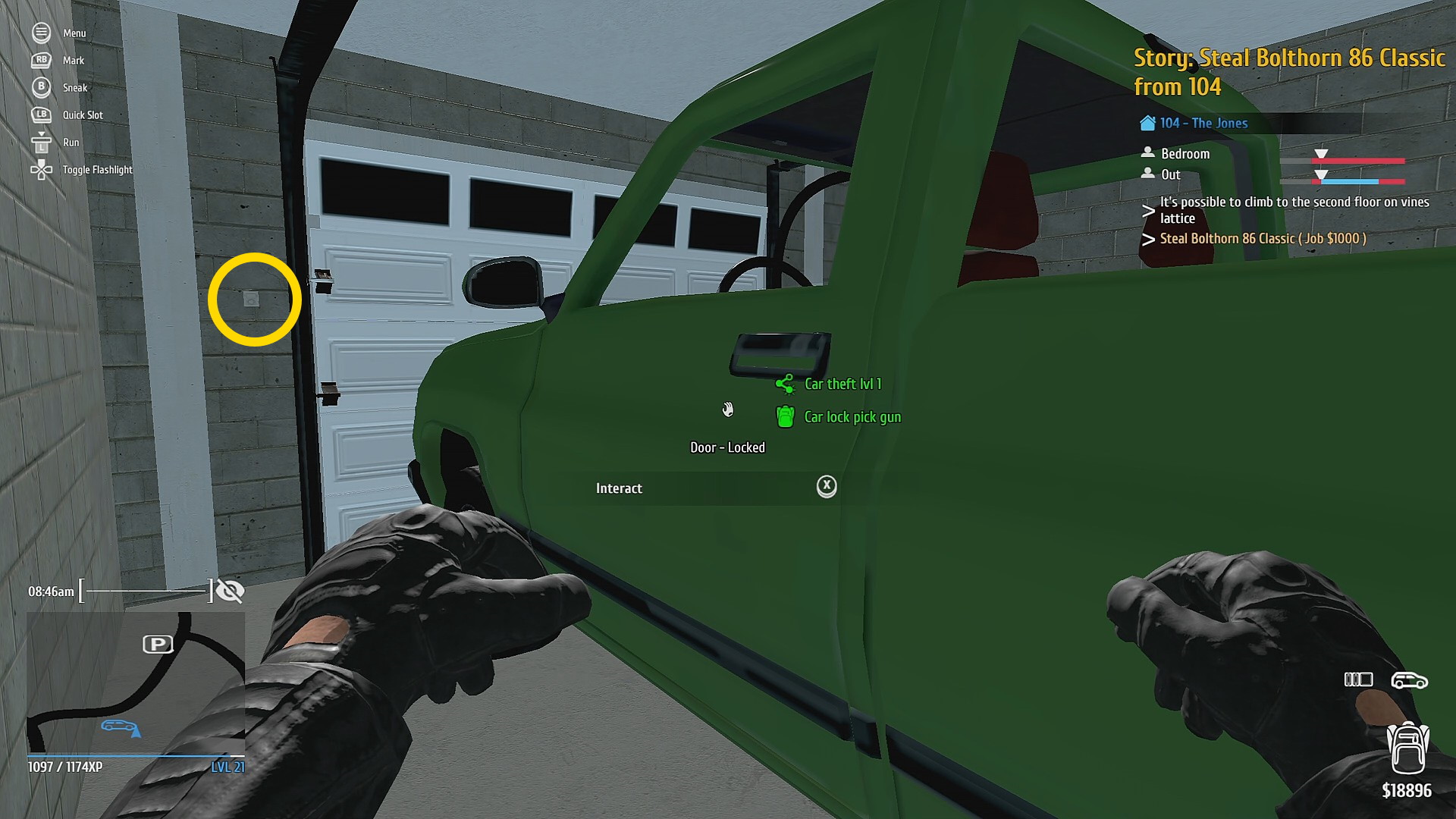 - 車に乗り込み、Car lock pick gun を使ってドアを解錠 (ドリル音が割と大きく、解錠まで時間がかかるので心配になるが大丈夫)