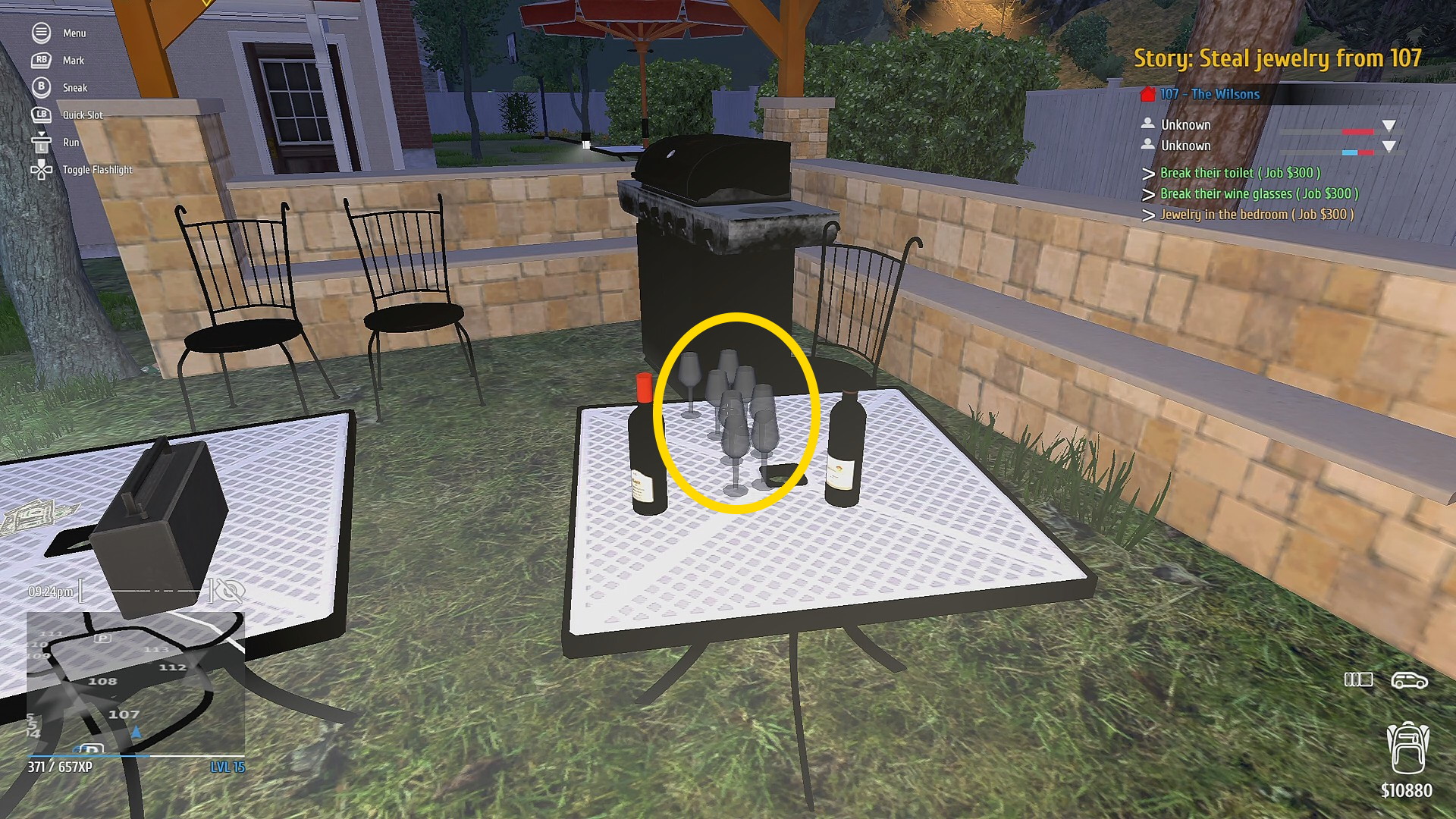 - 庭の奥にバーベキューコンロがあり、近くのテーブルにあるワイングラスをバールで破壊 (依頼)