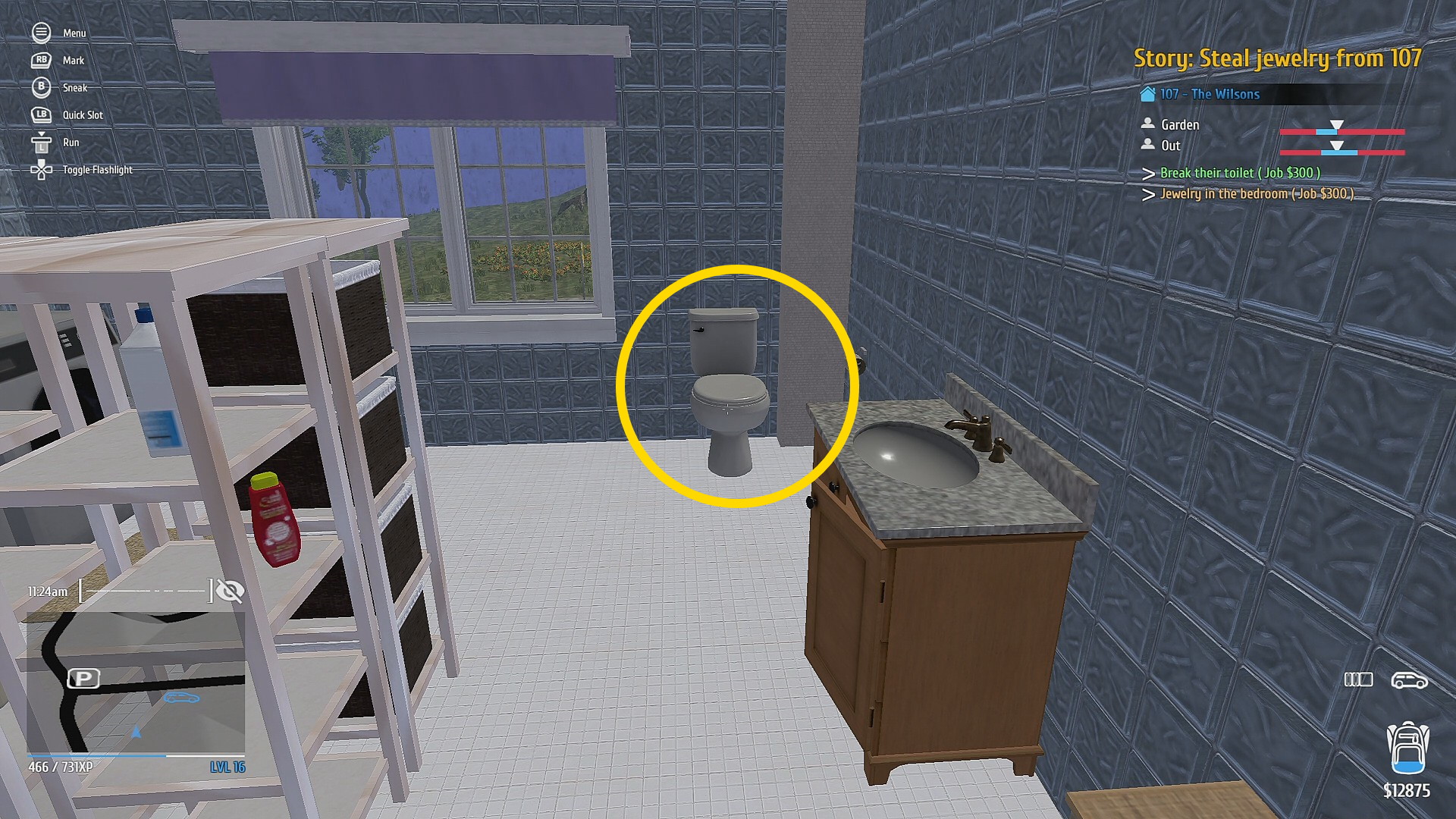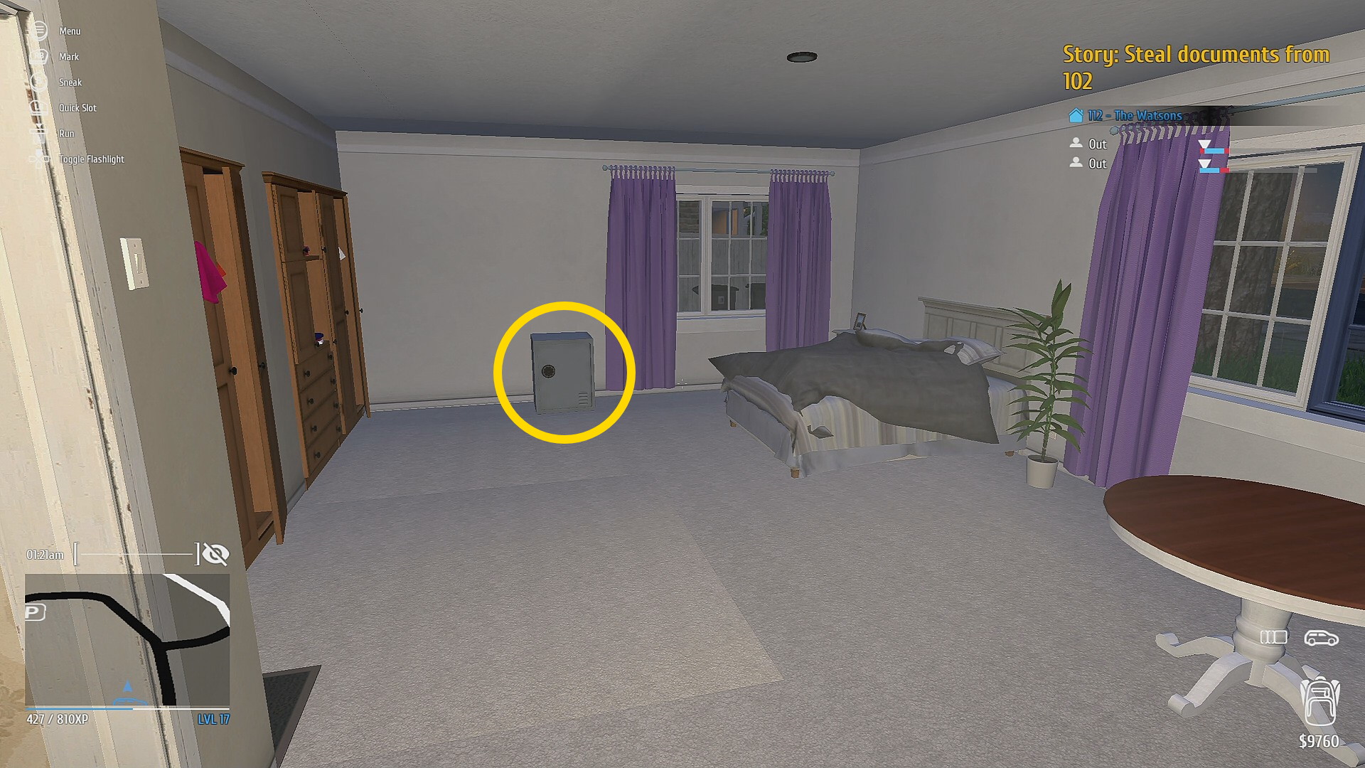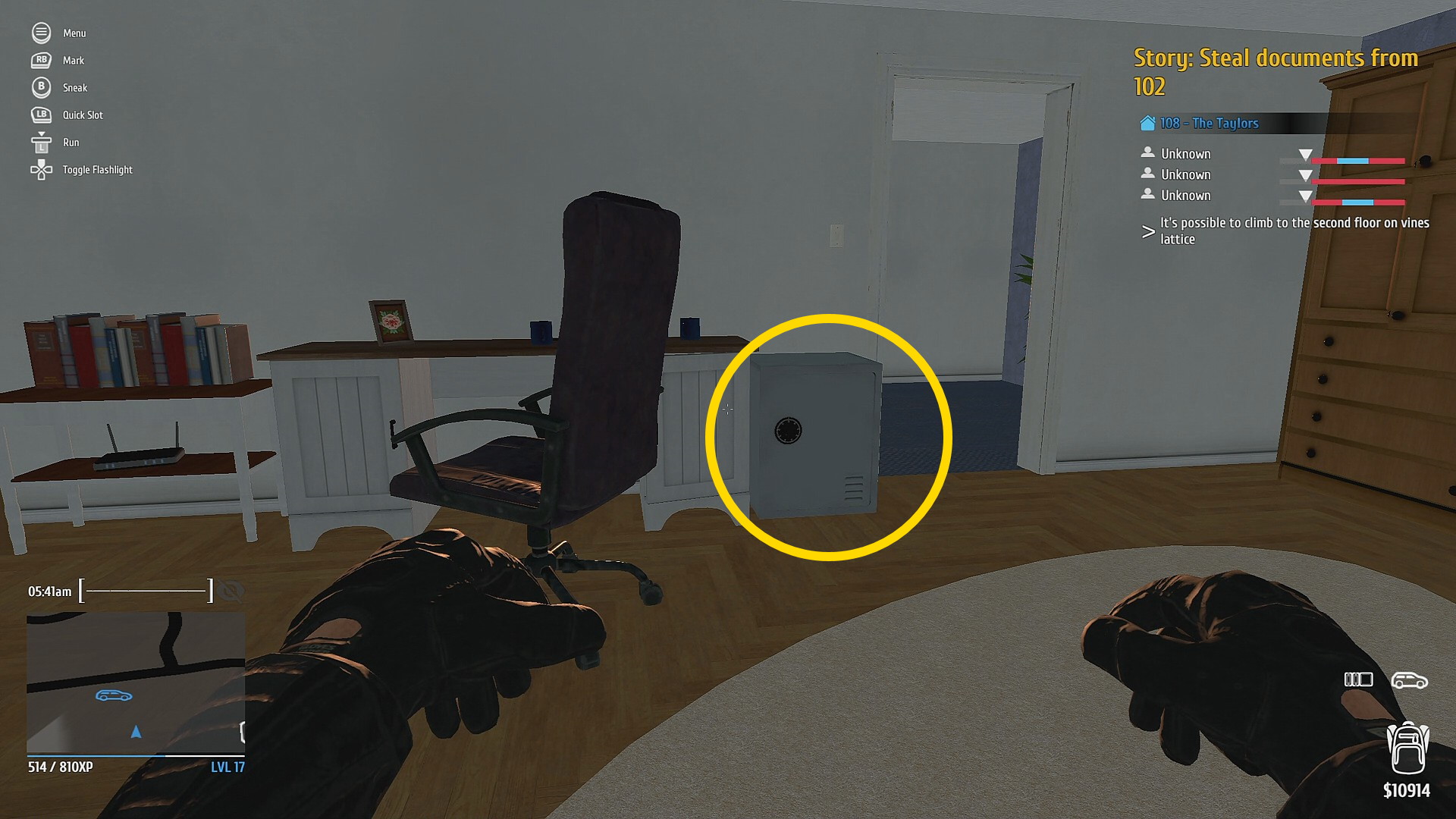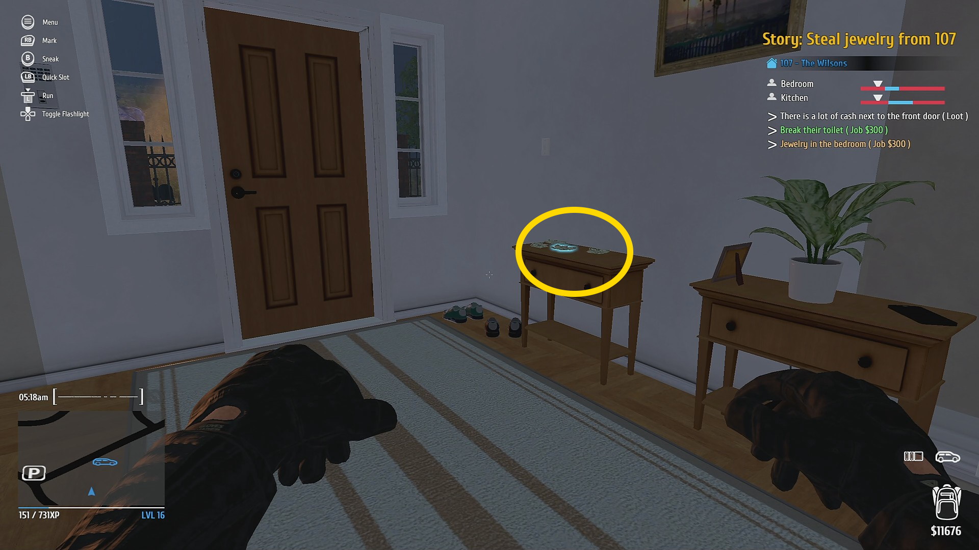 - 1階のドアは3箇所あり、すべて Mini Electric Lockpick で解錠する。窓ガラスを Glass Knife でカットして侵入する方法もある