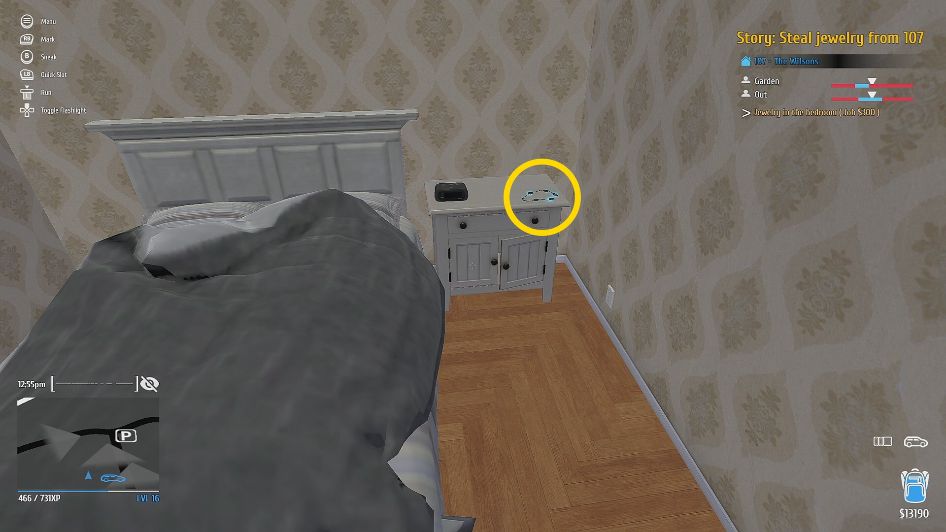 - 机を調べてアイテム回収しつつ、ベッド脇のナイトテーブルに置かれた宝石を回収