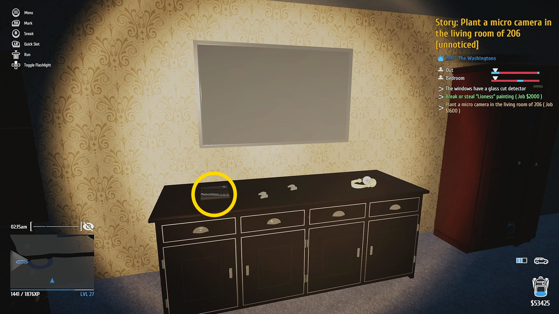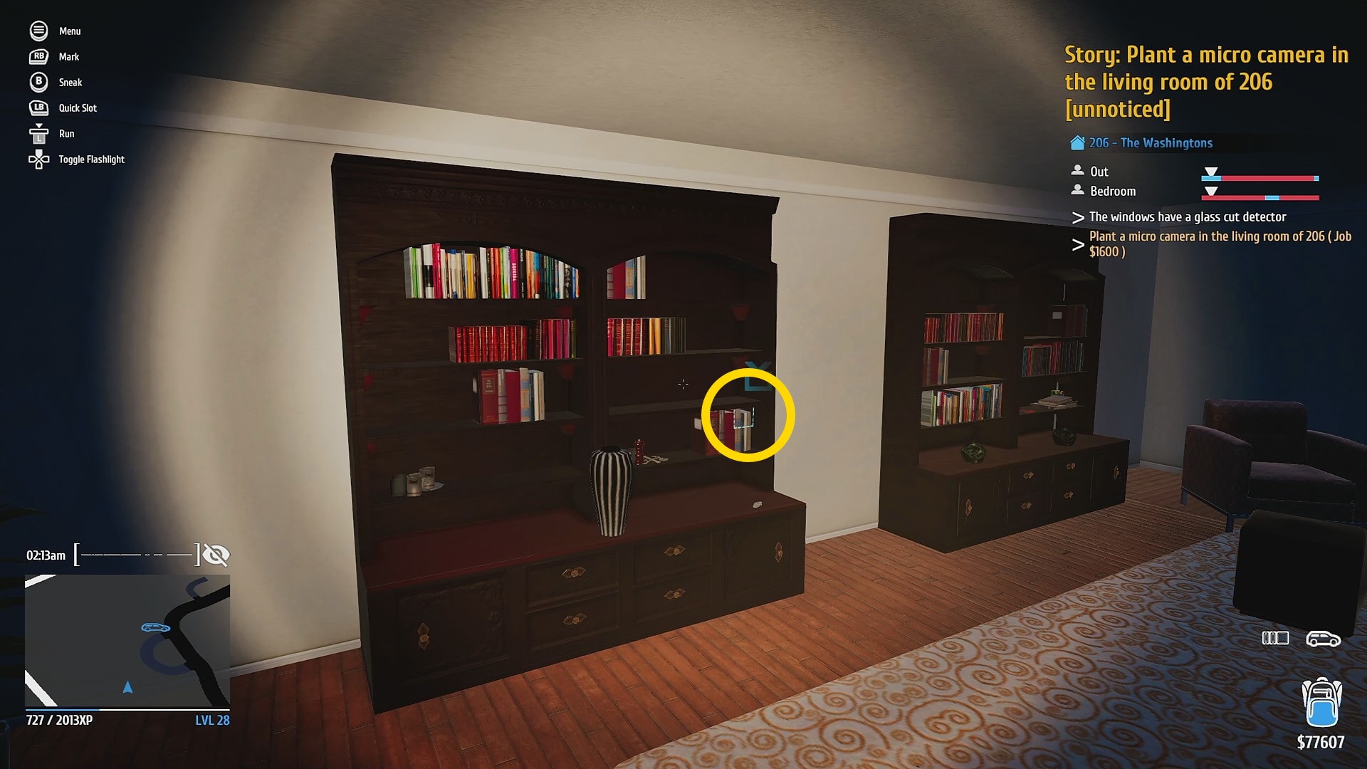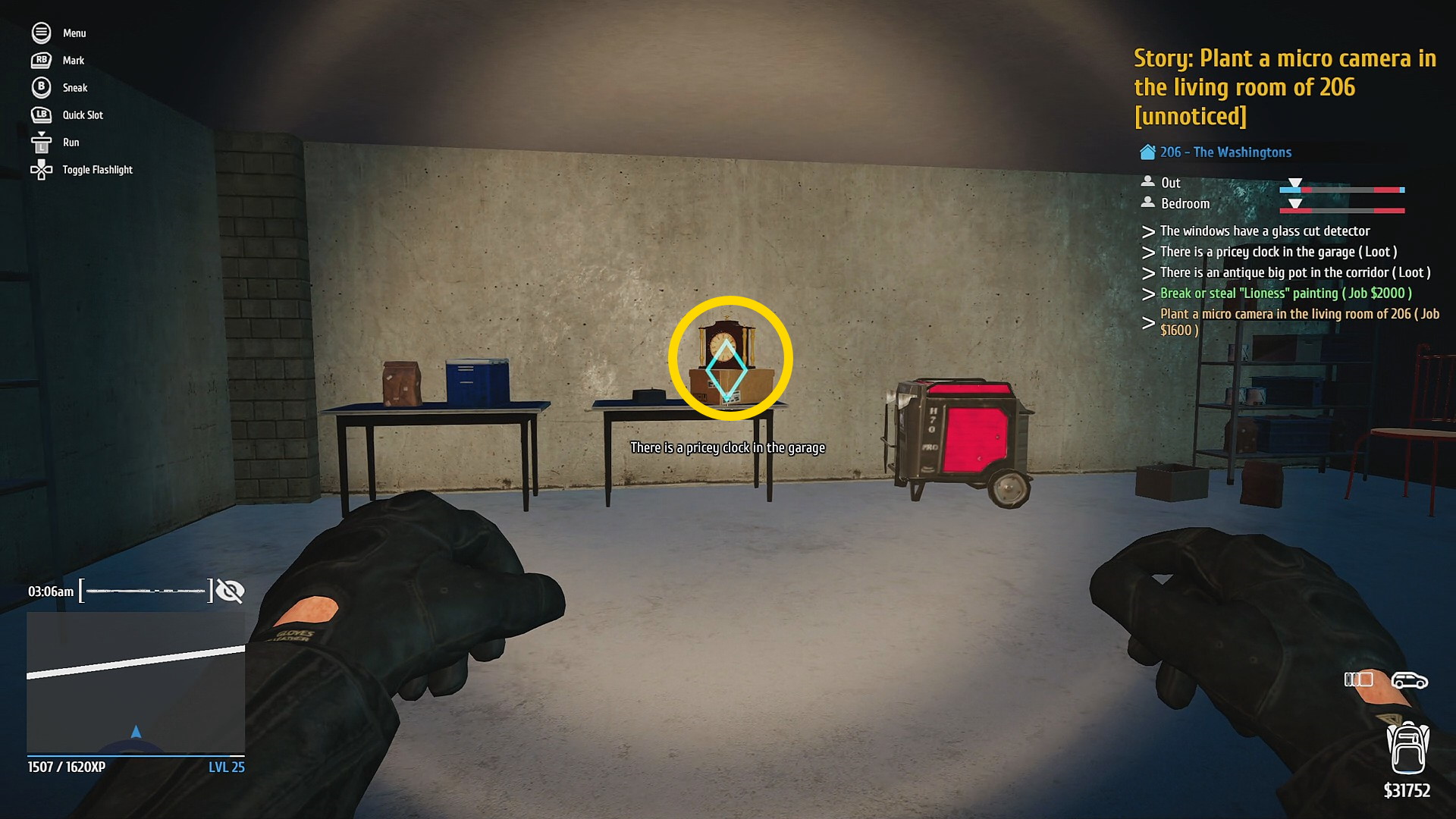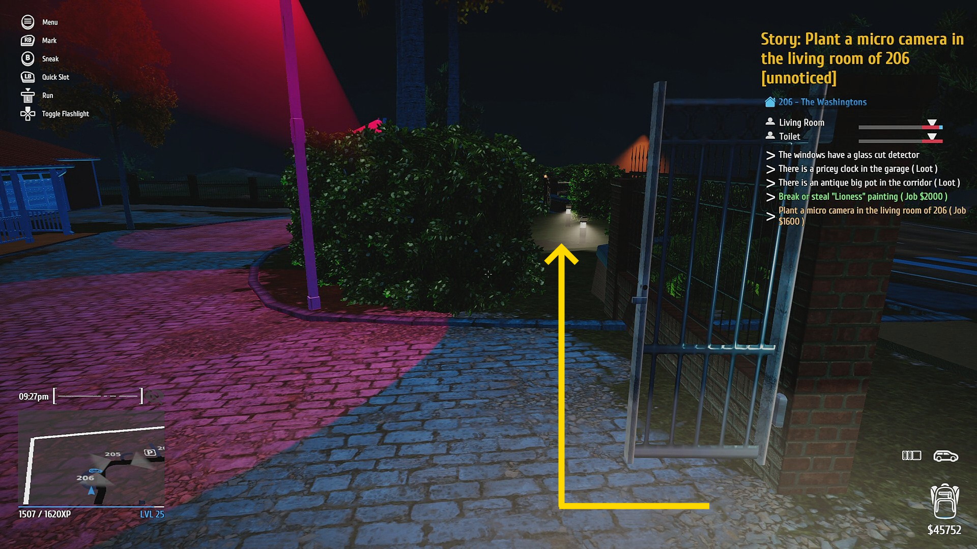 • 玄関を Hacking PDA で解錠 (タブレットやスマホのロック解除するミニゲーム。道路から奥まっているので通行人には怪しまれないのでゆっくり取り組もう)