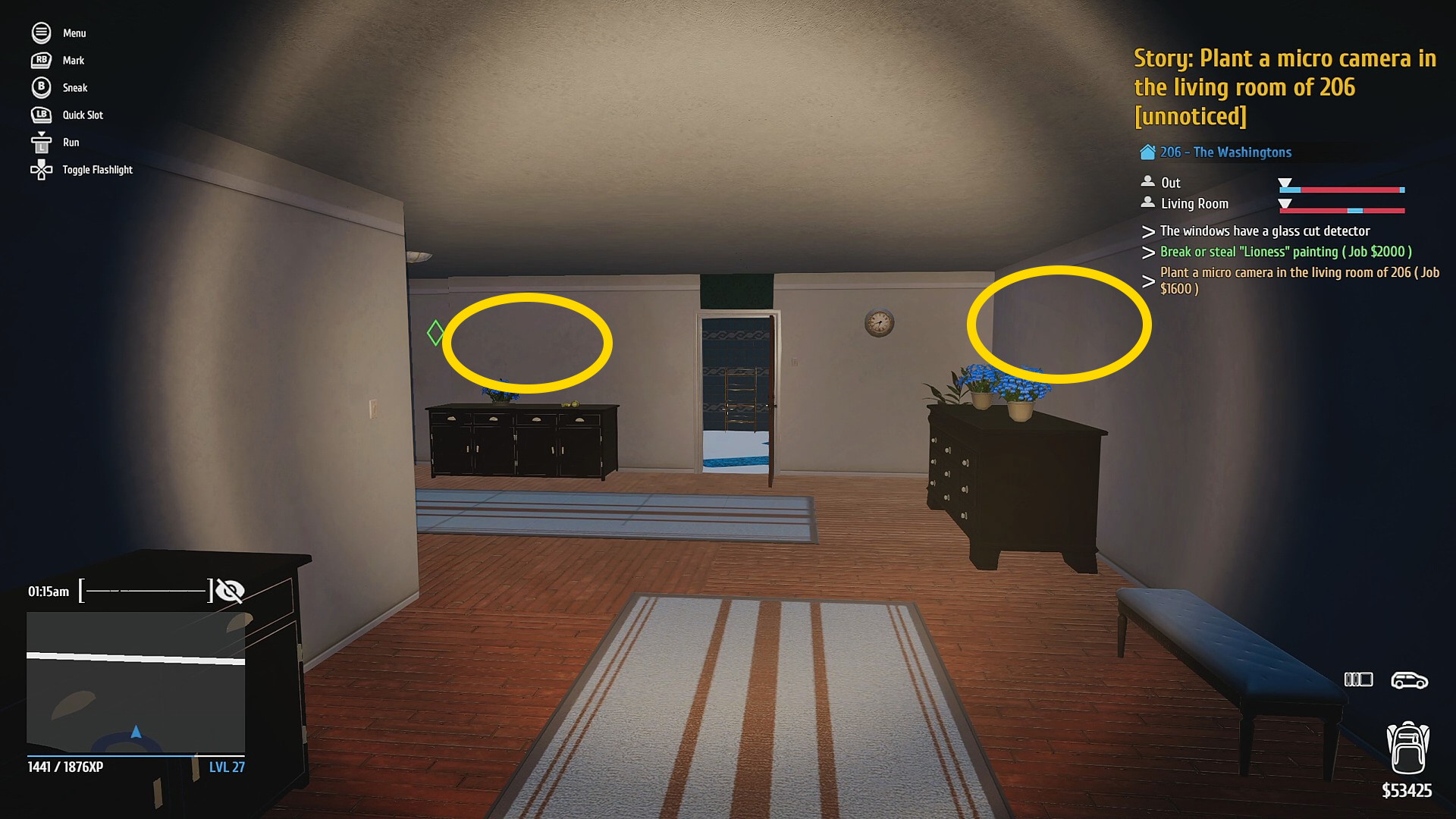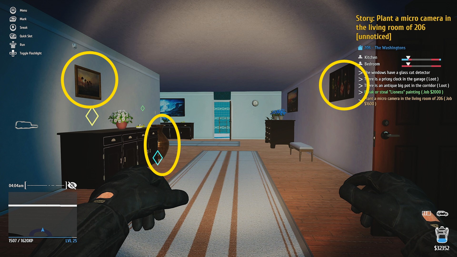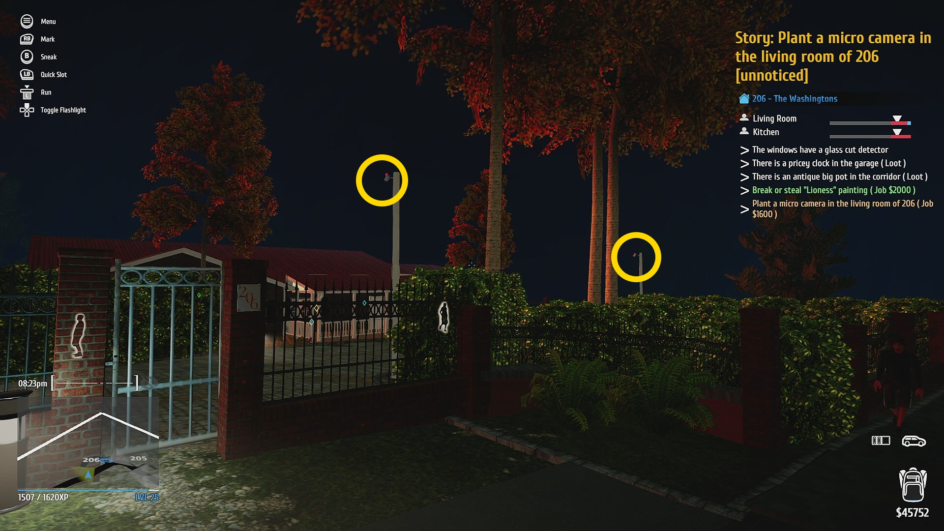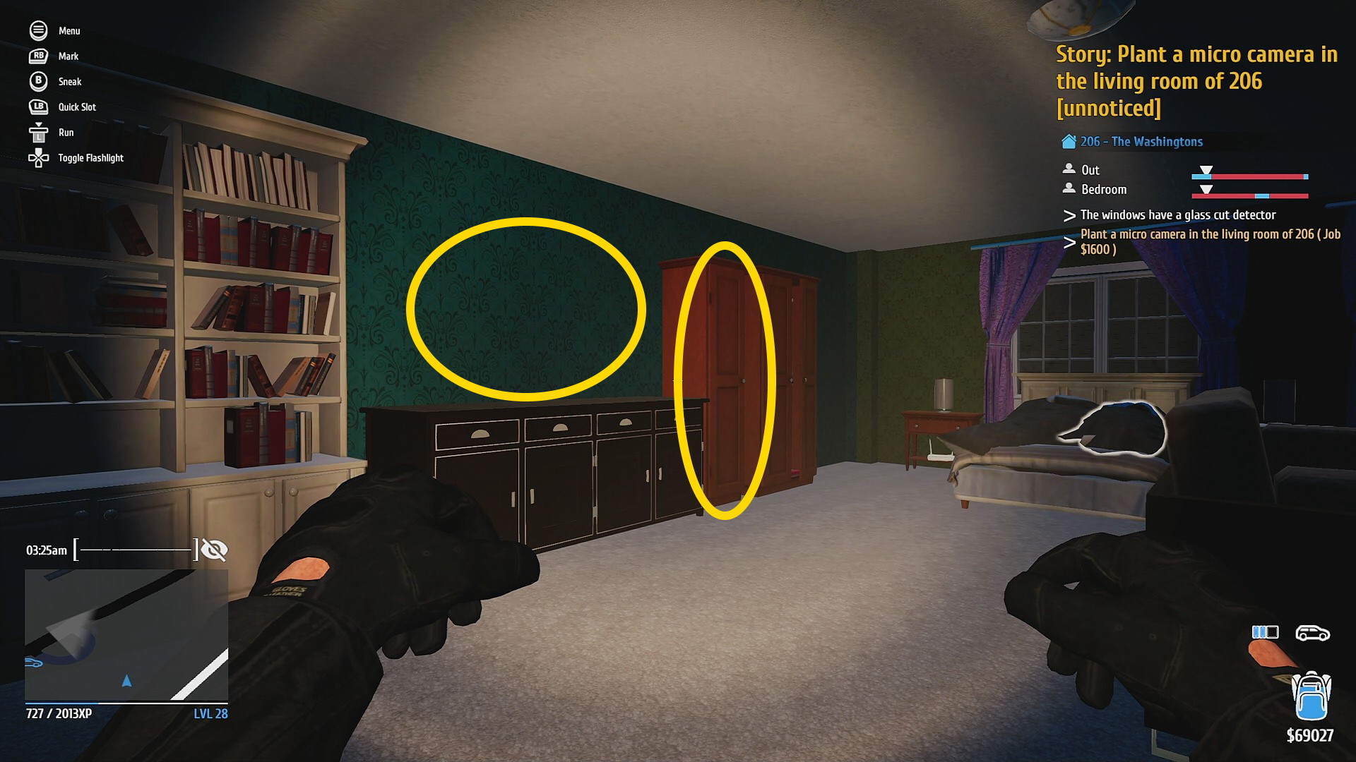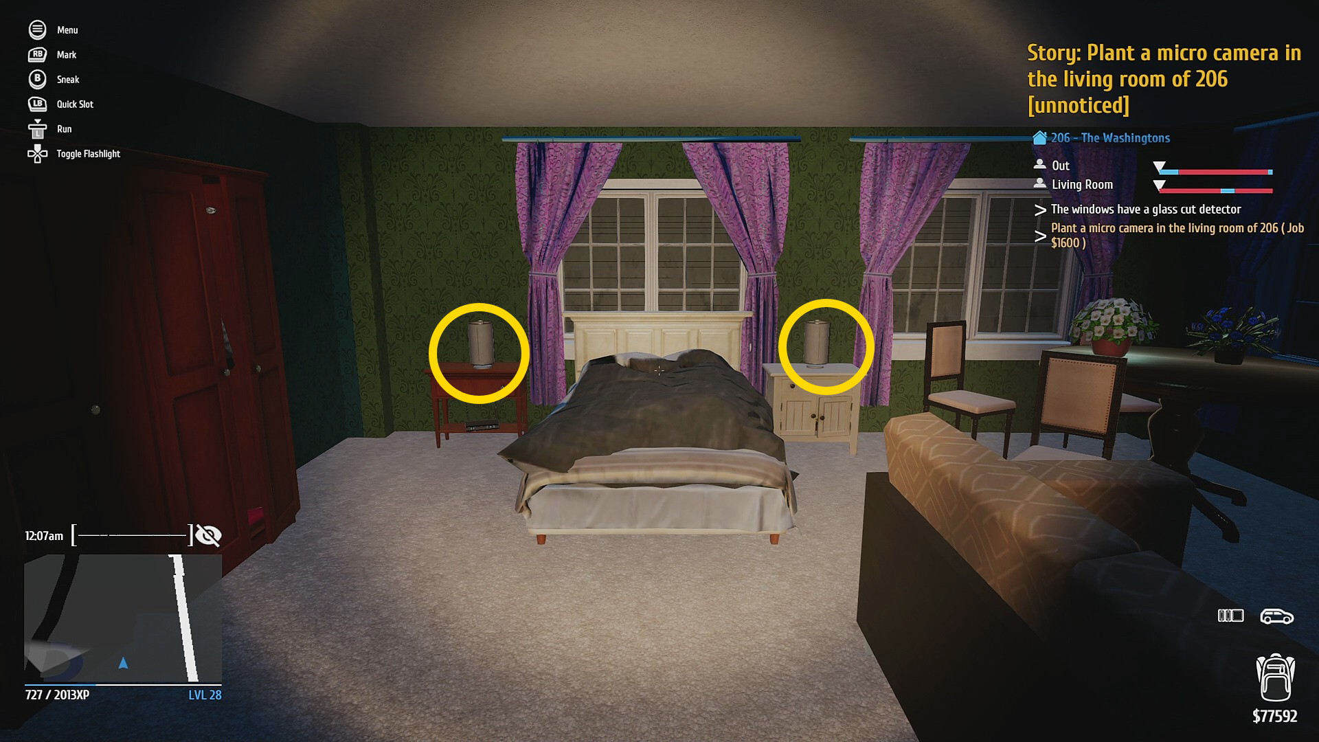 • 玄関を Hacking PDA で解錠 (タブレットやスマホのロック解除するミニゲーム。道路から奥まっているので通行人には怪しまれないのでゆっくり取り組もう)