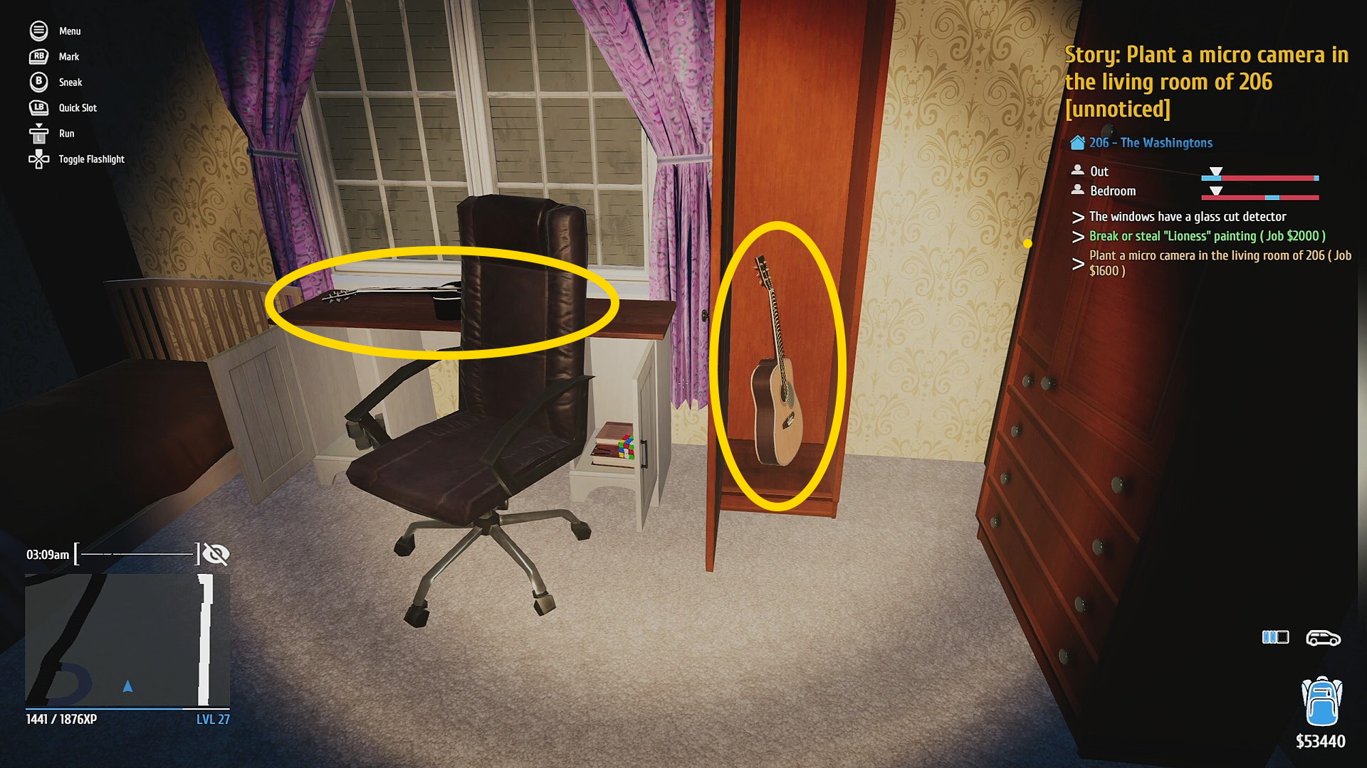• 旦那が寝室に入る午前2時までは復活したアイテムを回収してまわる (価値と売却額が高い書斎の黒いギター、寝室のトロンボーンなどを中心に回収)