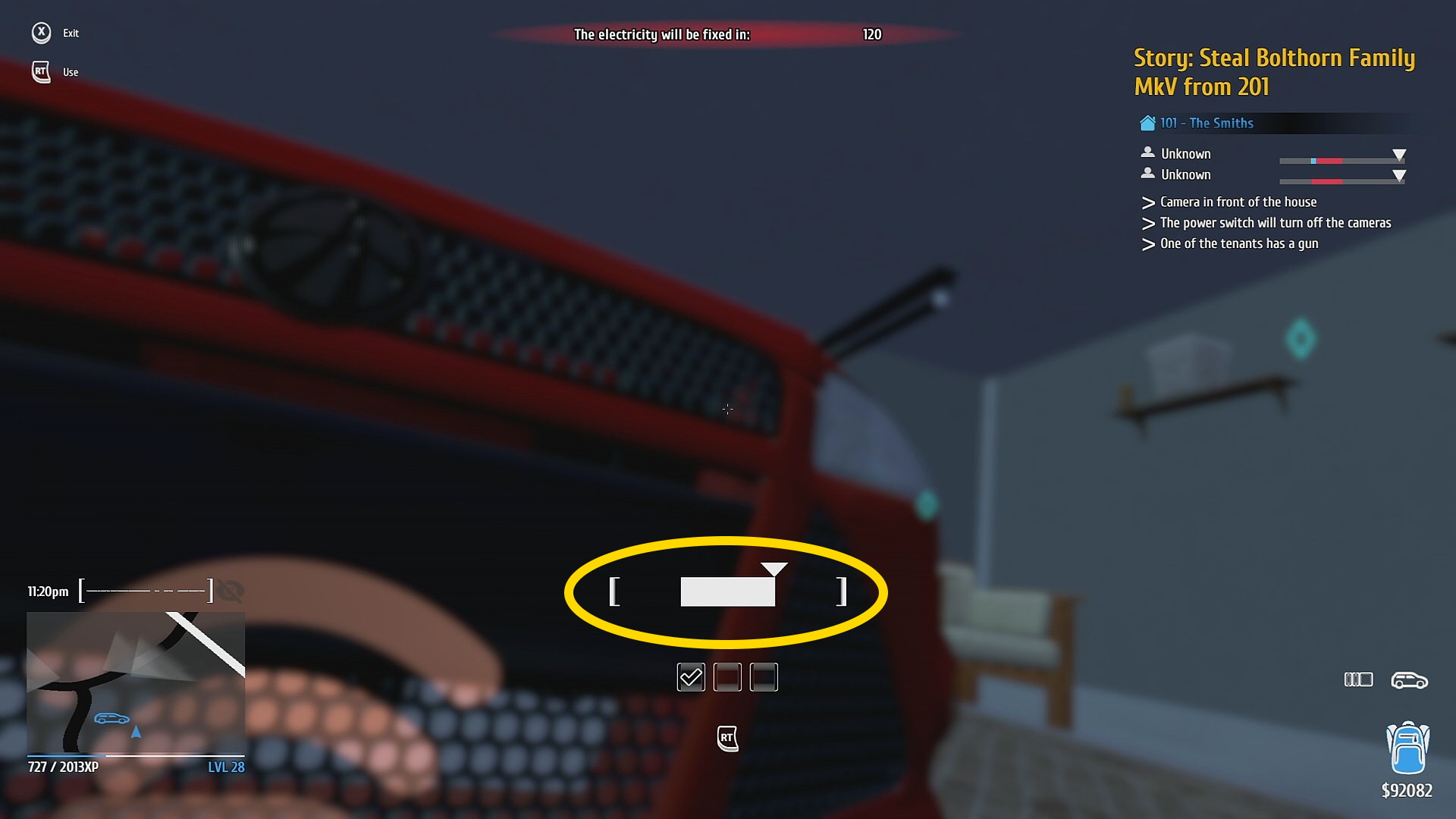 • ガレージに入り、車の前部に行ってセキュリティアラームを解除するミニゲーム開始