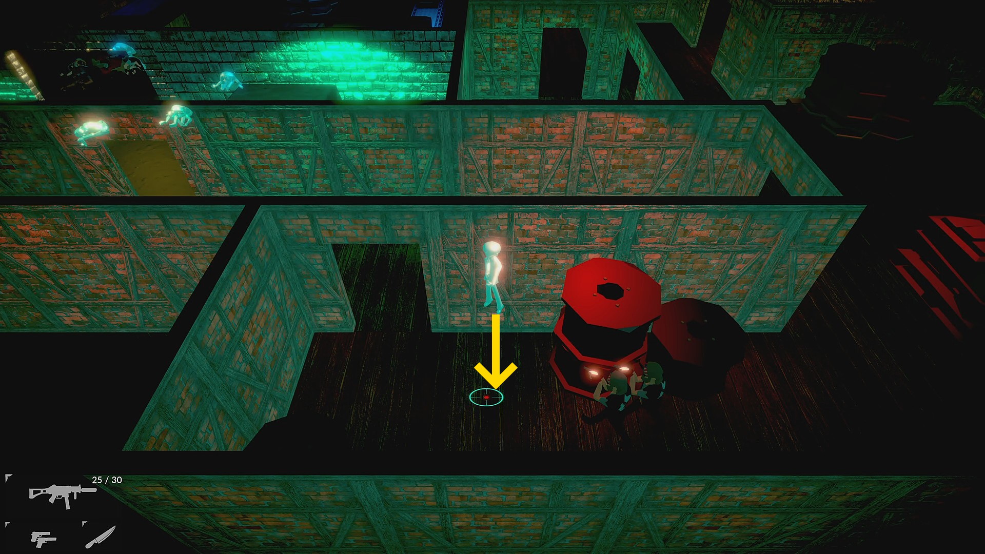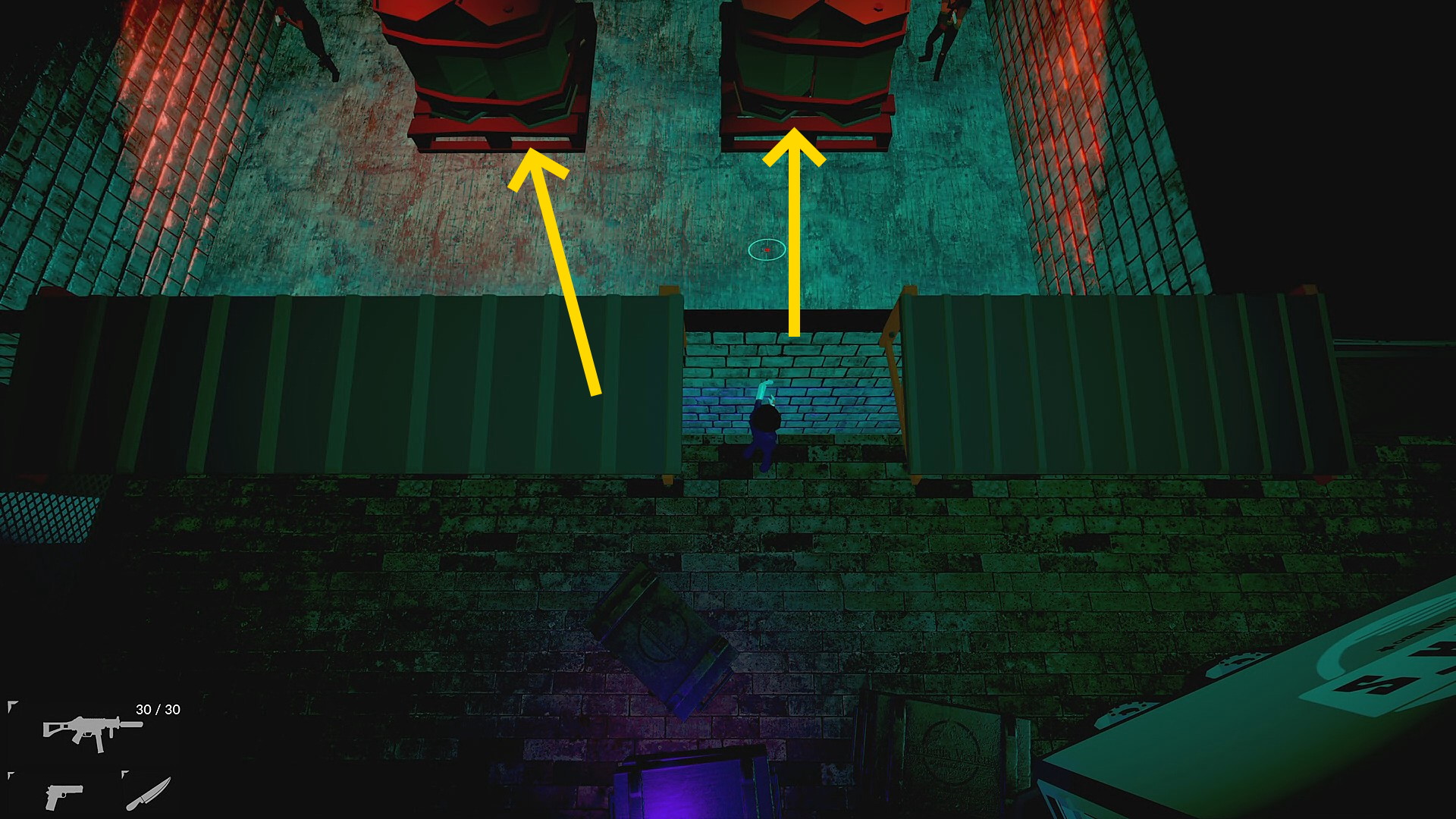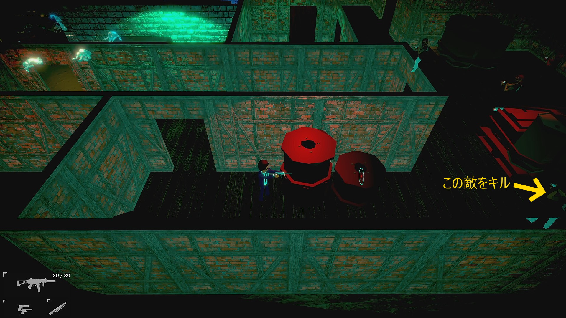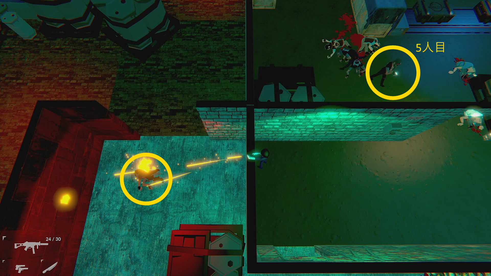 - 一旦、左から回り込んで画面上の通路に進むと上から4人の敵が来るので壁抜きキル